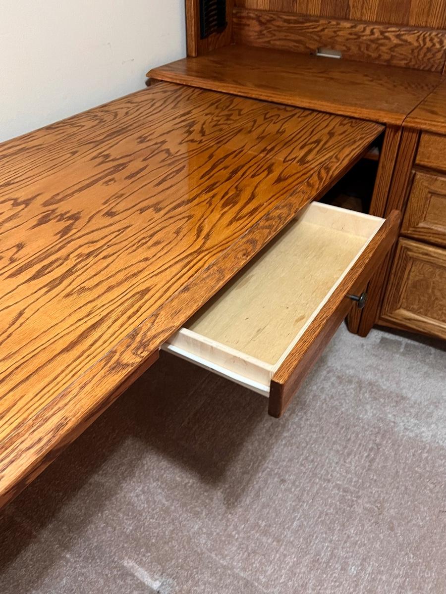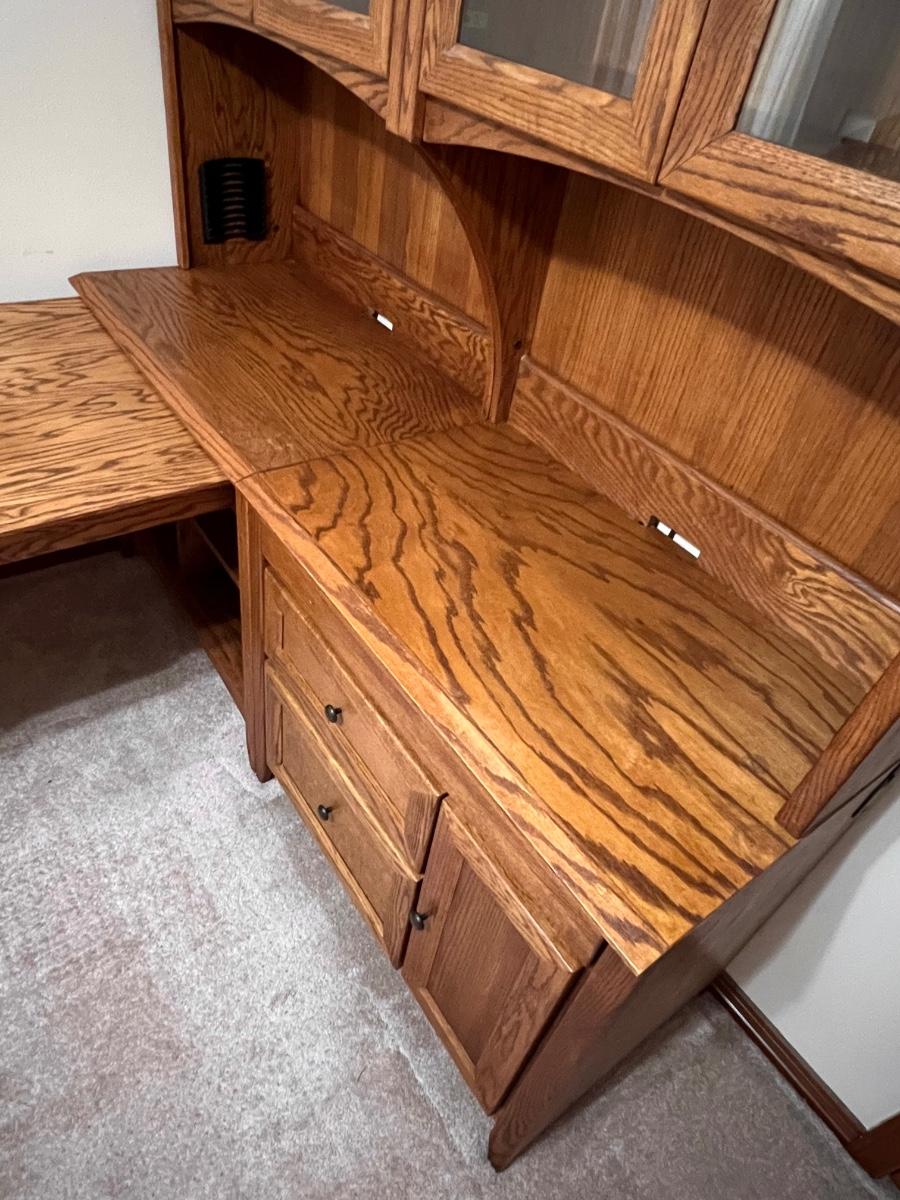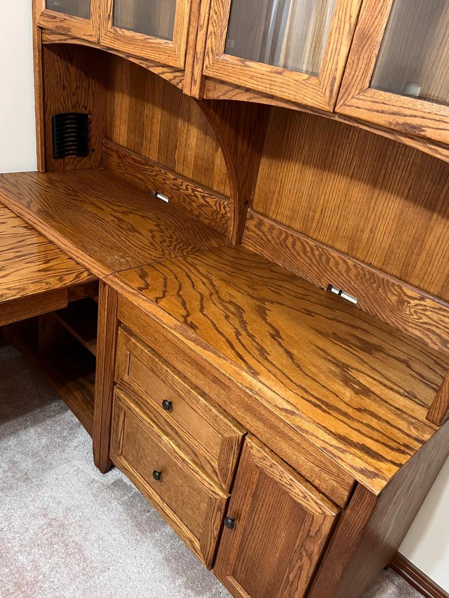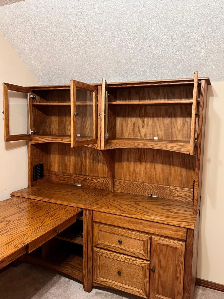 5 pieces ~ Shelving in top cabinets are adjustable ~ Side table top is adjustable, see photos ~ Measurements for the extension table measure from wall to the end of the table ~ The 2 hutches can be used separately as shown in photos, they are approximately 34” W