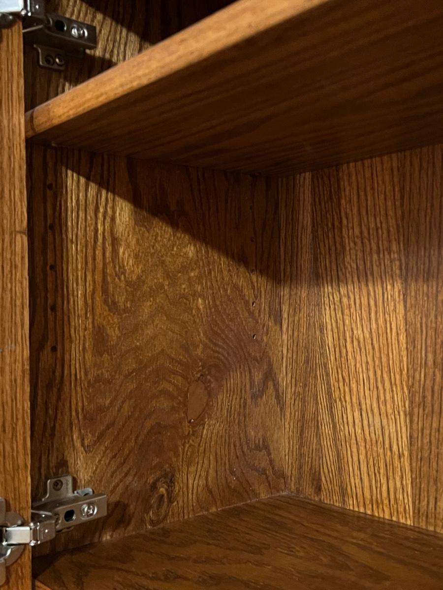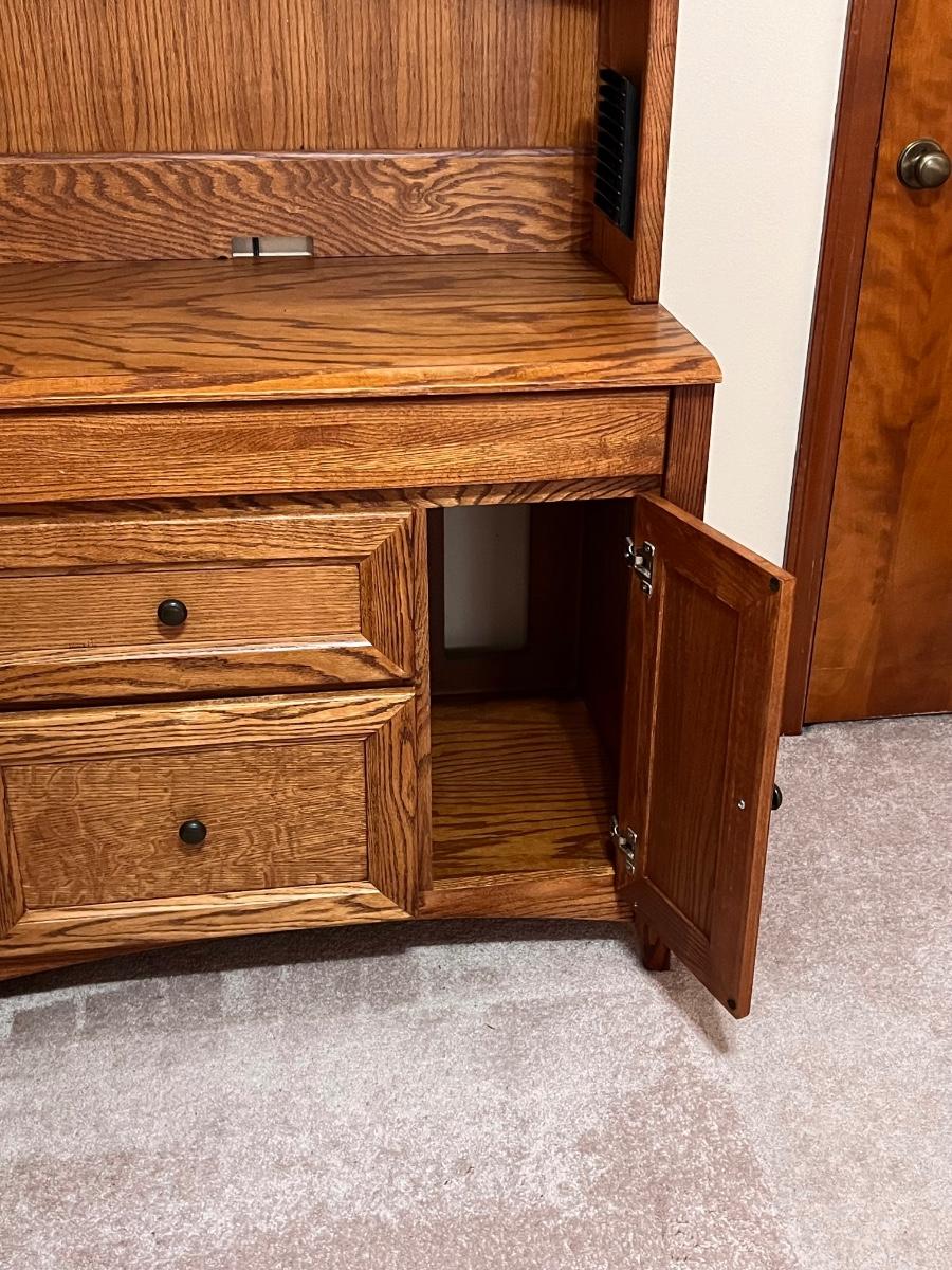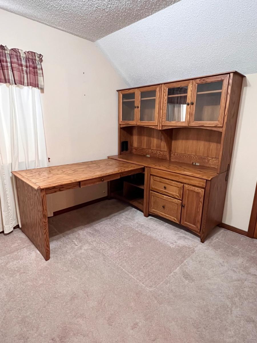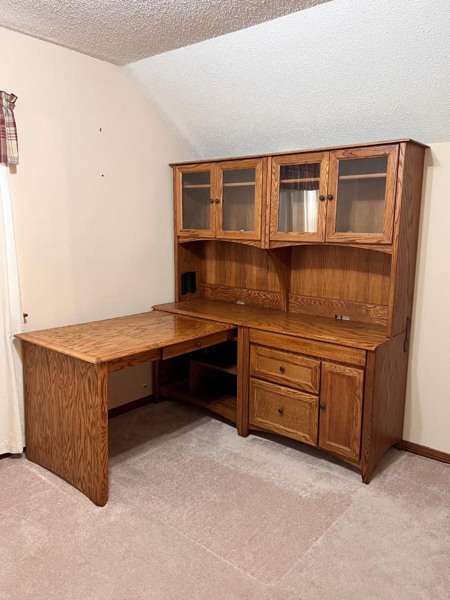 5 pieces ~ Shelving in top cabinets are adjustable ~ Side table top is adjustable, see photos ~ Measurements for the extension table measure from wall to the end of the table ~ The 2 hutches can be used separately as shown in photos, they are approximately 34” W