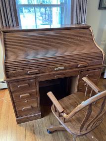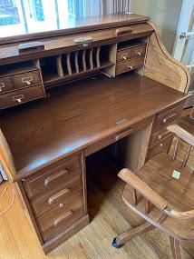 One of a kind solid oak roll top desk - includes chair. Made by Winners Only - in immaculate condition.