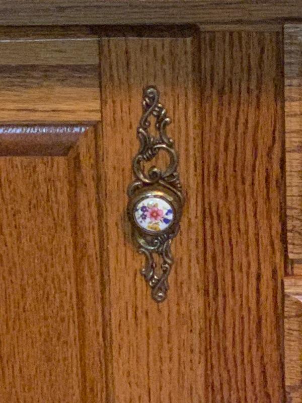 Handles are brass and ceramic