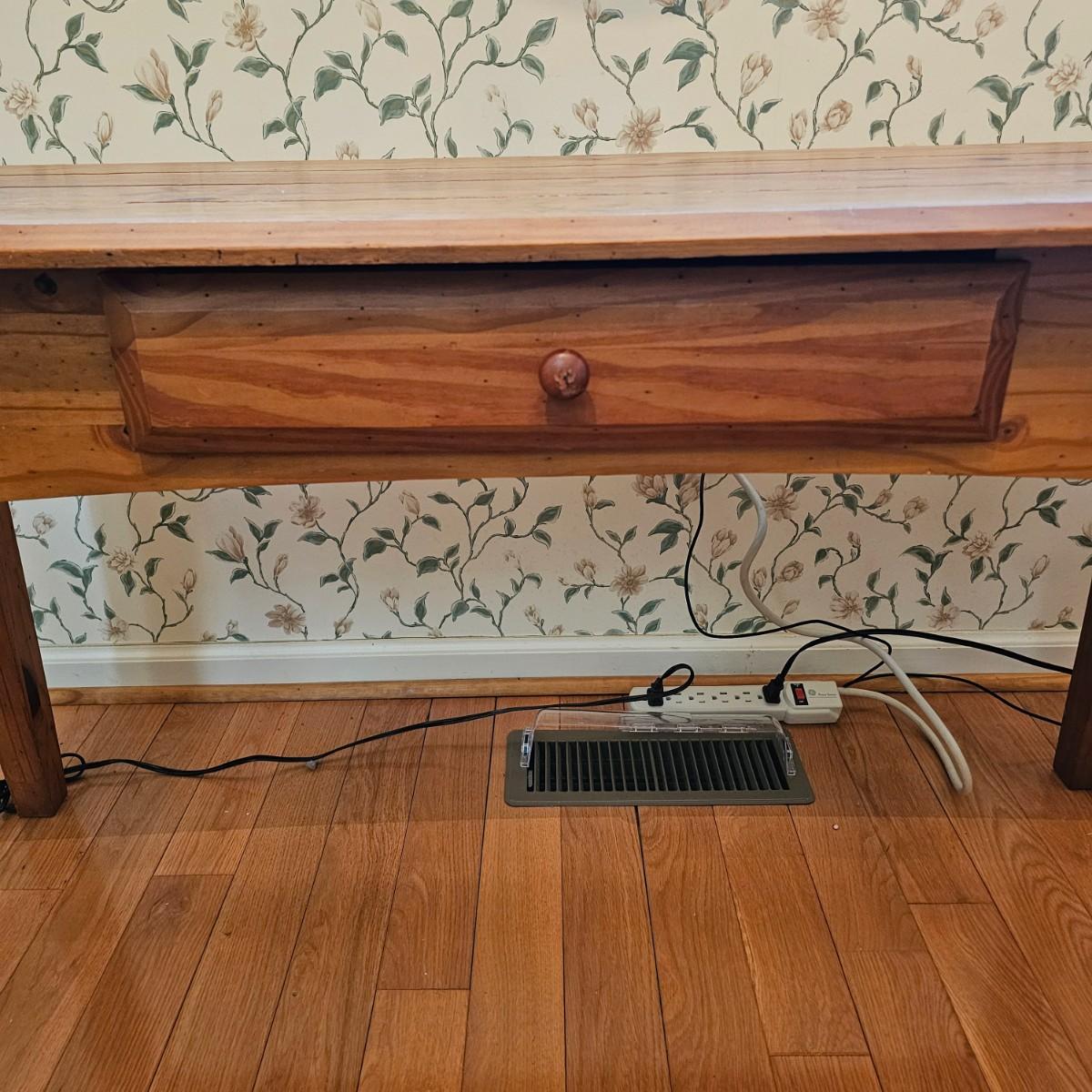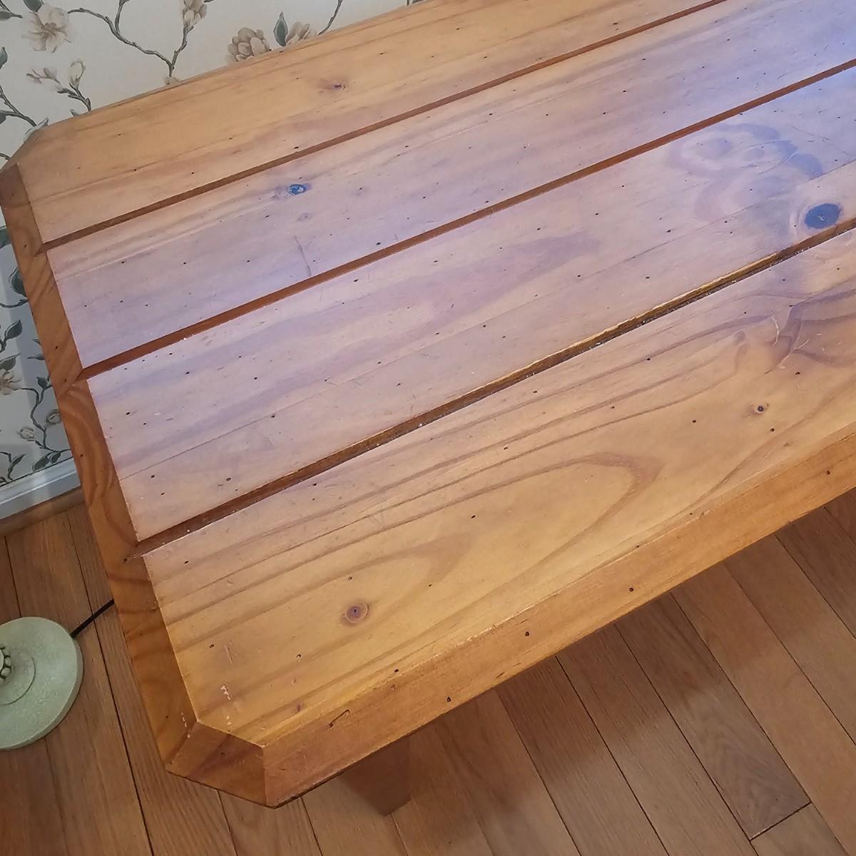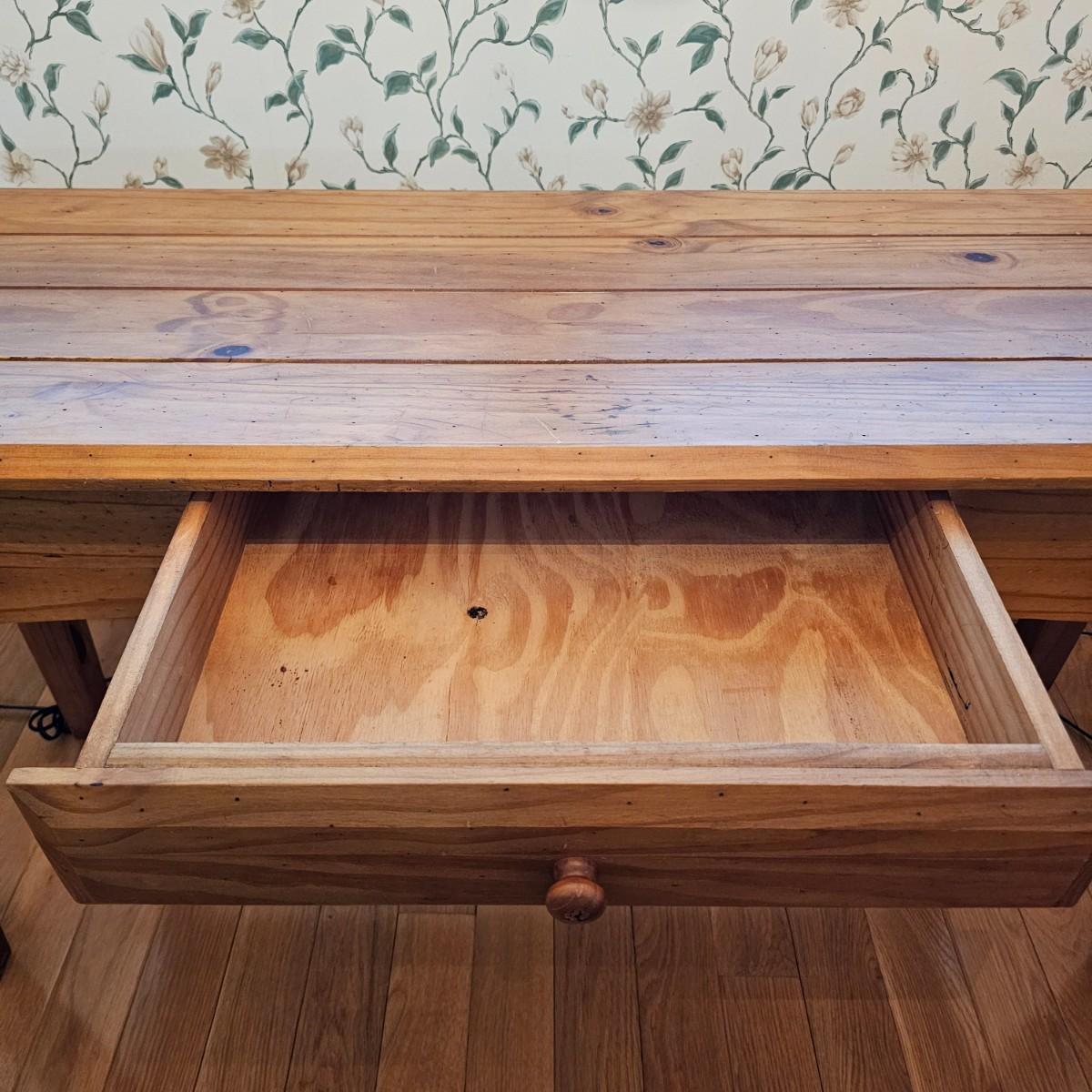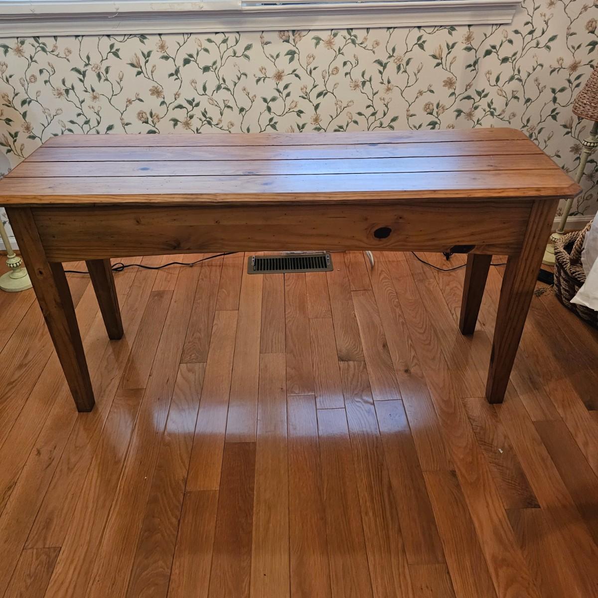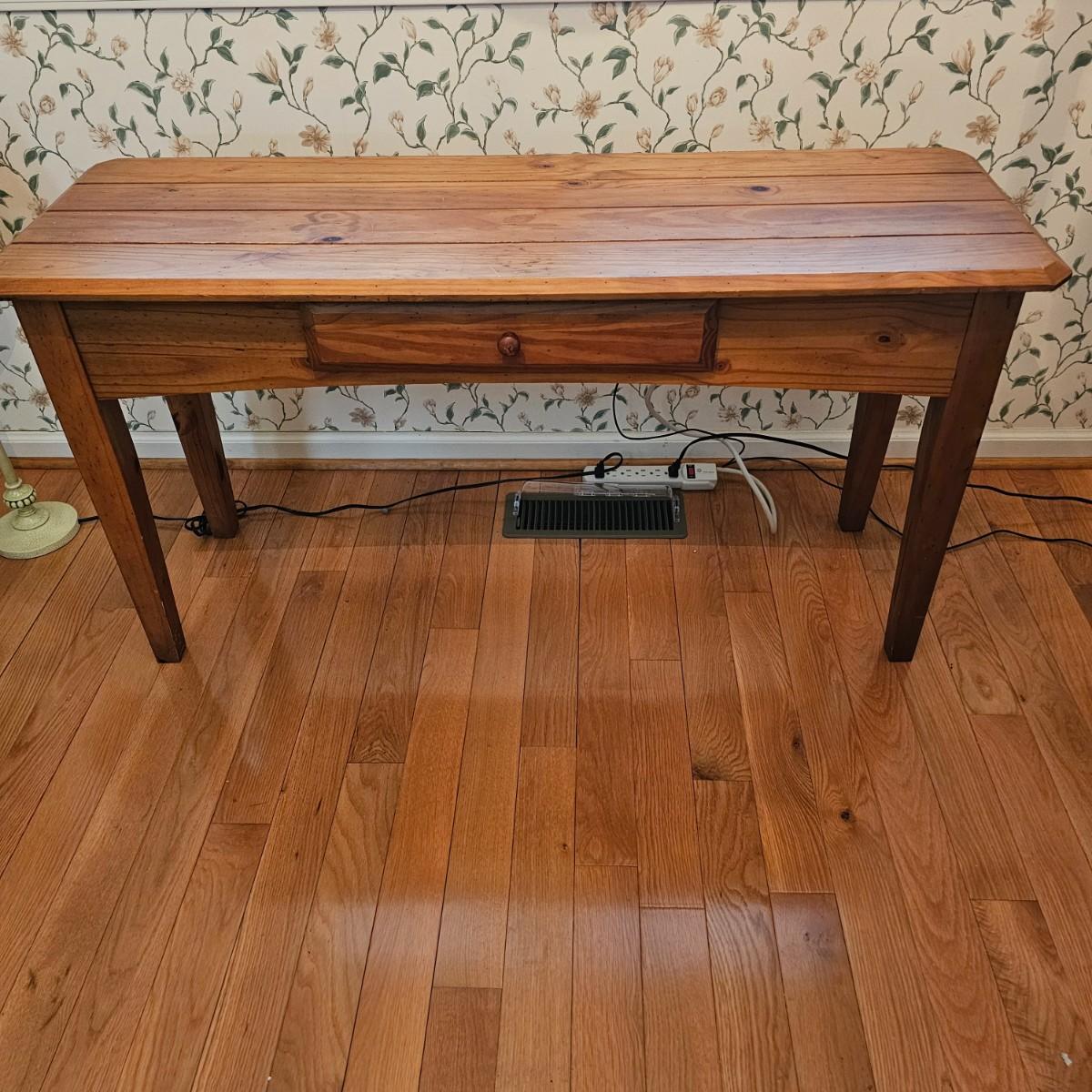 Rustic look pine table with grooved top and beveled edges. Table has single front pull out drawer for storage. Measures 17" x 50" x 26"H. Top and legs have some minor blemishes. See photos for details. Local pickup only.