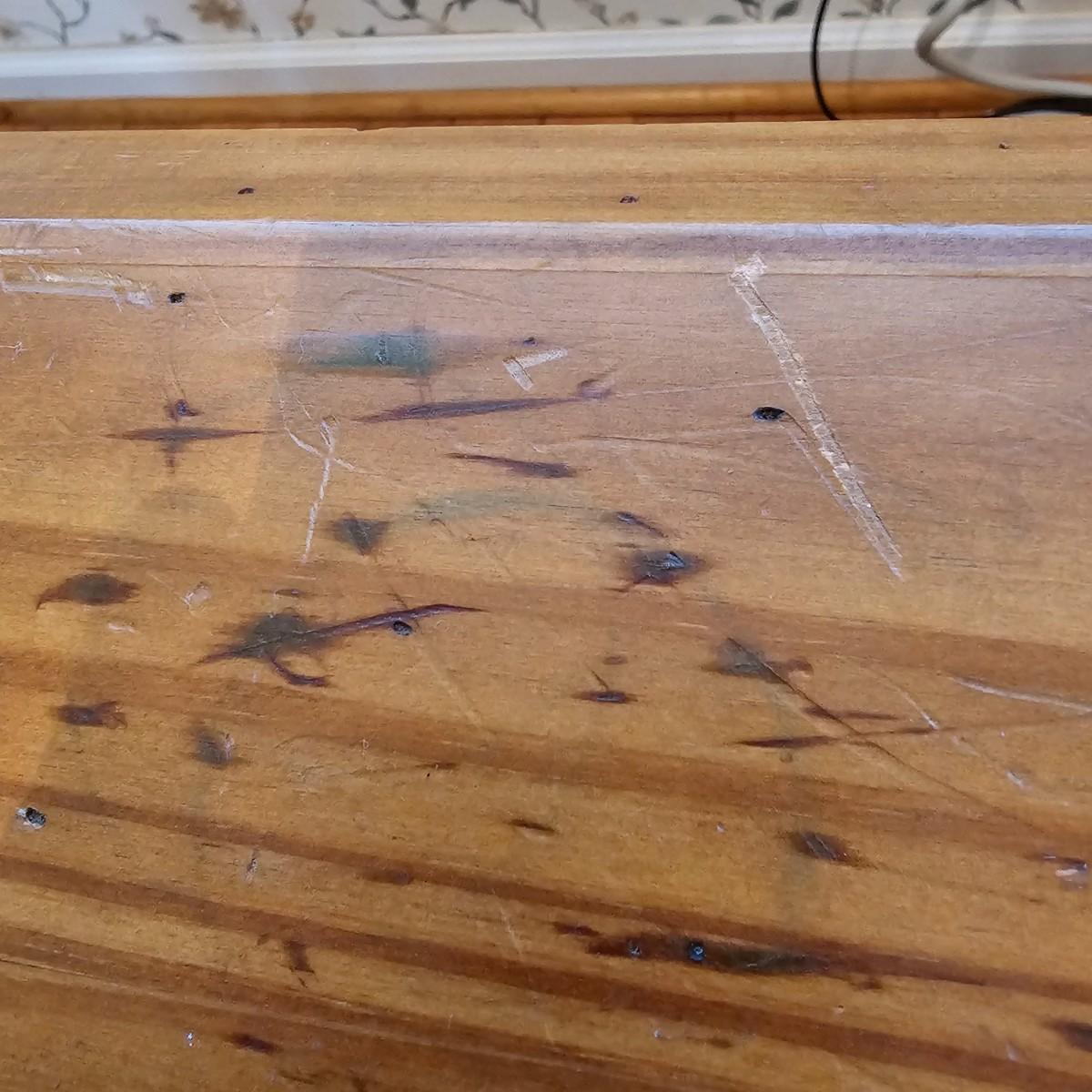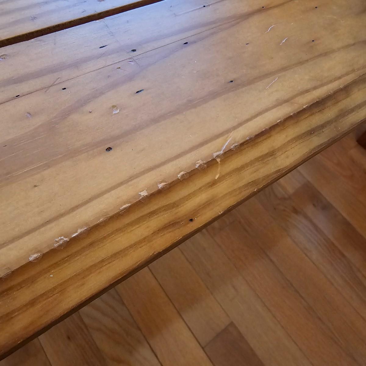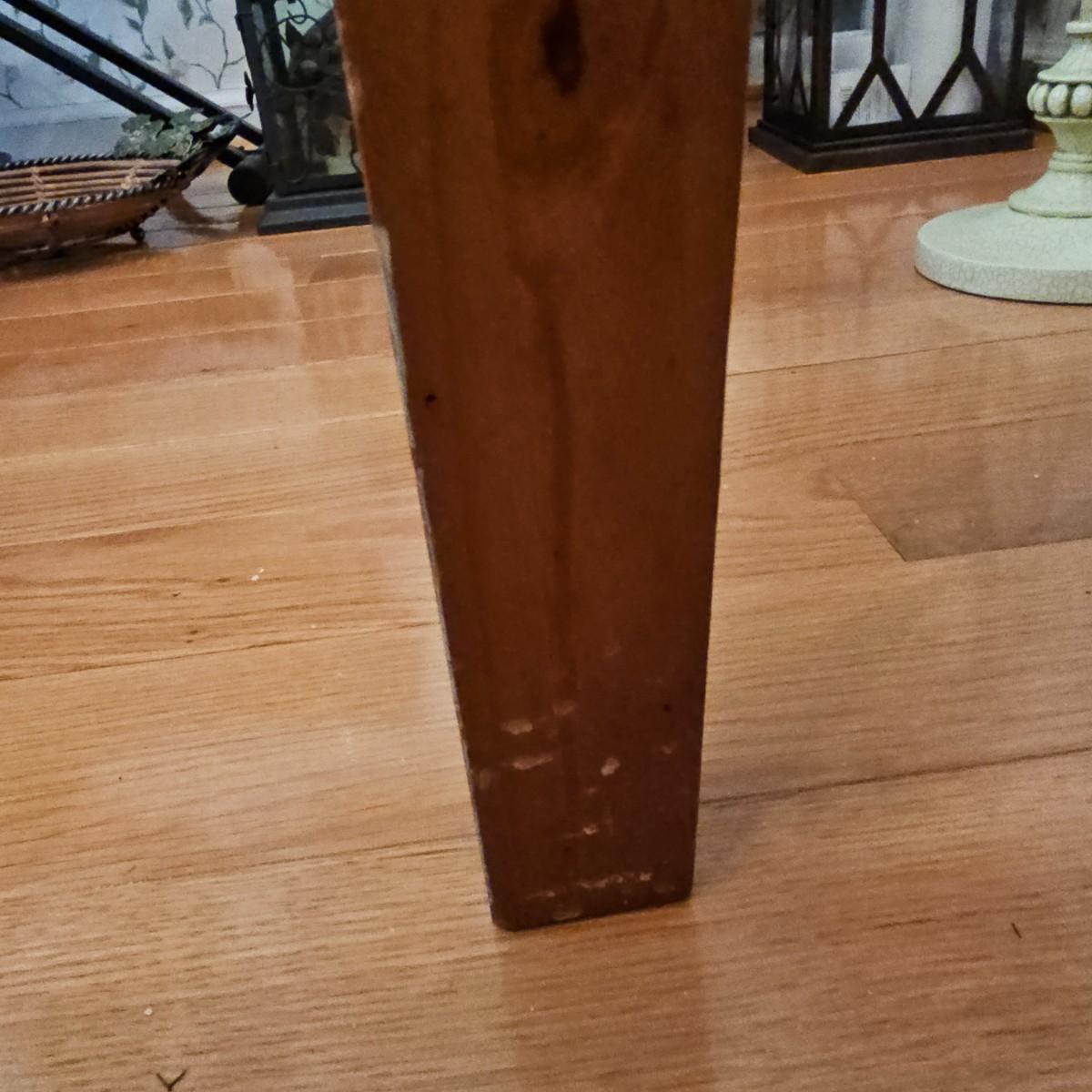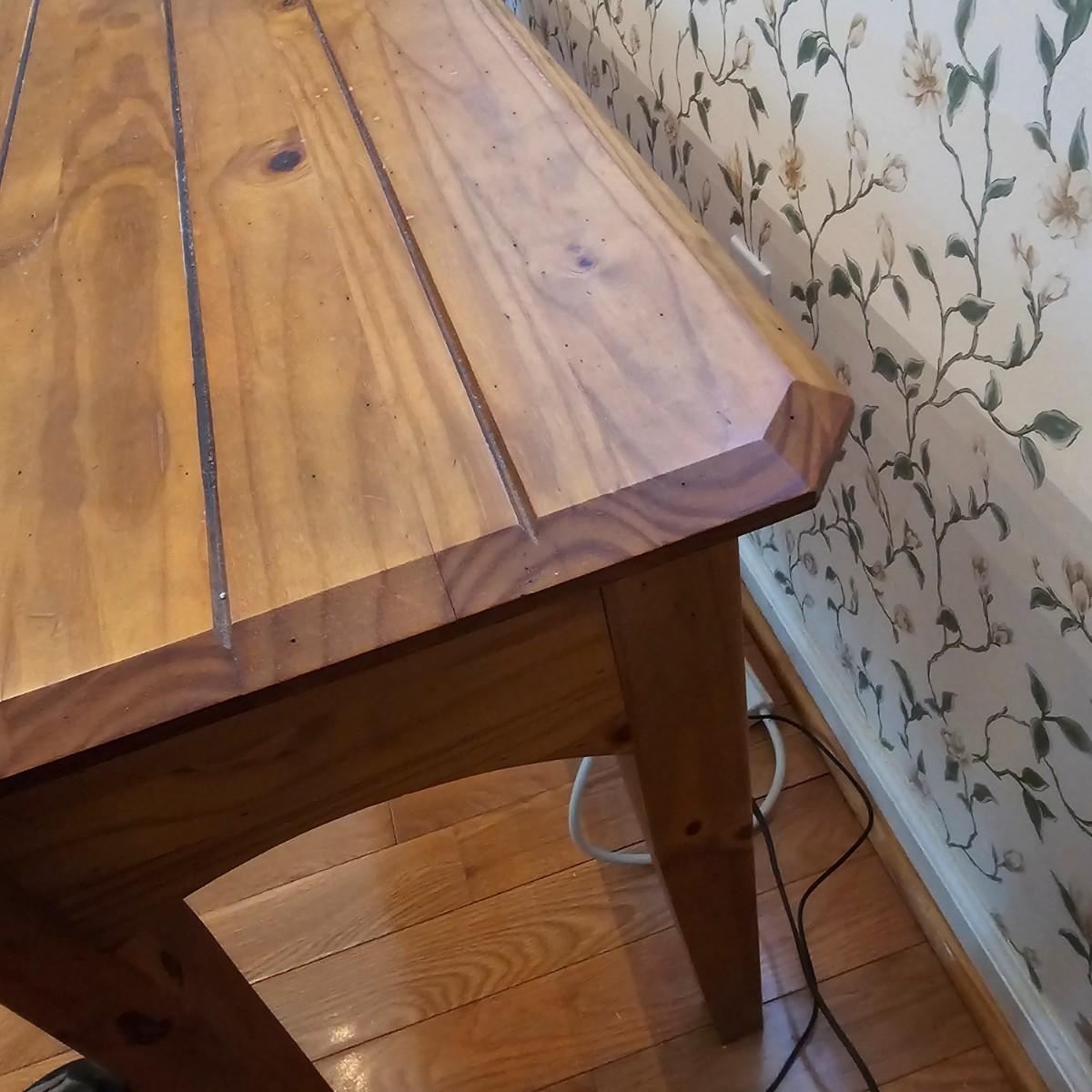 Rustic look pine table with grooved top and beveled edges. Table has single front pull out drawer for storage. Measures 17" x 50" x 26"H. Top and legs have some minor blemishes. See photos for details. Local pickup only.