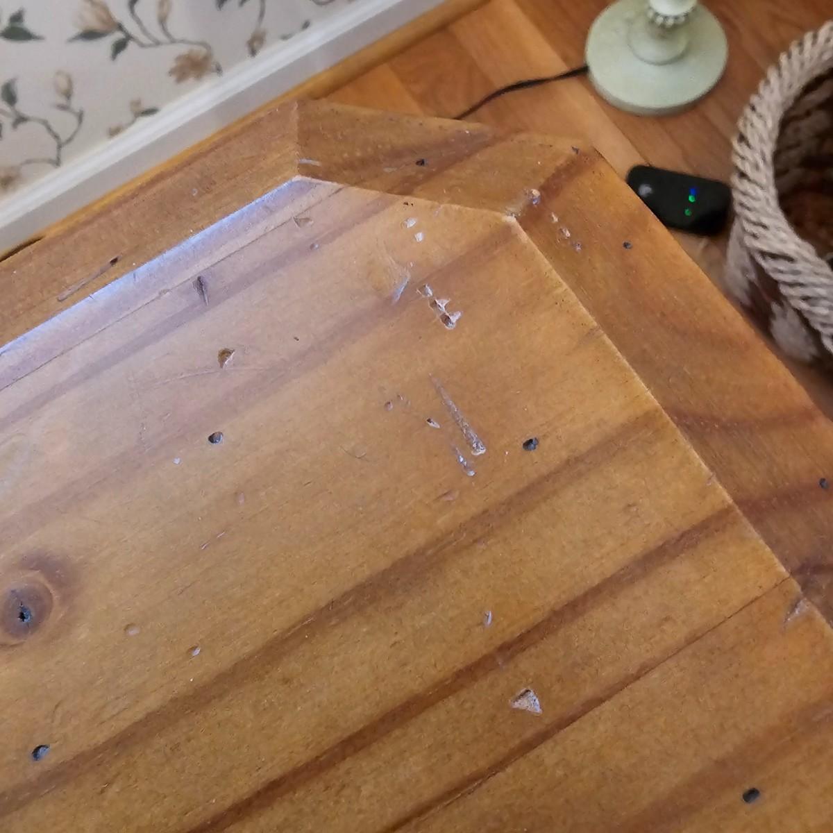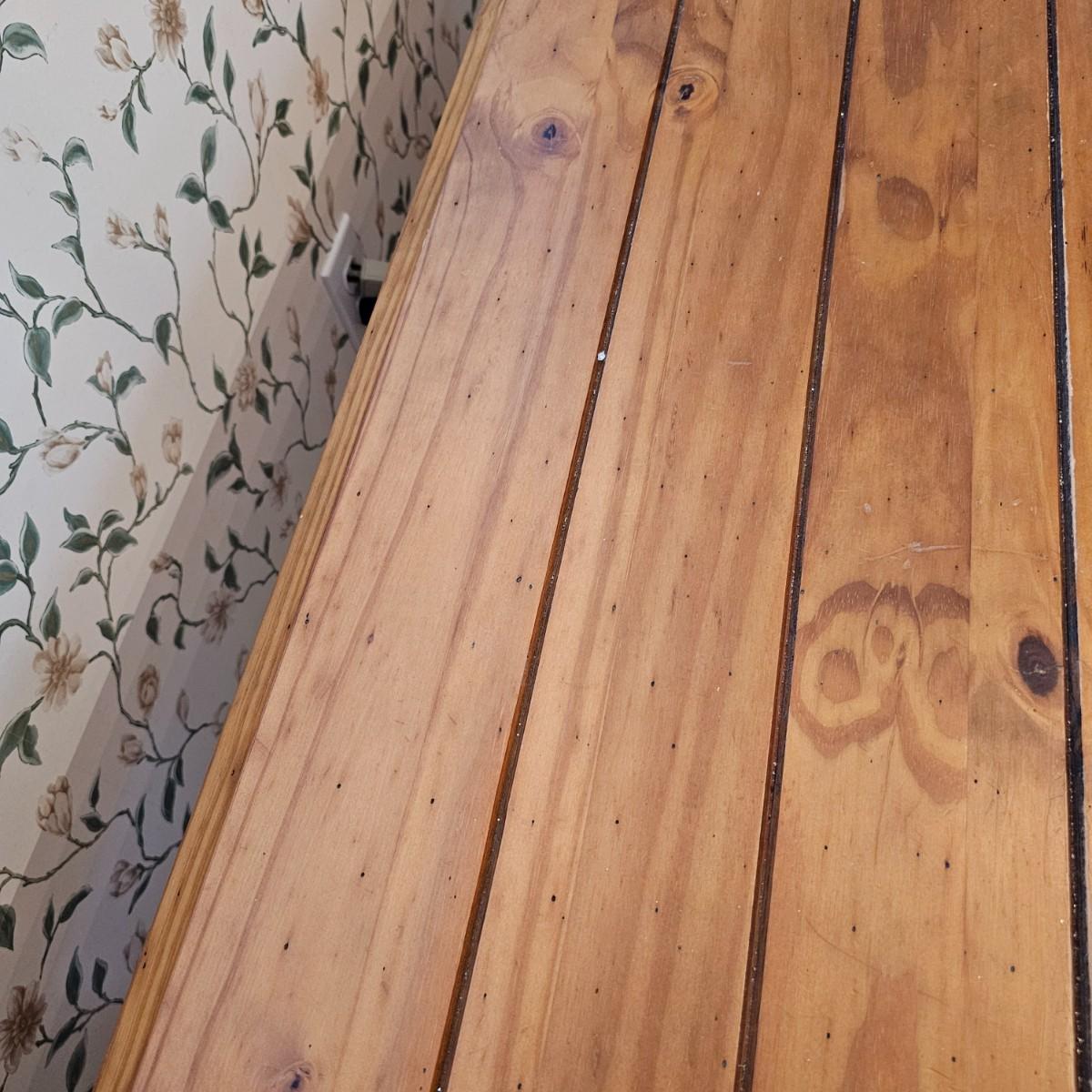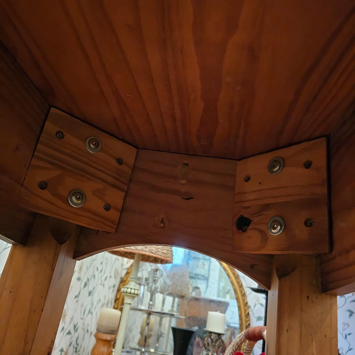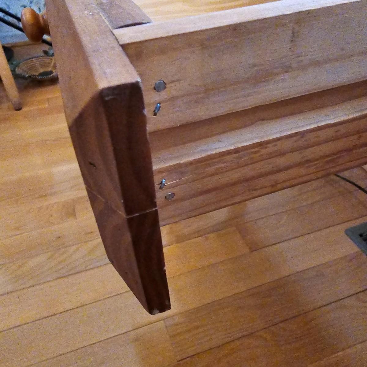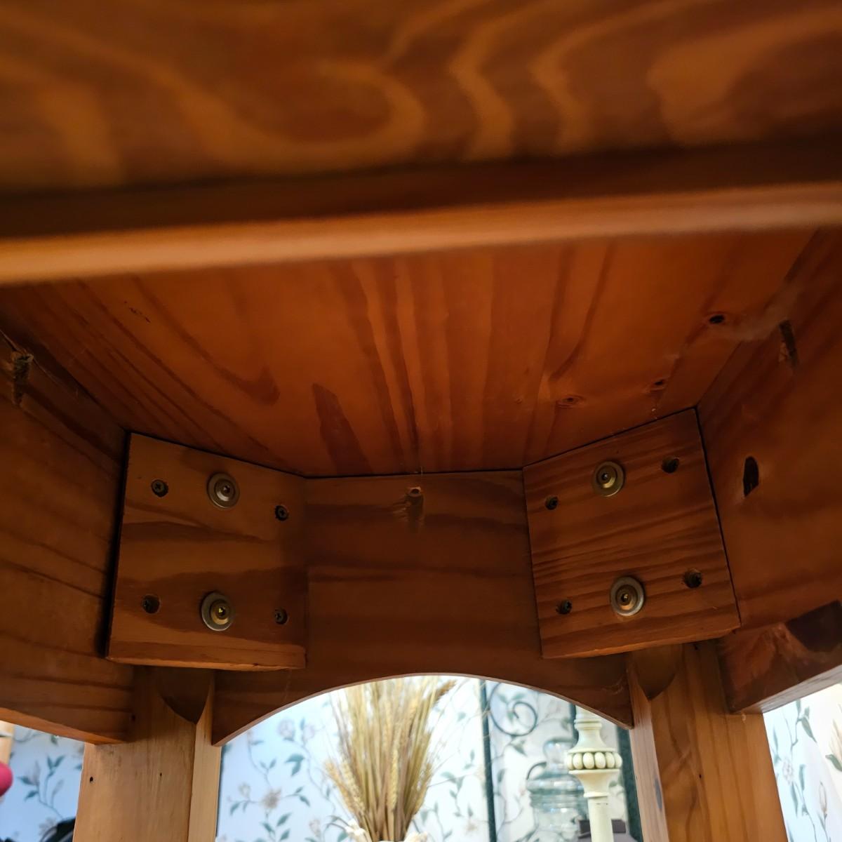 Rustic look pine table with grooved top and beveled edges. Table has single front pull out drawer for storage. Measures 17" x 50" x 26"H. Top and legs have some minor blemishes. See photos for details. Local pickup only.