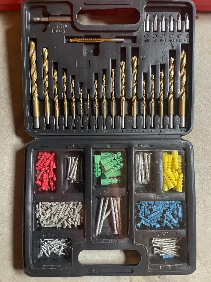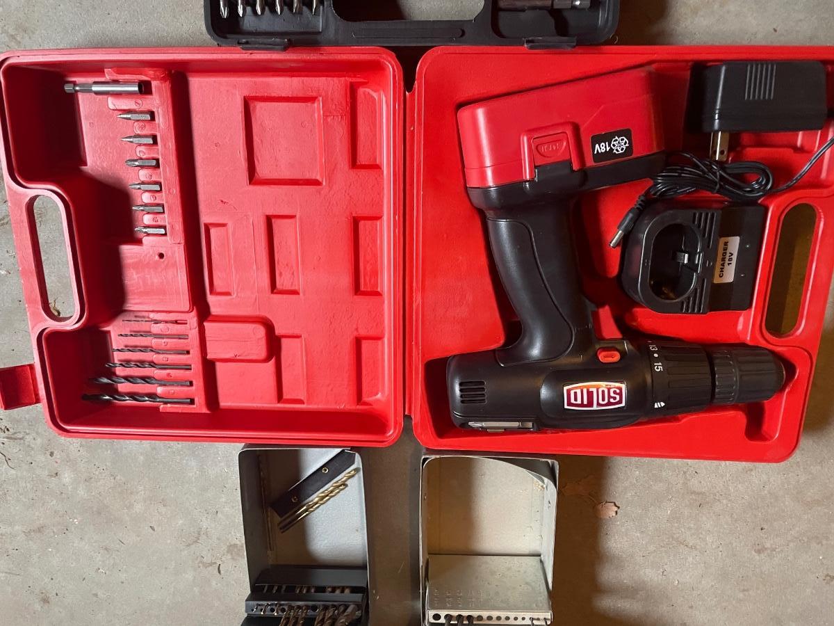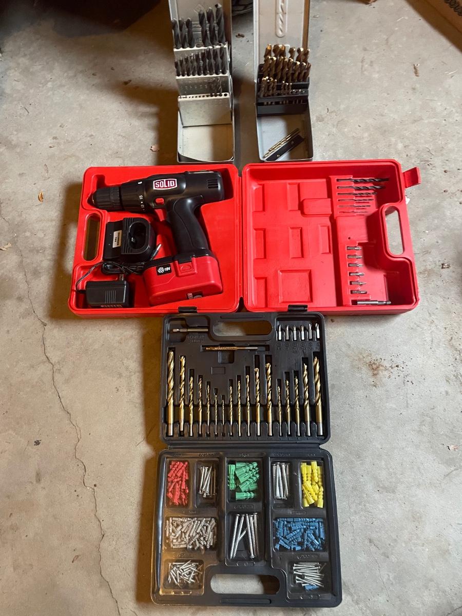 Charged and it works just fine. Includes a black bit case And two metal cases with bits in them.