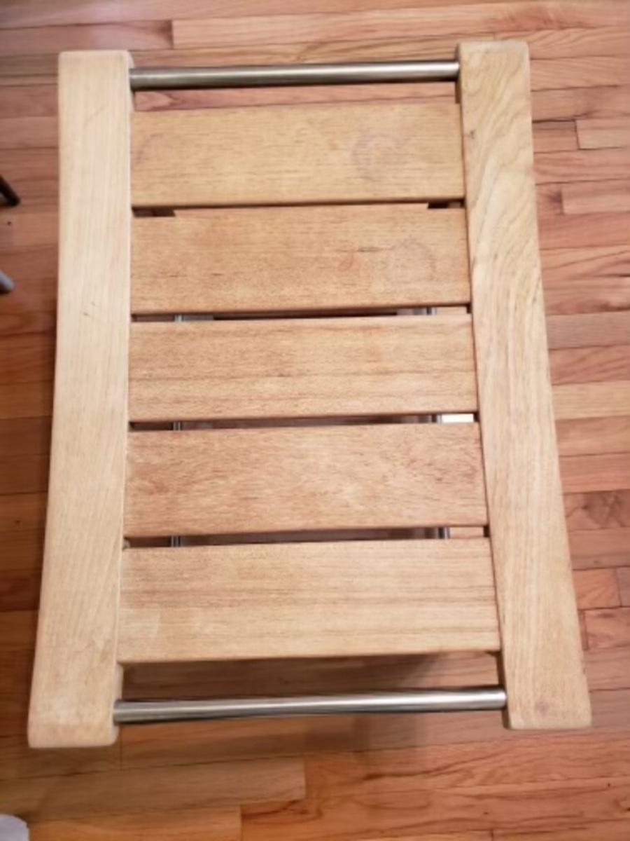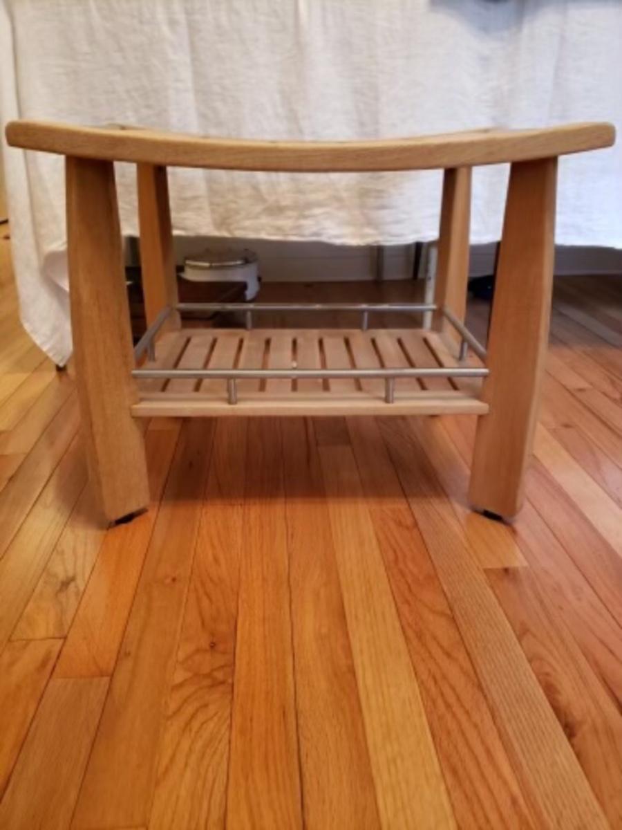 Solid teak bath stool with shelf and metal accents from Ballard Designs. 24"W x 17"D x 19"H. Good condition.