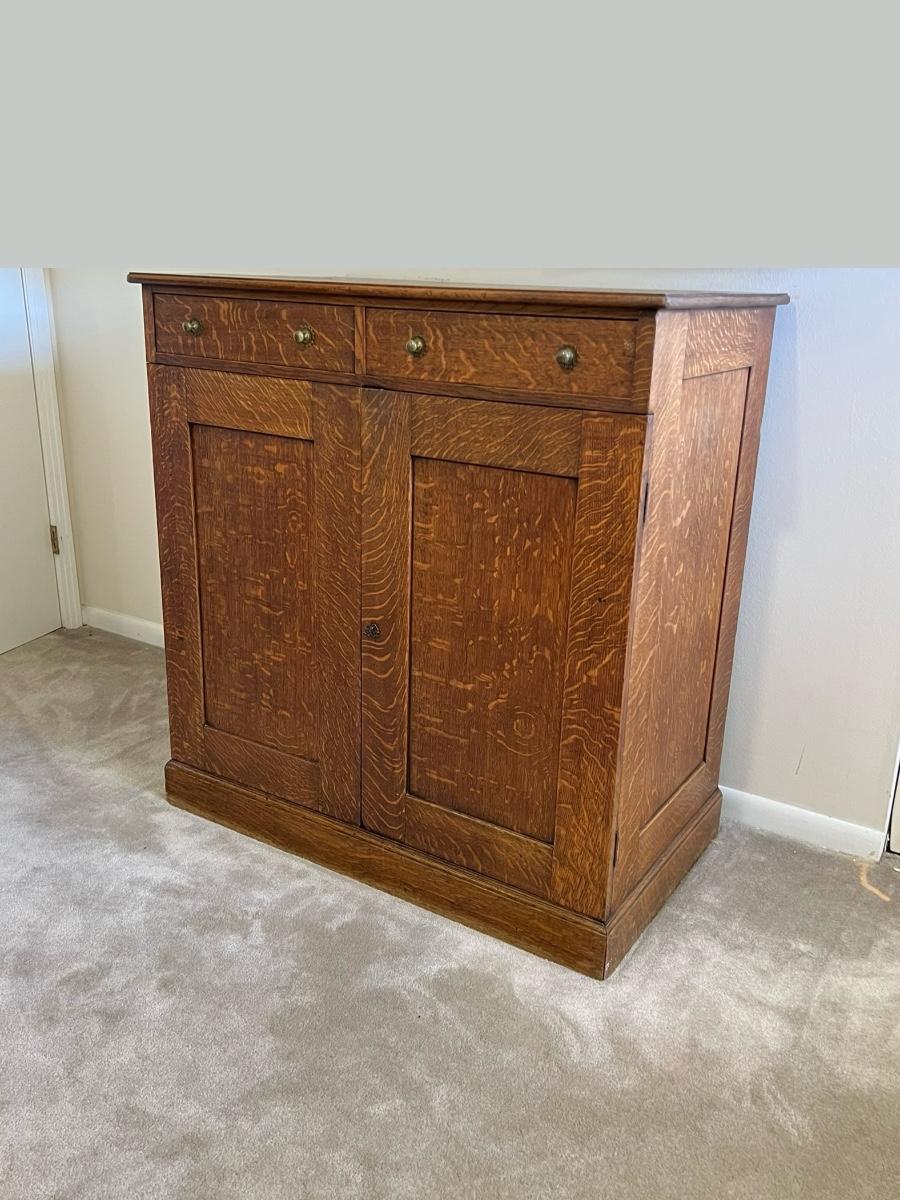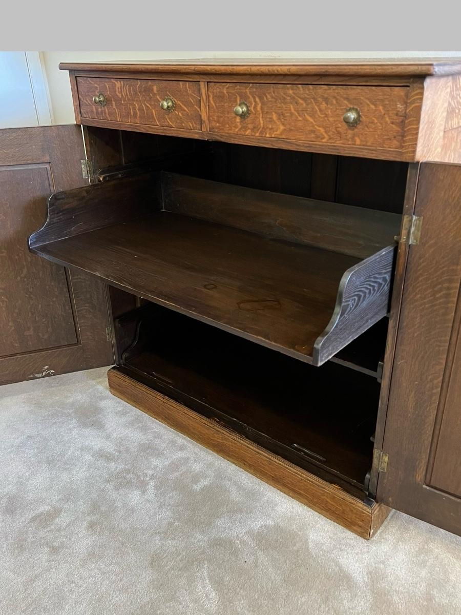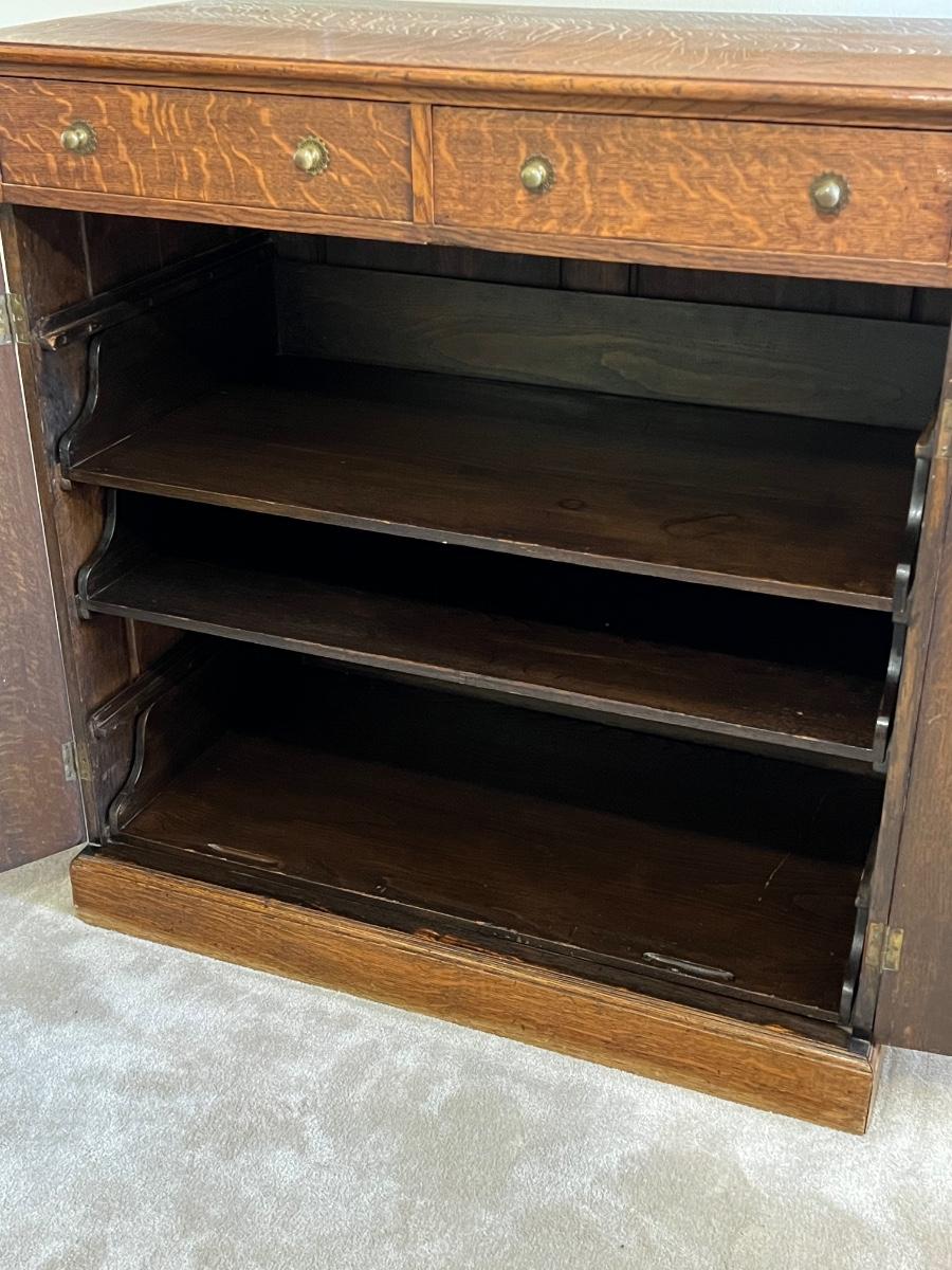 3 shelving units in the cabinet slide out, height can not be adjusted ~ Drawers slide easy ~ No brand ~ Has key, but does not lock ~ Has 2” hole cut in the back, see photos ~ 46” H x 44” W x 25” D
