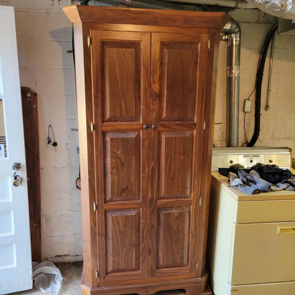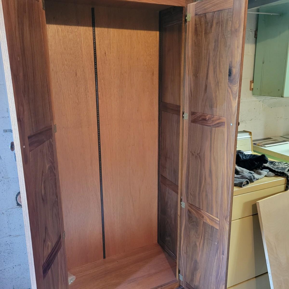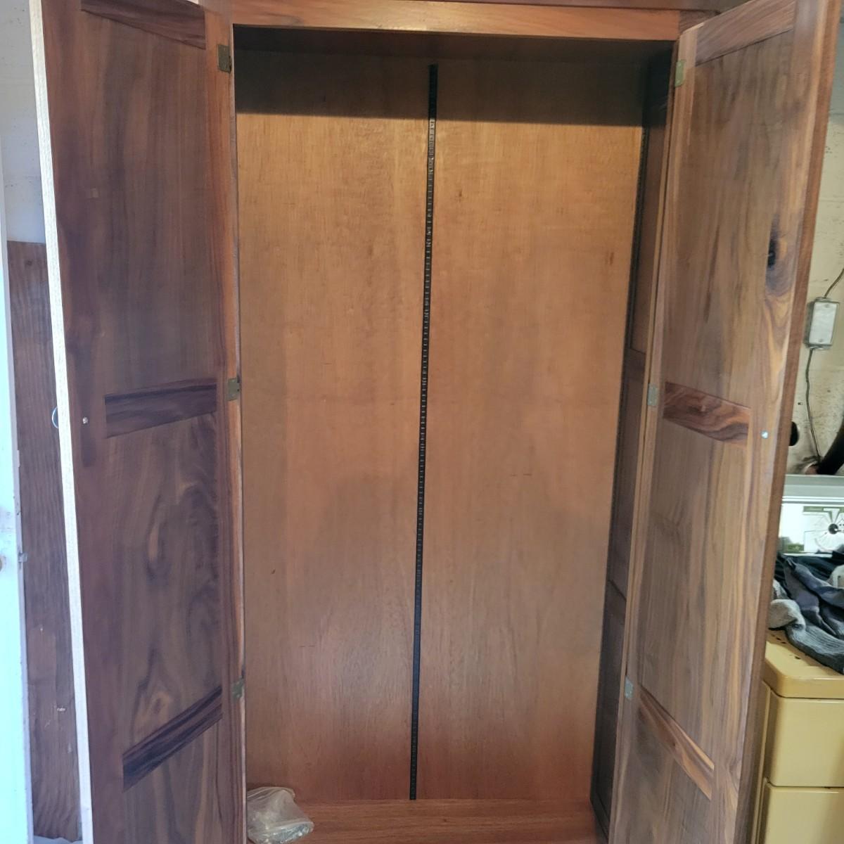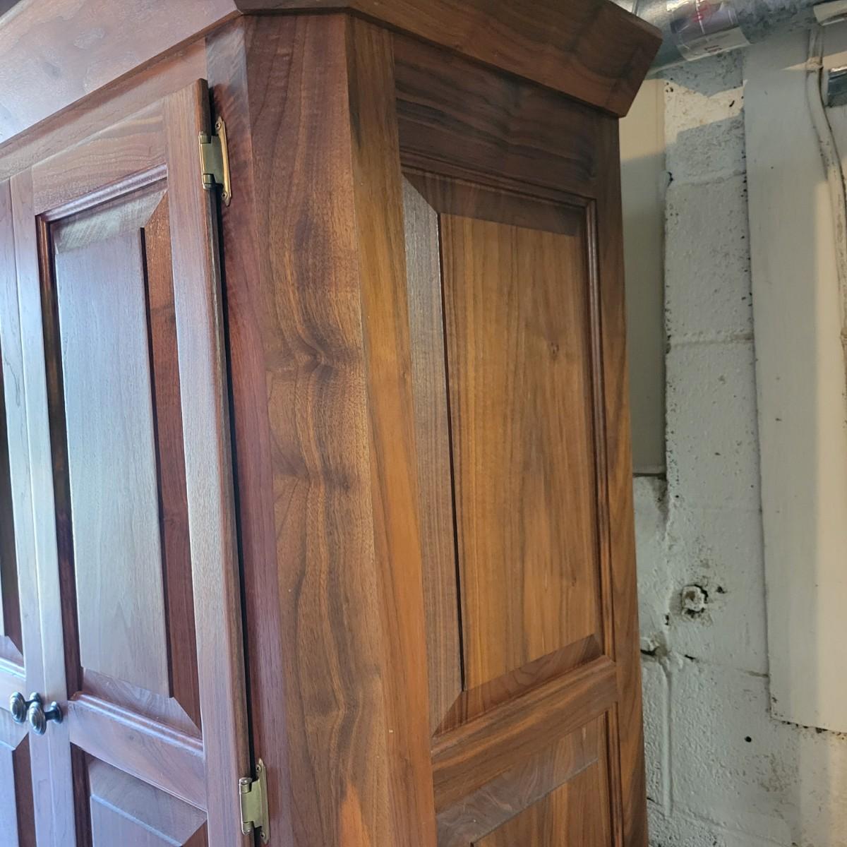 A solid wood armoire that comes with seven adjustable shelves. The armoire appears to be constructed of solid walnut and the shelves appear to be made of cabinet grade maple ply with a walnut strip in the facing. It measures approximately 40" x 20" x 78.5"H and includes shelving hardware. Local pickup only. Winning bidder must bring assistance to help move and load this item due to its weight and/or size.