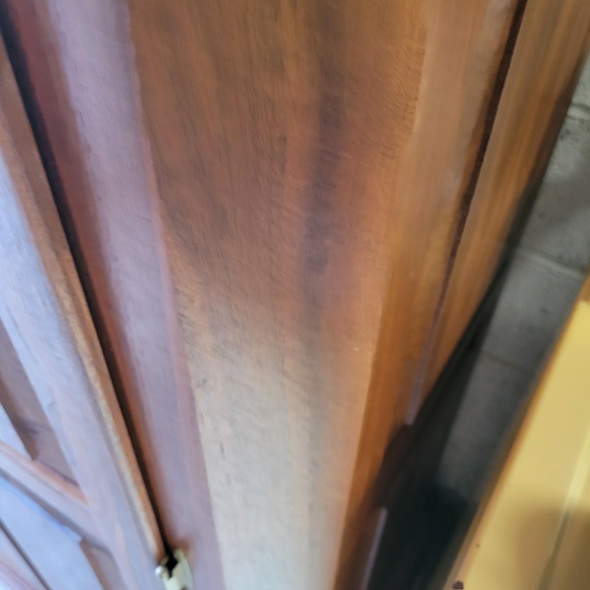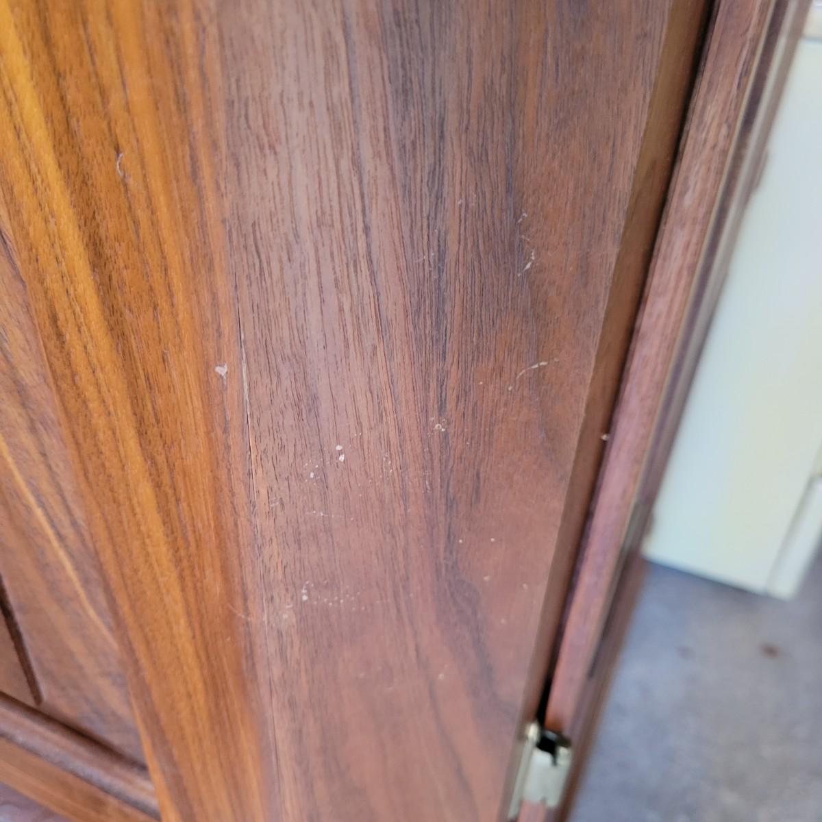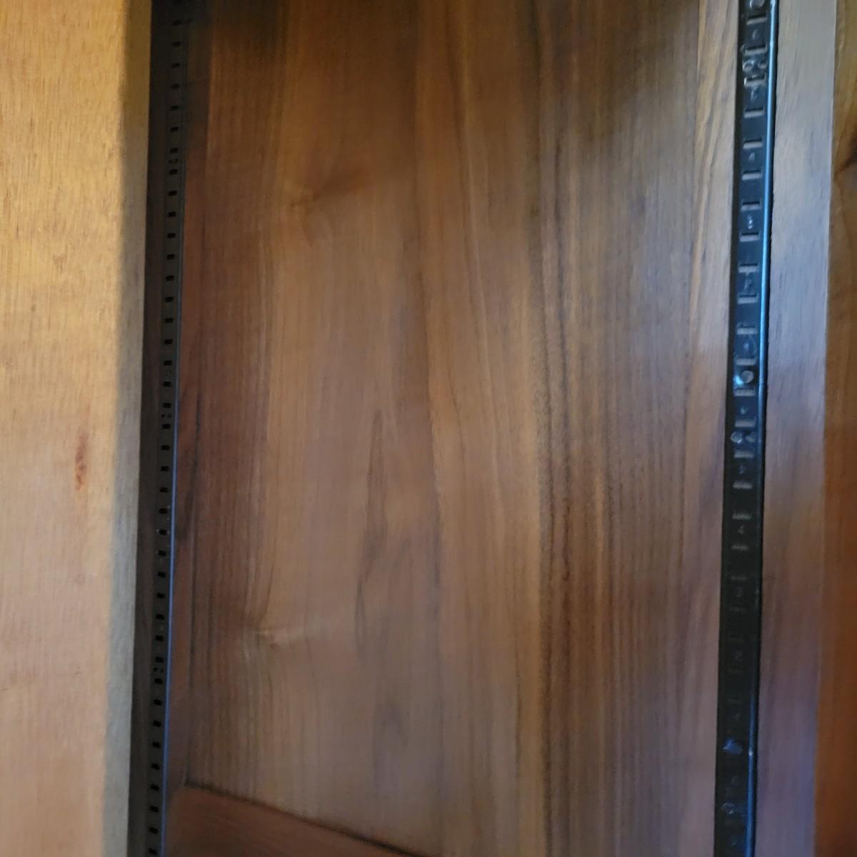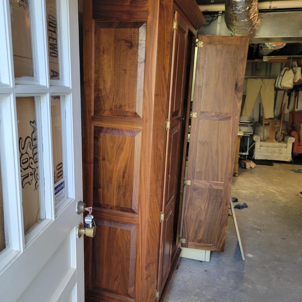 A solid wood armoire that comes with seven adjustable shelves. The armoire appears to be constructed of solid walnut and the shelves appear to be made of cabinet grade maple ply with a walnut strip in the facing. It measures approximately 40" x 20" x 78.5"H and includes shelving hardware. Local pickup only. Winning bidder must bring assistance to help move and load this item due to its weight and/or size.