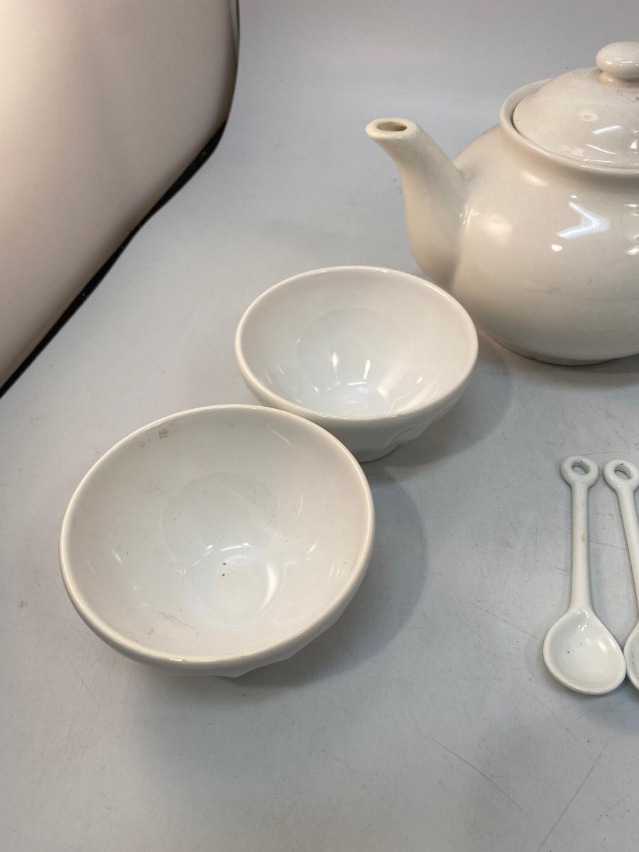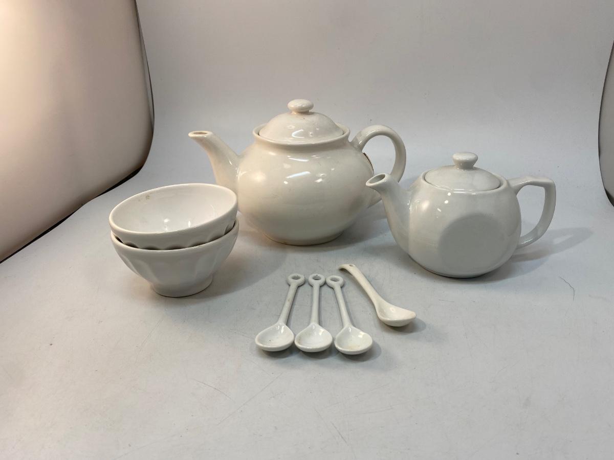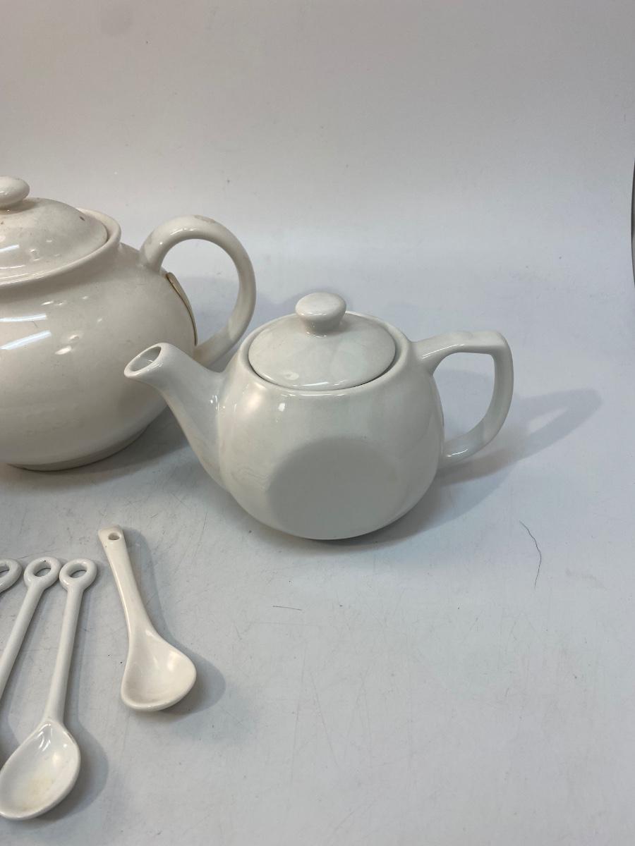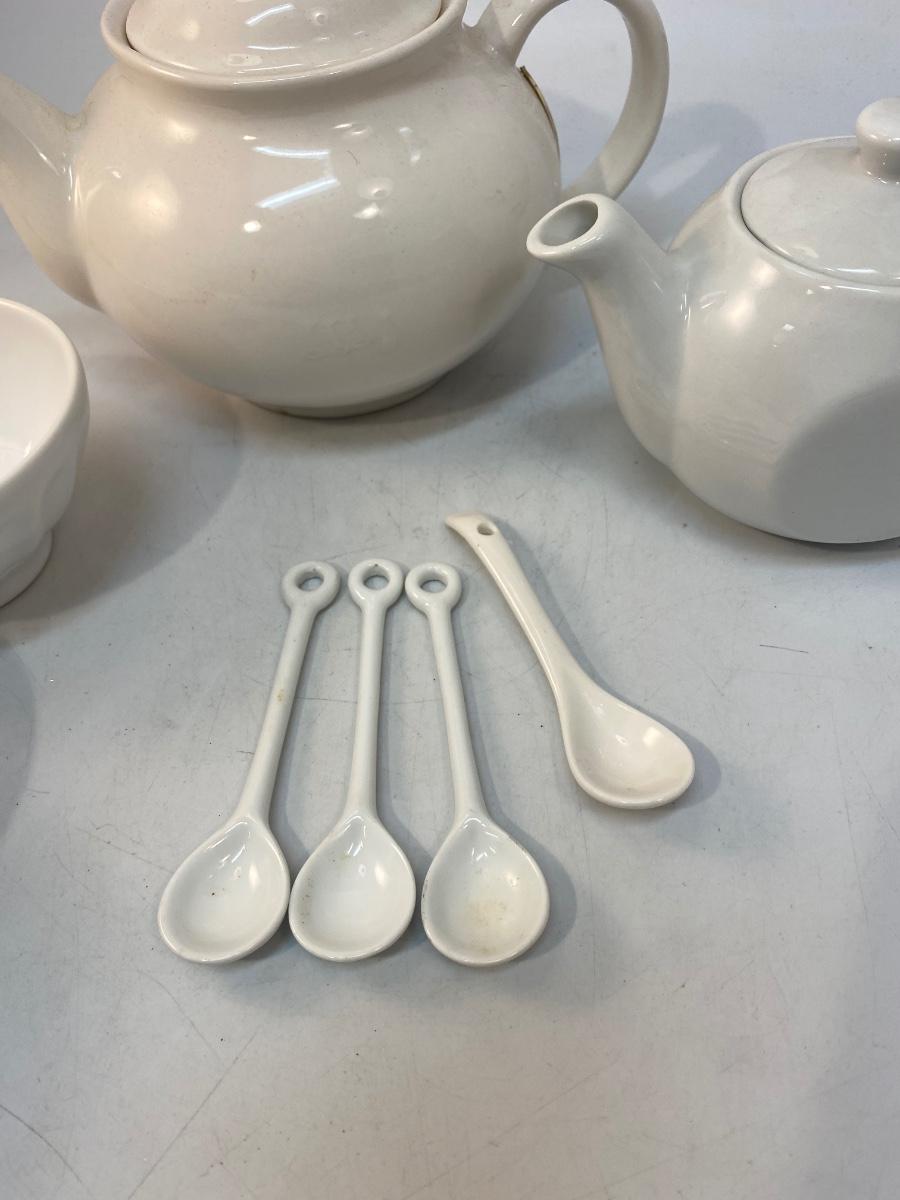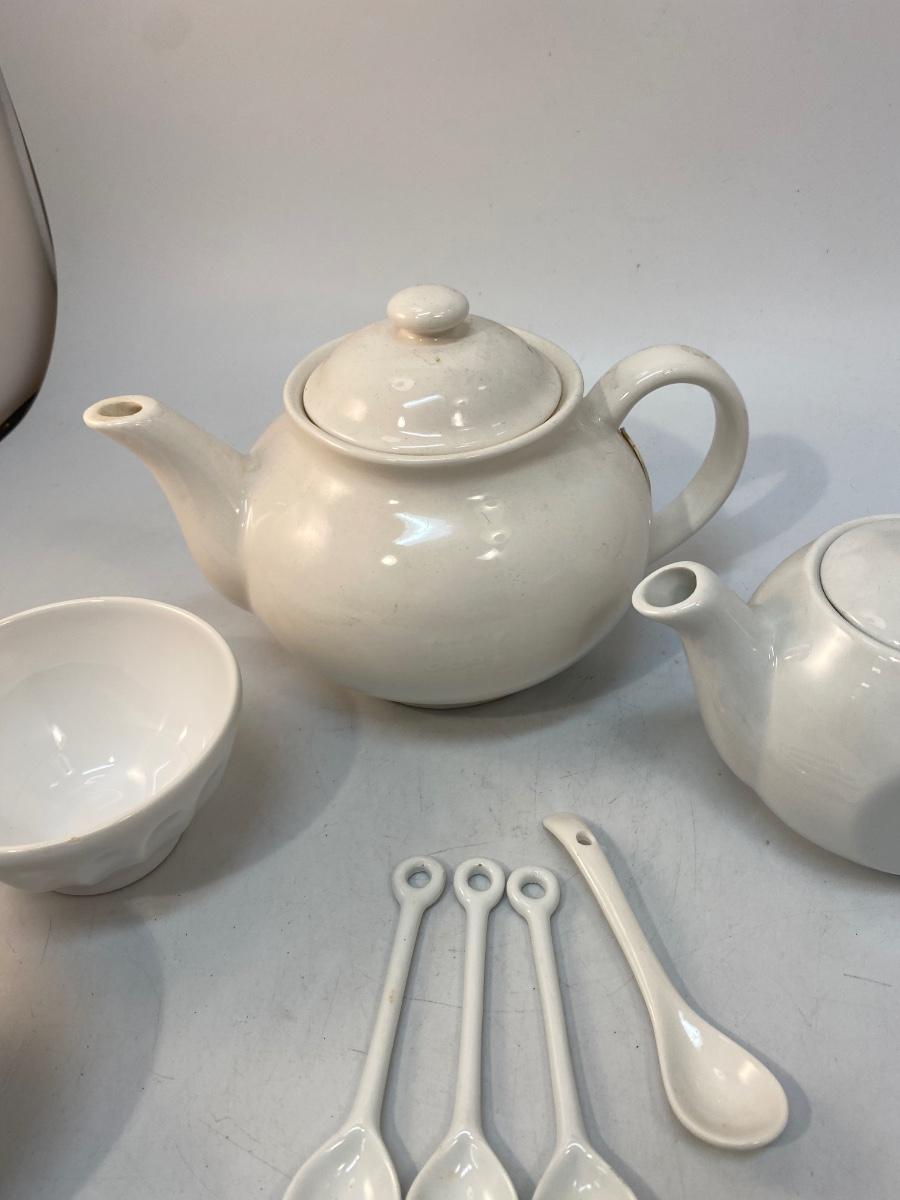 Solid White Kitchen Ceramics Teapots Small Bowls Sugar Spoons. Everything in good condition.