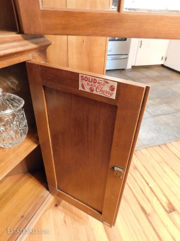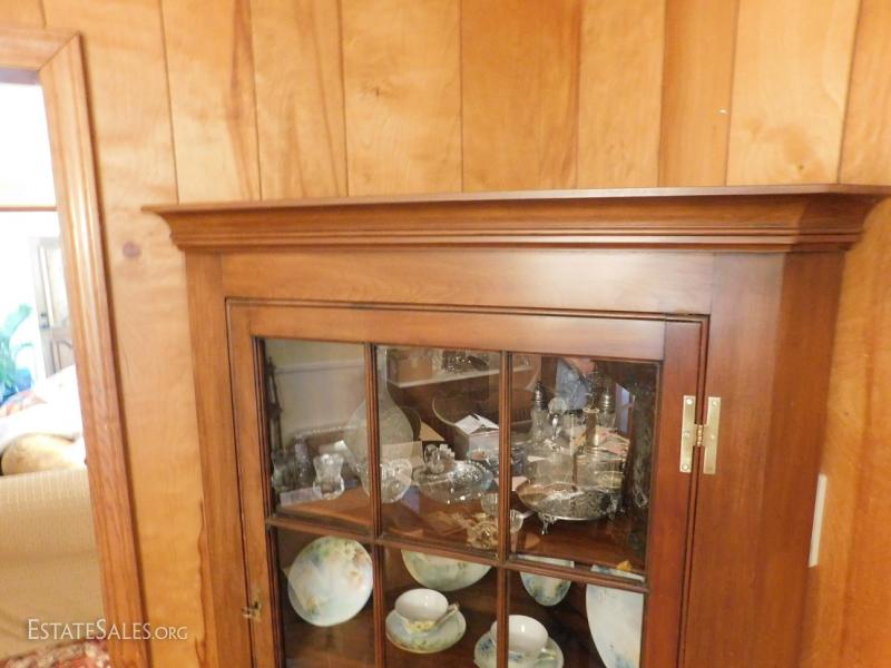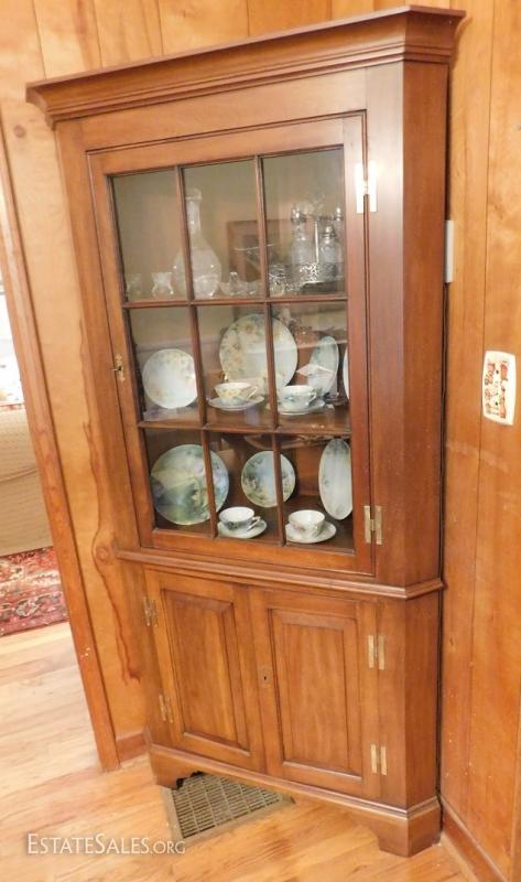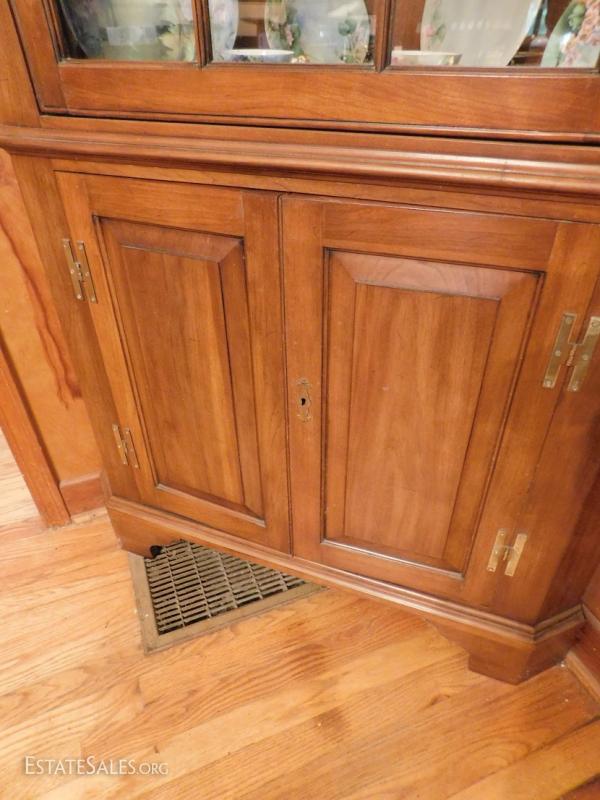 Gorgeous solid wild cherry corner hutch with glass upper doors and bottom storage. Dish shelves. Very nice piece in great condition.
