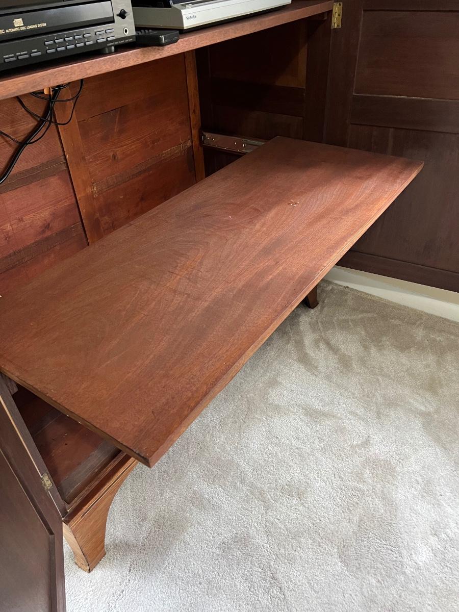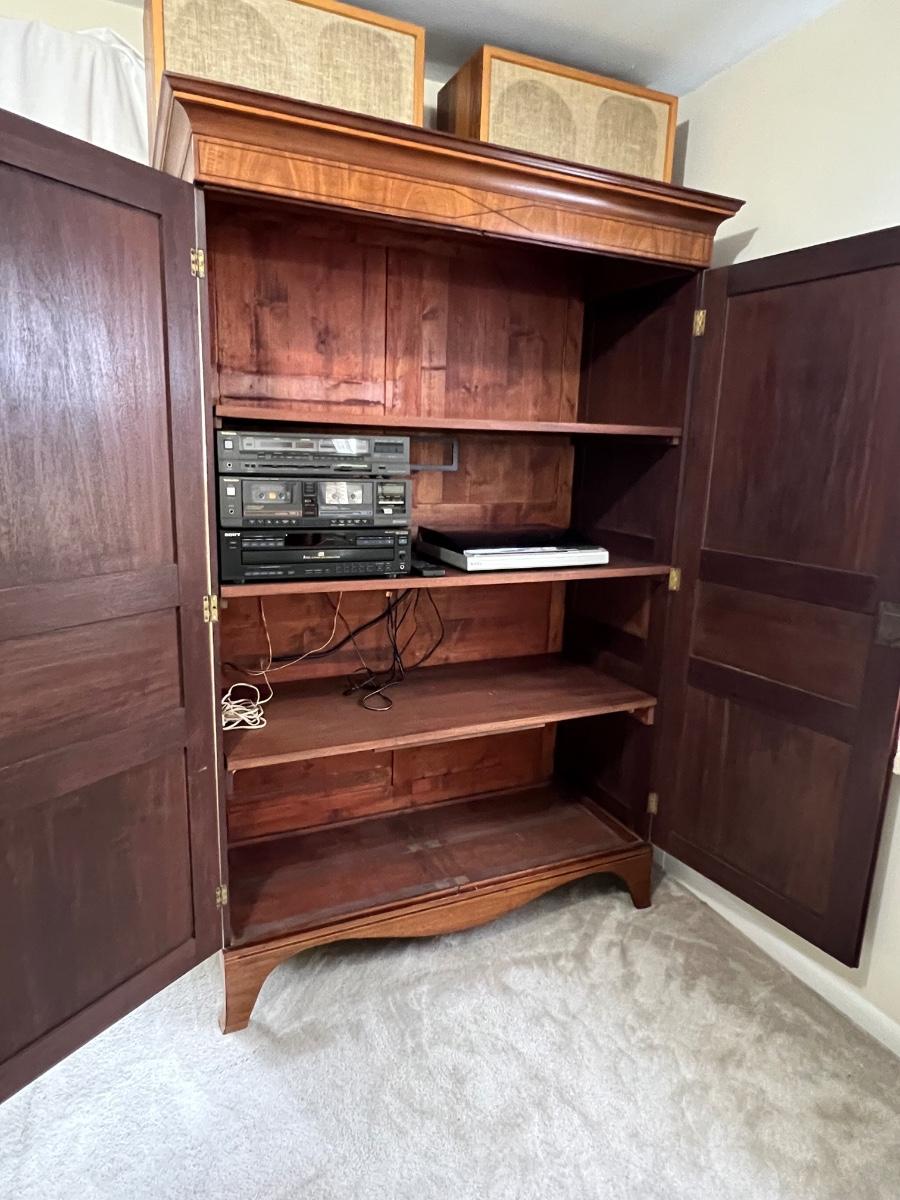Has key ~ Equipment sold separately ~ Shelves are not adjustable but are removable ~ 79” H x 54” W x 22” D ~ Electronics sold Seperately