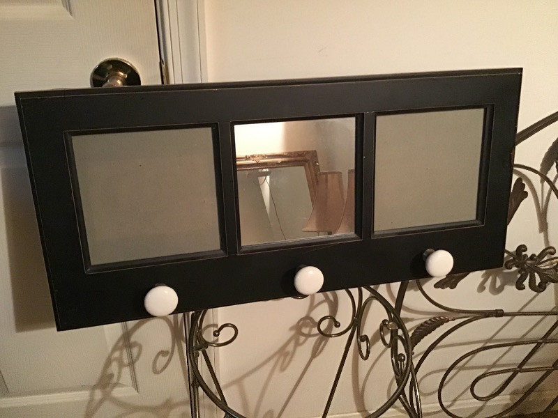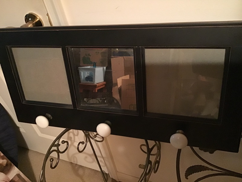30 INCHES WIDE 3 KNOB WITH MIRROR AND TWO INSERTS FOR PICS WALL HANGING.