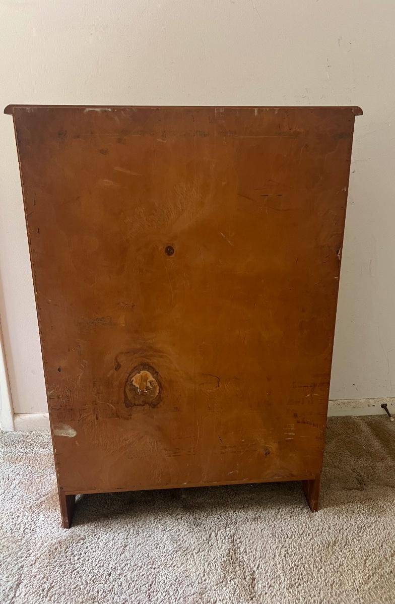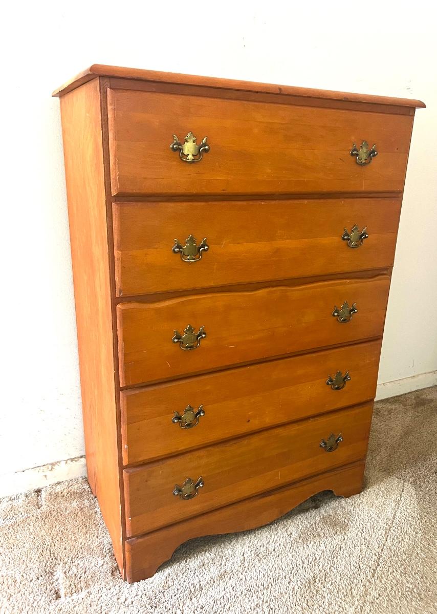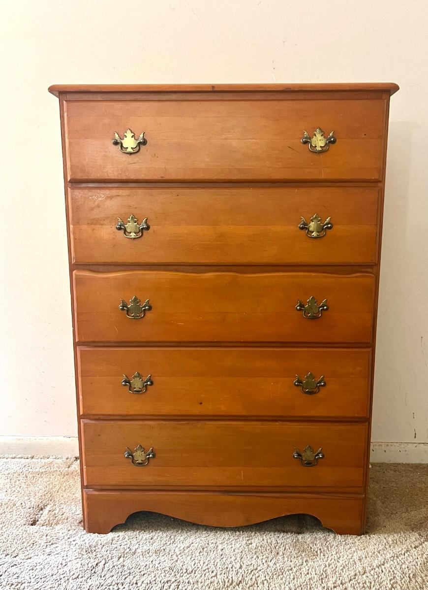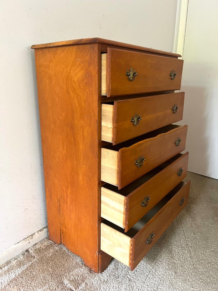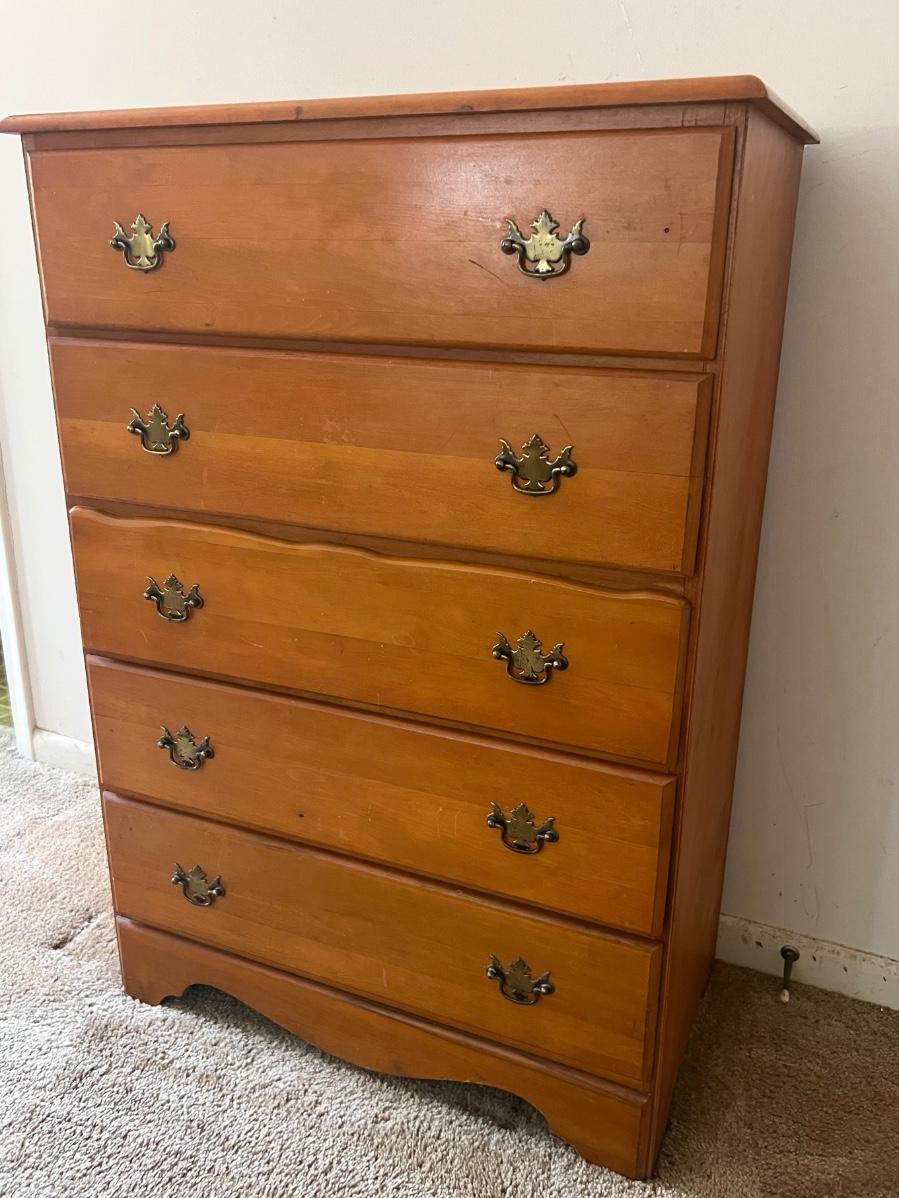 Solid wood 5 drawer dresser. All drawers work as they should. Measures 44 inches tall, 31 inches long and 17 inches deep.