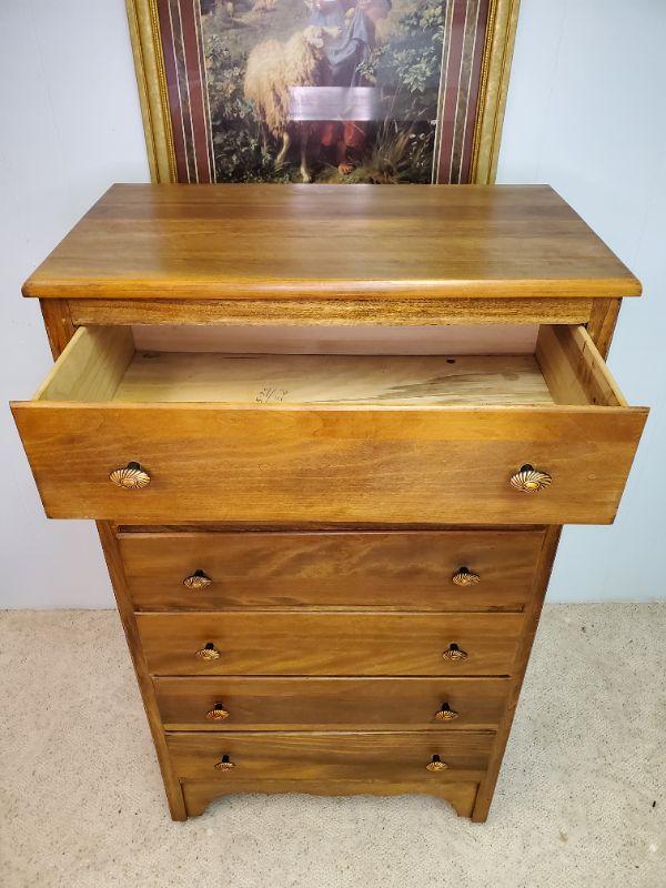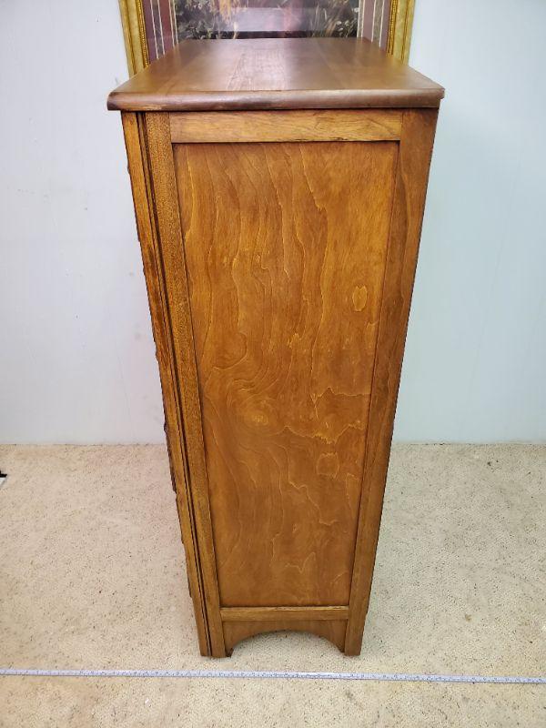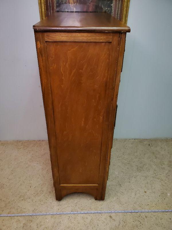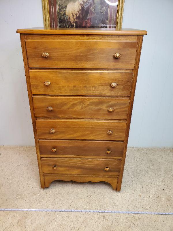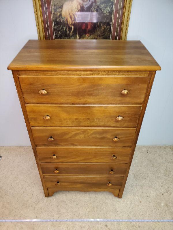 Solid wood, good condition and on wheels! 6 drawers and all pull out with ease. Approximately 49intall, 27in wide, 15.5in deep
