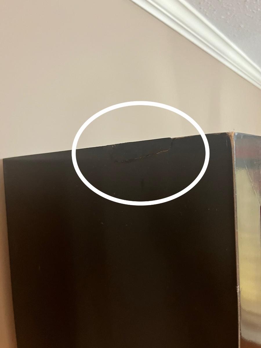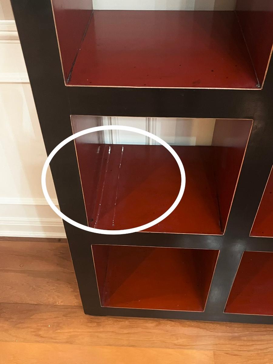 * top left has a minor repair, barely even noticeable. (see photo) ~ One shelf has what looks like minor paint scratches (see photo) ~ 79” H x 61” W x 12.5” D