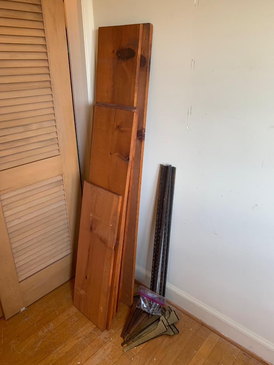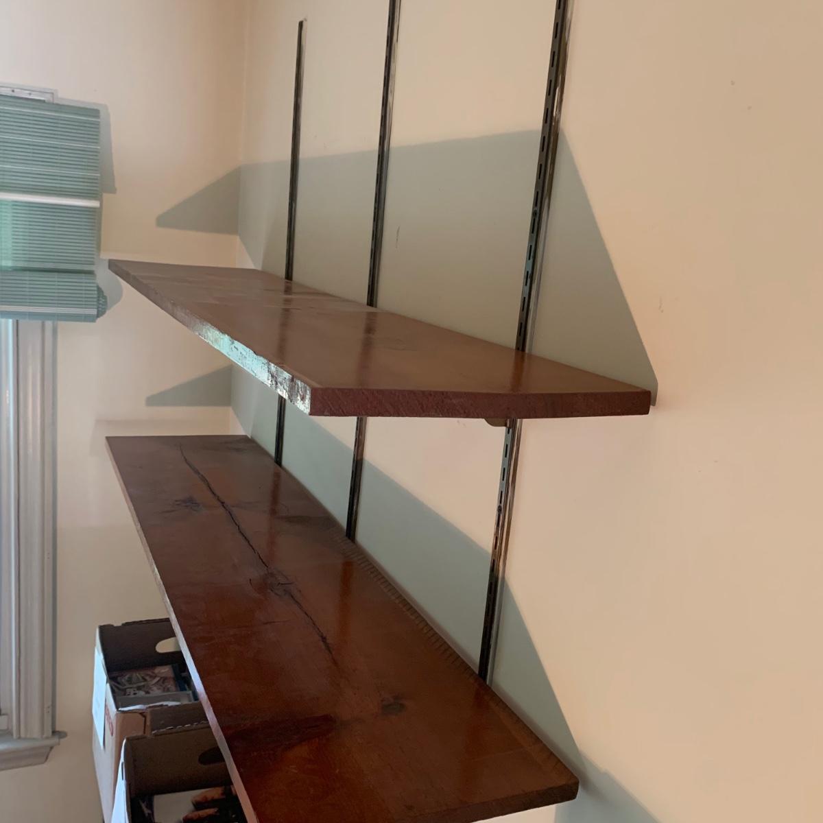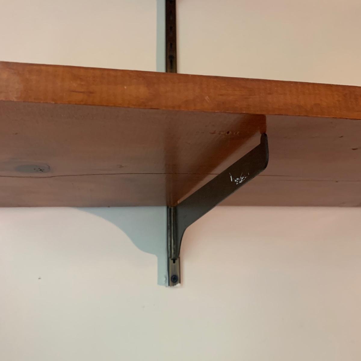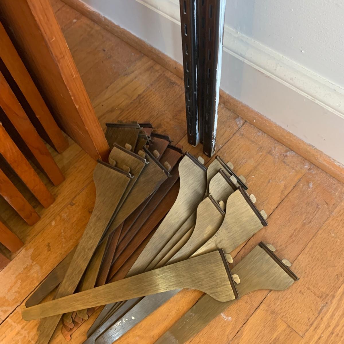 Wall mounted shelving units with metal wall braces and adjustable metal arms to sit the wooden shelves on. This set comes with six 36” metal wall brackets that screw in to the wall, as well as 20 metal arms. Some of the arms are brass colored and the others are copper. The wall brackets were painted around when they were mounted and have remnants of white paint. There are 7 solid wood planks to make the shelves. Two are 62.25” x 11.25” x 0.75”, four are 48.25” x 11.25” x 0.75”, and one is 32.25” x 11.25” x 0.75”. Local pickup only.