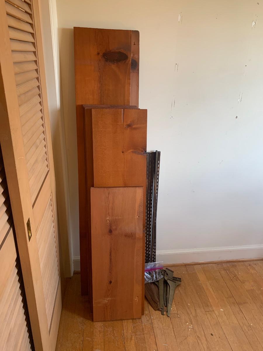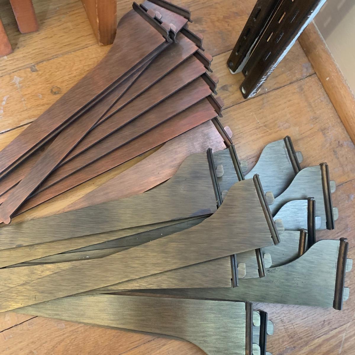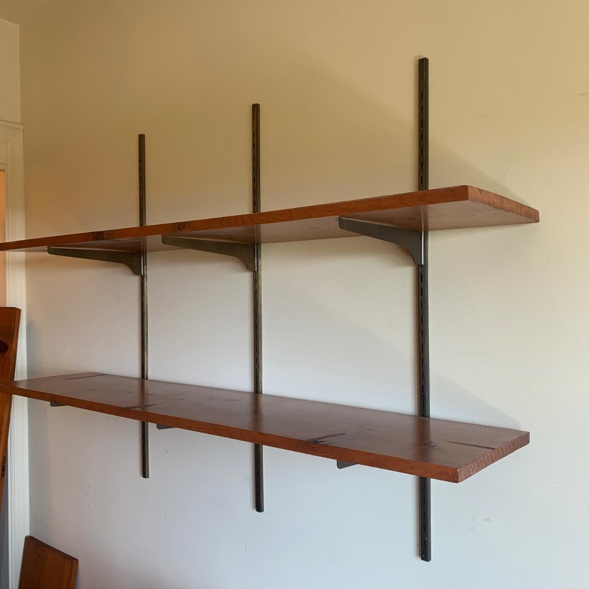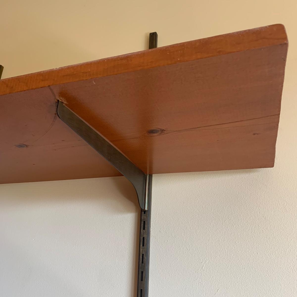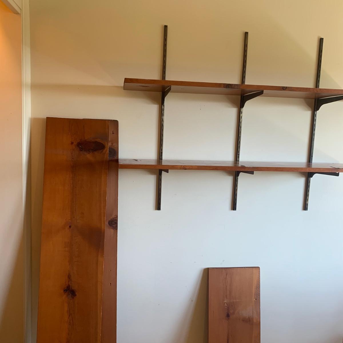 Wall mounted shelving units with metal wall braces and adjustable metal arms to sit the wooden shelves on. This set comes with six 36” metal wall brackets that screw in to the wall, as well as 20 metal arms. Some of the arms are brass colored and the others are copper. The wall brackets were painted around when they were mounted and have remnants of white paint. There are 7 solid wood planks to make the shelves. Two are 62.25” x 11.25” x 0.75”, four are 48.25” x 11.25” x 0.75”, and one is 32.25” x 11.25” x 0.75”. Local pickup only.