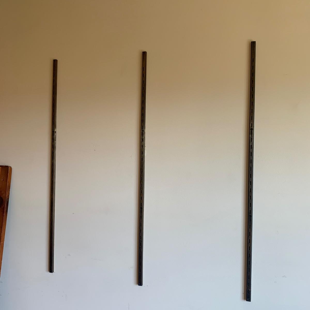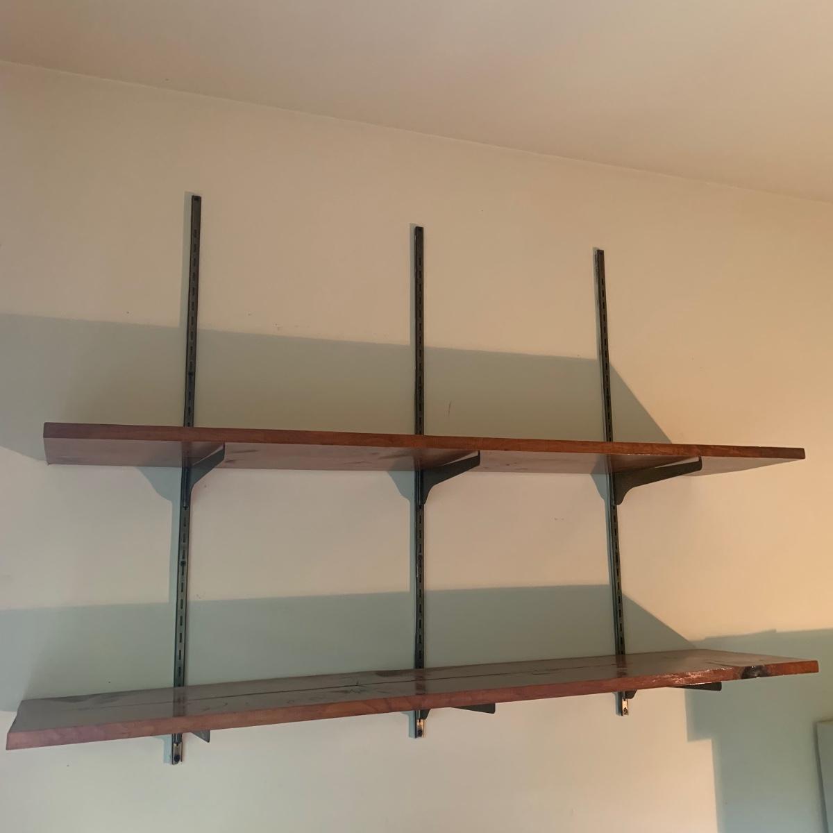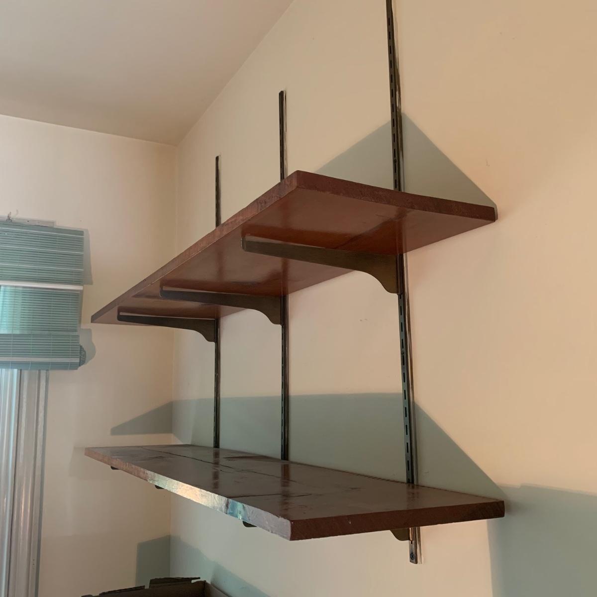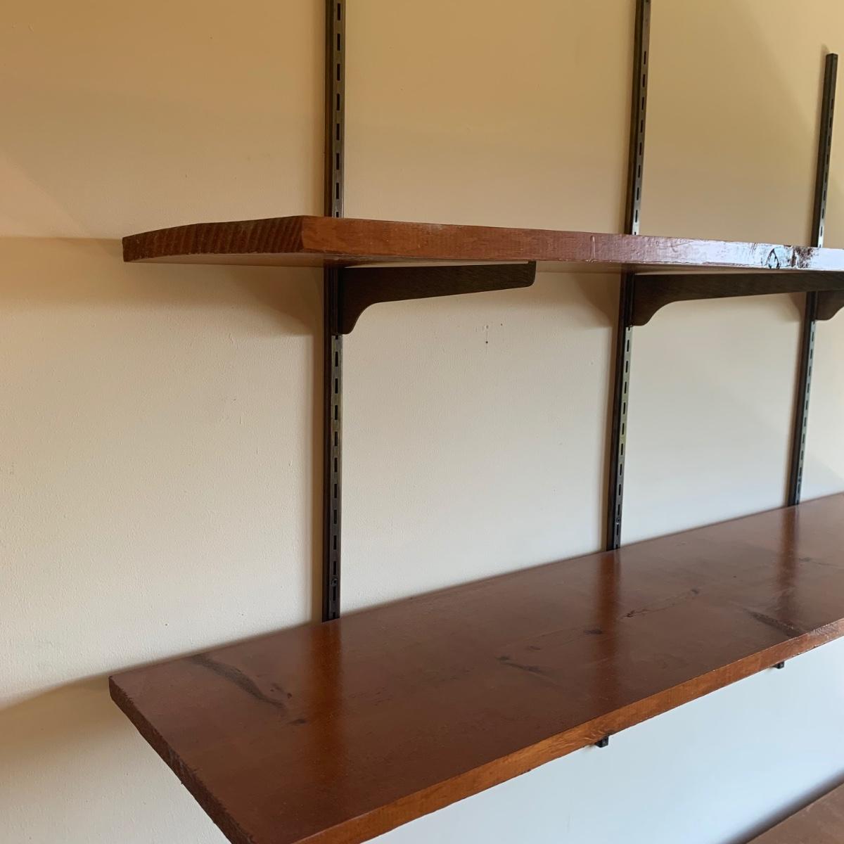 Wall mounted shelving units with metal wall braces and adjustable metal arms to sit the wooden shelves on. This set comes with six 36” metal wall brackets that screw in to the wall, as well as 20 metal arms. Some of the arms are brass colored and the others are copper. The wall brackets were painted around when they were mounted and have remnants of white paint. There are 7 solid wood planks to make the shelves. Two are 62.25” x 11.25” x 0.75”, four are 48.25” x 11.25” x 0.75”, and one is 32.25” x 11.25” x 0.75”. Local pickup only.
