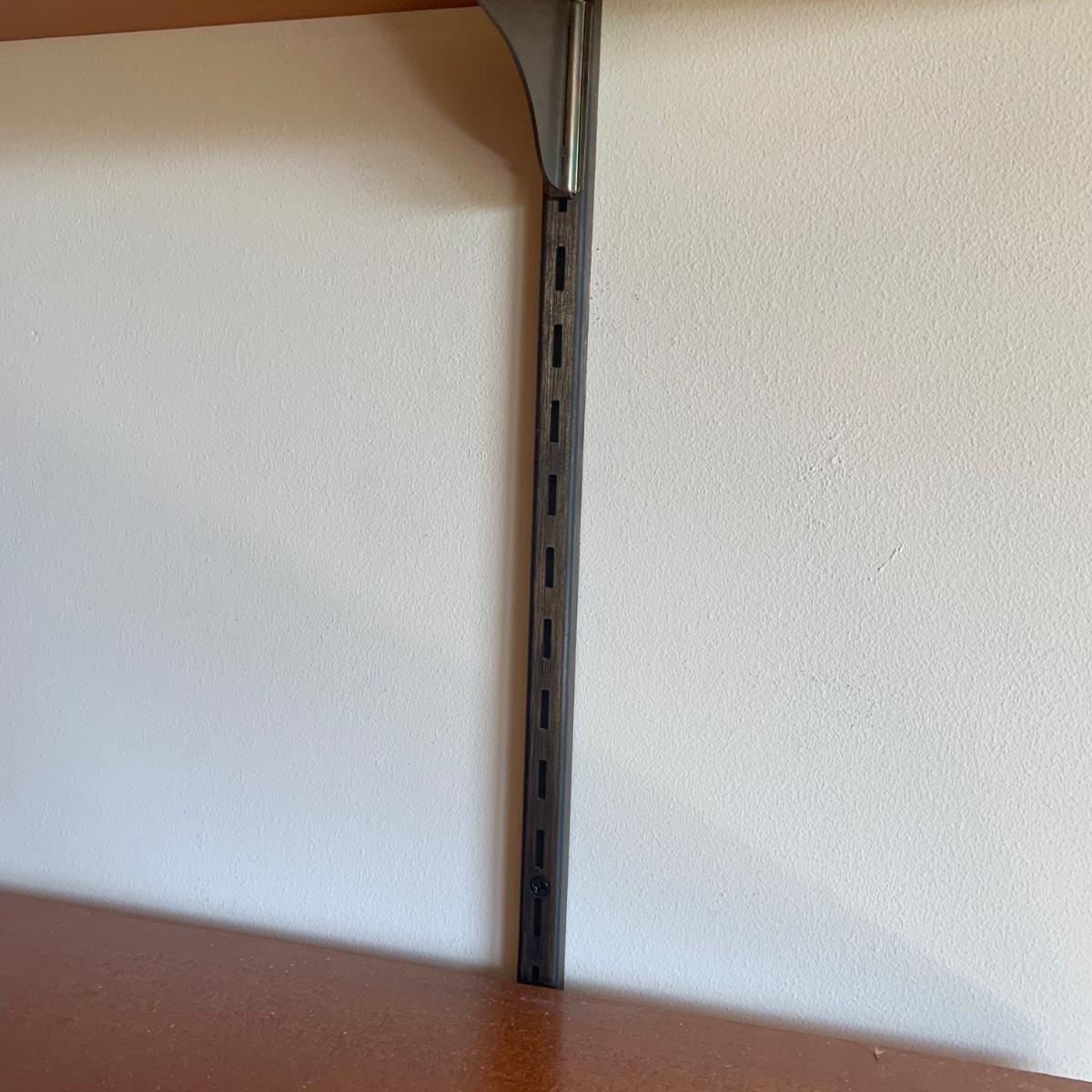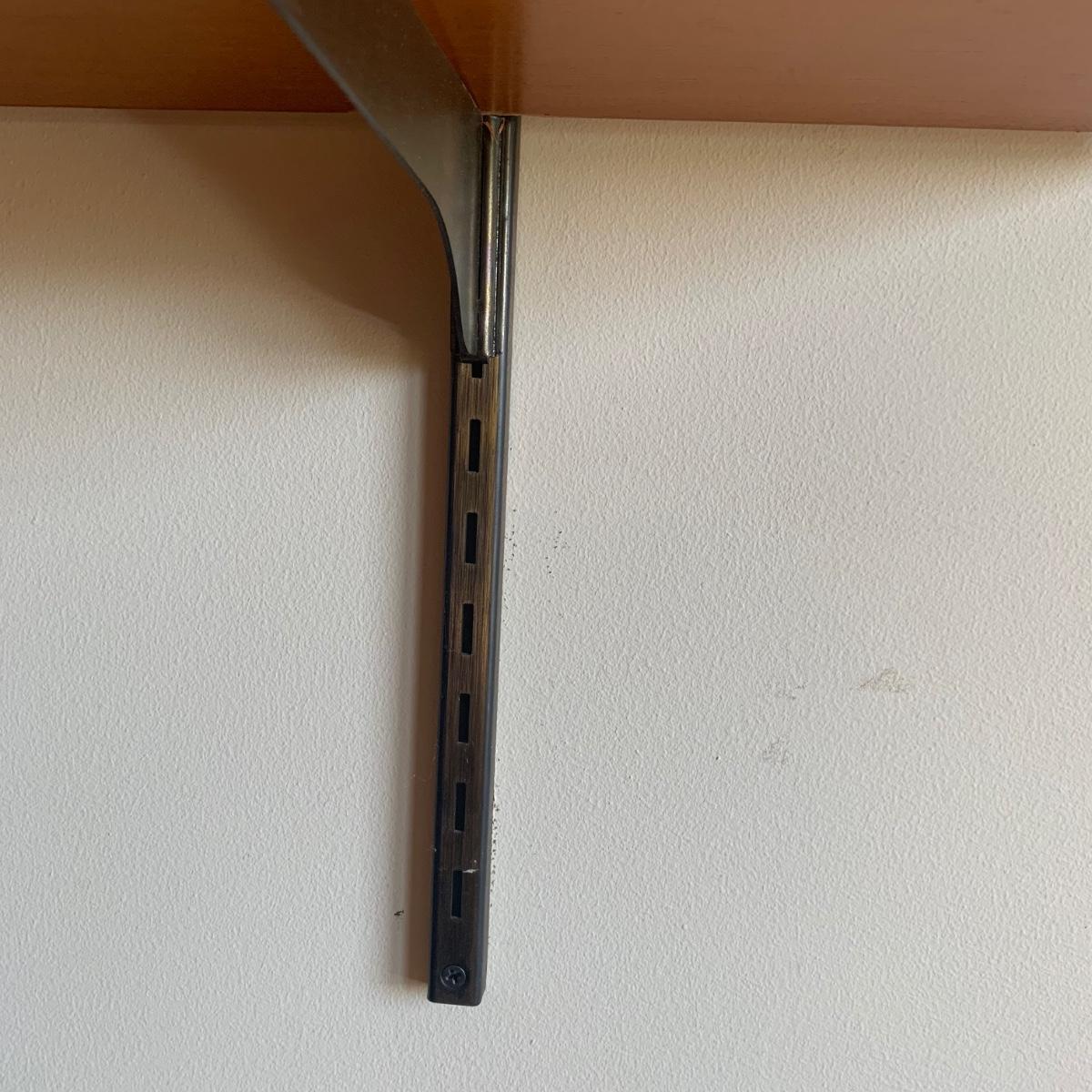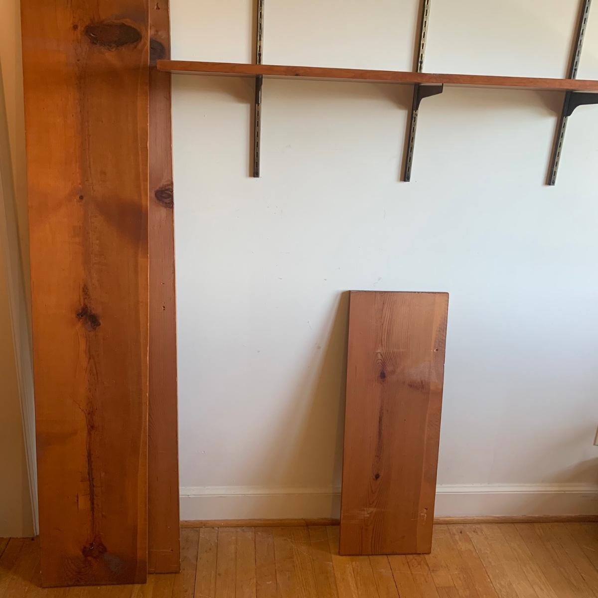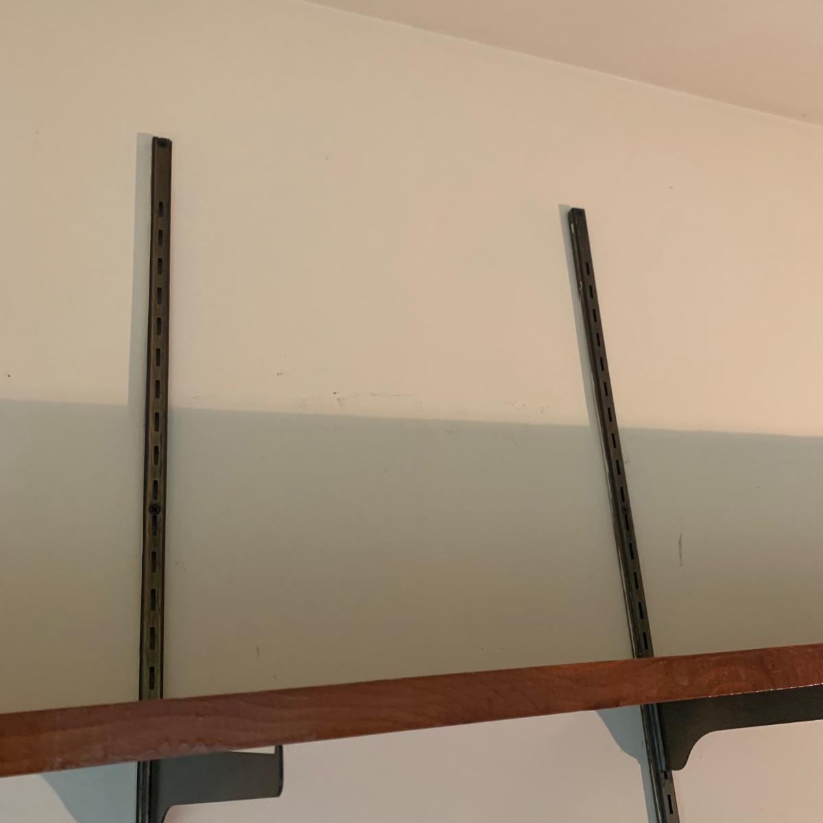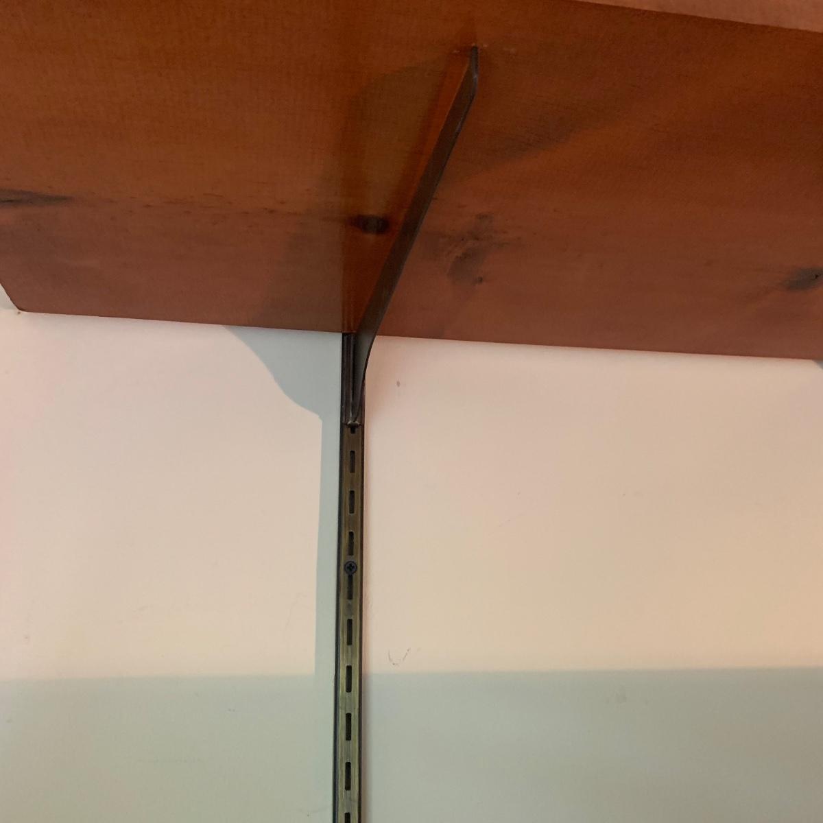 Wall mounted shelving units with metal wall braces and adjustable metal arms to sit the wooden shelves on. This set comes with six 36” metal wall brackets that screw in to the wall, as well as 20 metal arms. Some of the arms are brass colored and the others are copper. The wall brackets were painted around when they were mounted and have remnants of white paint. There are 7 solid wood planks to make the shelves. Two are 62.25” x 11.25” x 0.75”, four are 48.25” x 11.25” x 0.75”, and one is 32.25” x 11.25” x 0.75”. Local pickup only.