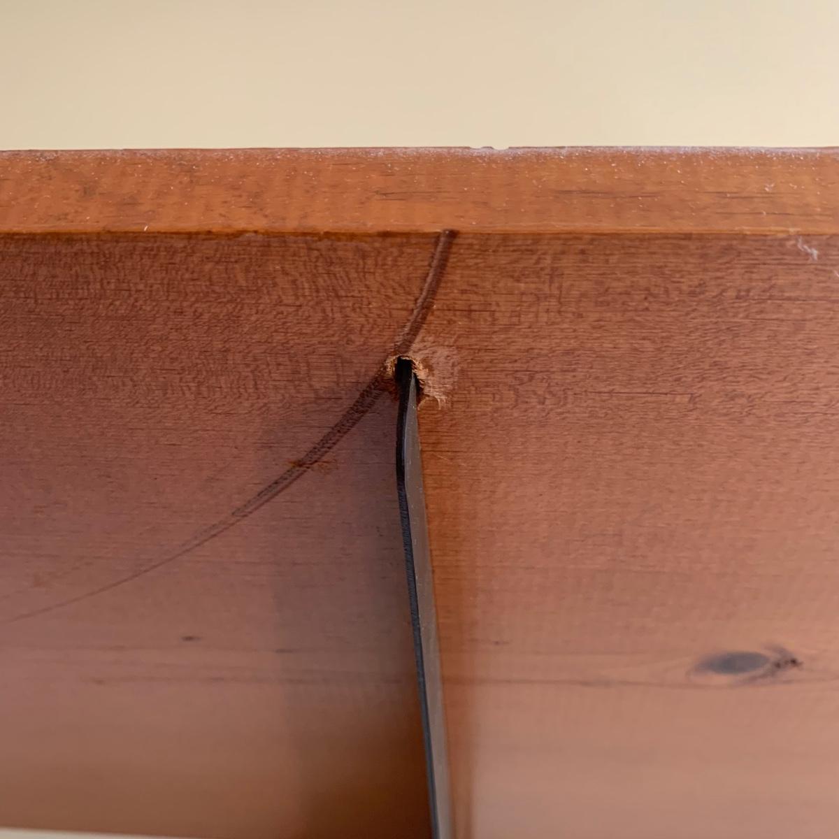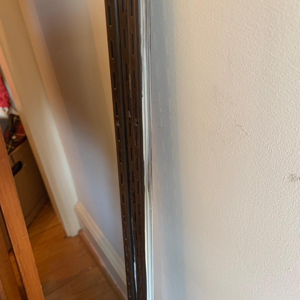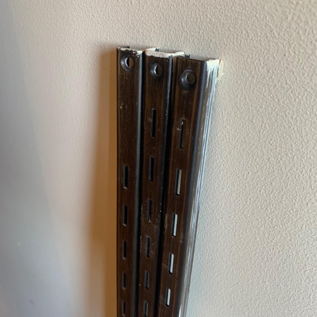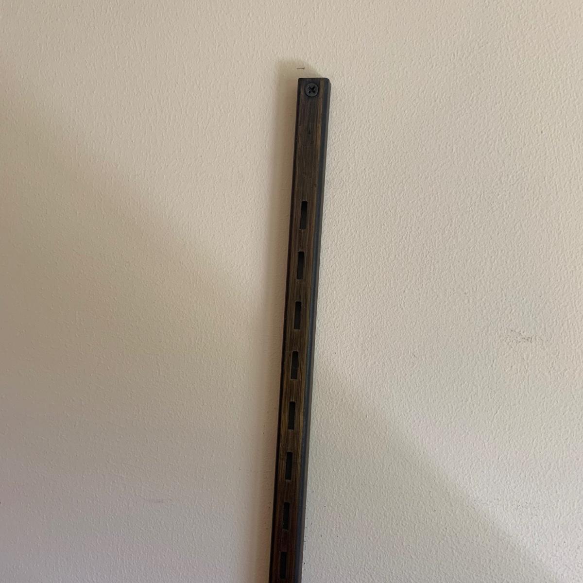 Wall mounted shelving units with metal wall braces and adjustable metal arms to sit the wooden shelves on. This set comes with six 36” metal wall brackets that screw in to the wall, as well as 20 metal arms. Some of the arms are brass colored and the others are copper. The wall brackets were painted around when they were mounted and have remnants of white paint. There are 7 solid wood planks to make the shelves. Two are 62.25” x 11.25” x 0.75”, four are 48.25” x 11.25” x 0.75”, and one is 32.25” x 11.25” x 0.75”. Local pickup only.