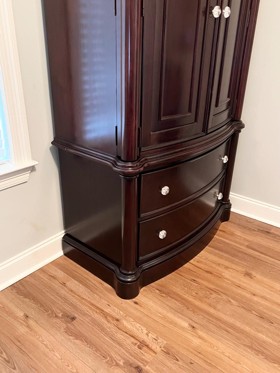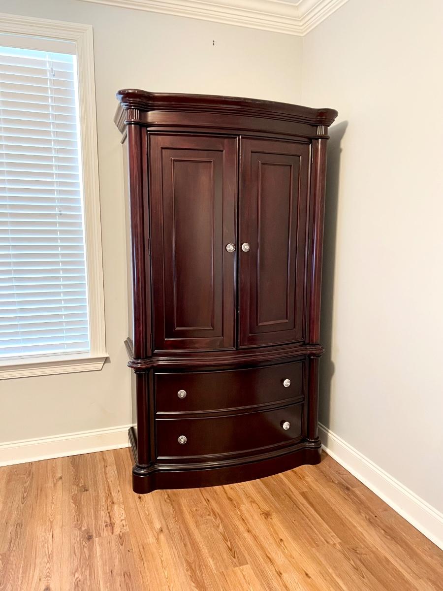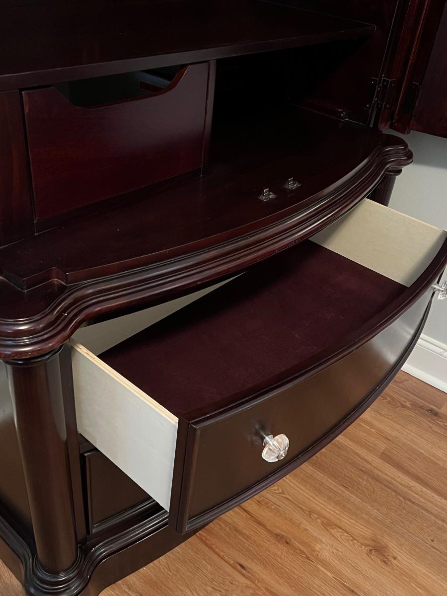 2 pieces ~ Drawers slide easily ~ Small drawer in cabinet and top drawer are both felt lined ~ No brand ~ Includes 2 shelves but will need hanging pegs ~ 80” H x 46” W x 25” D