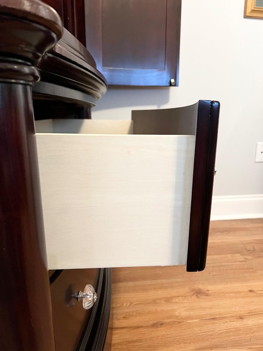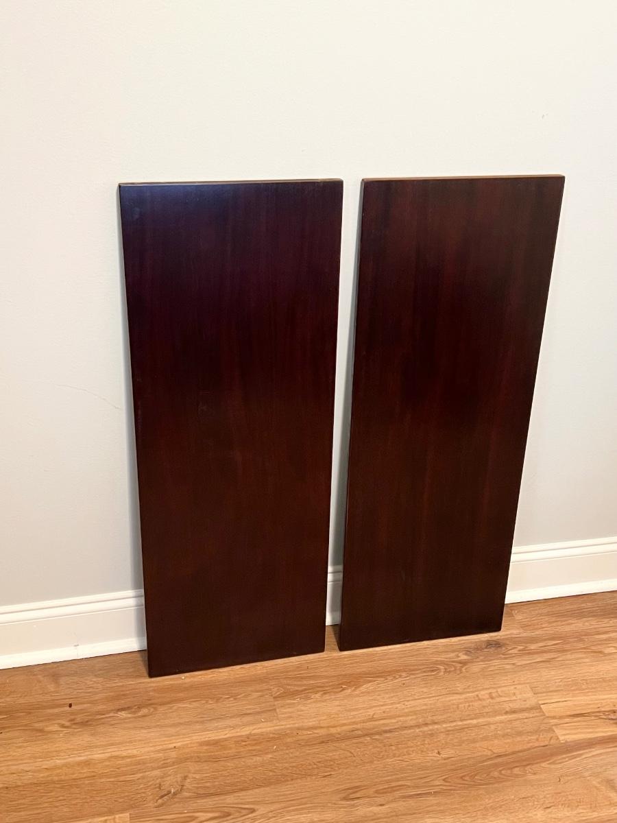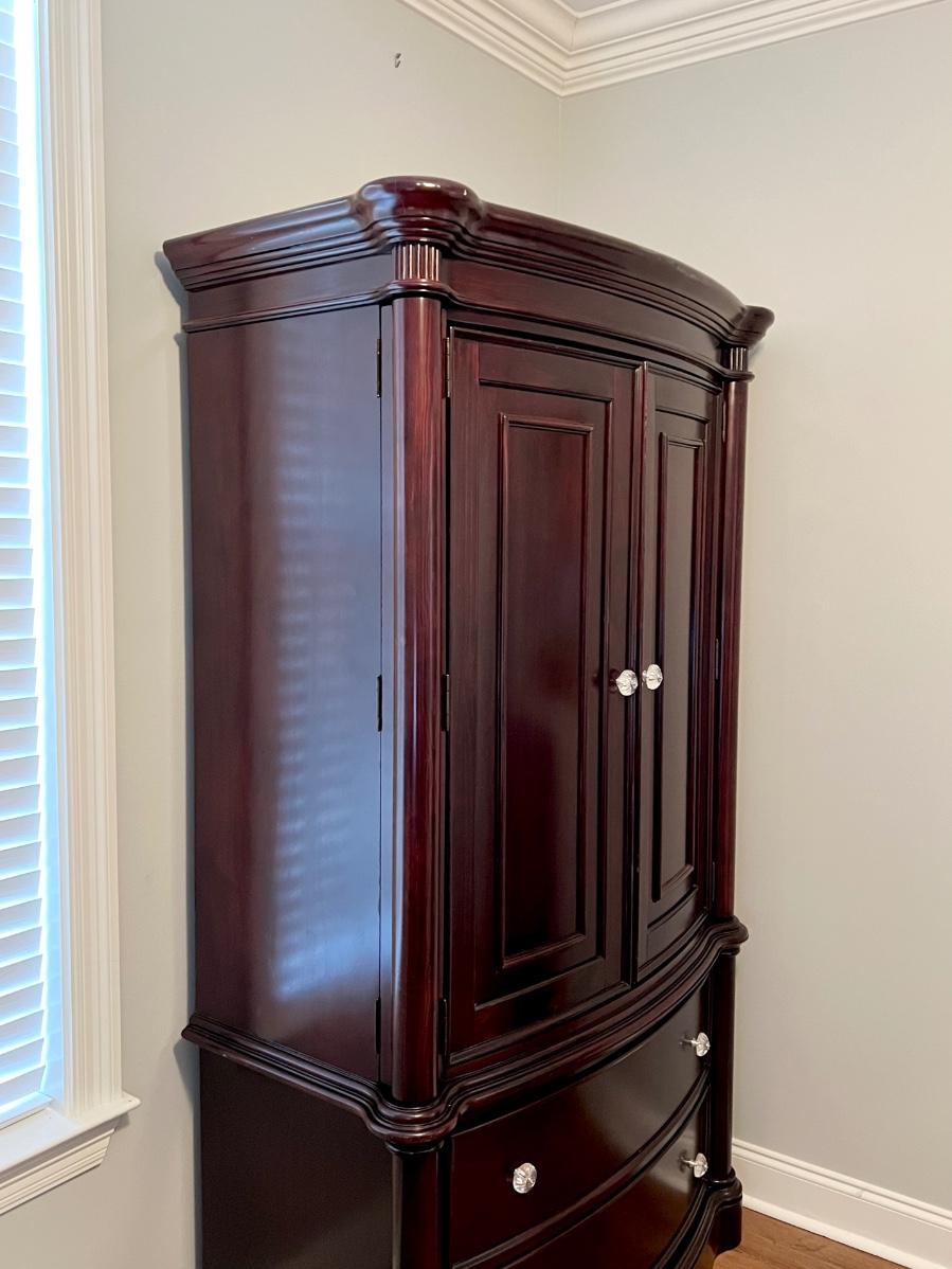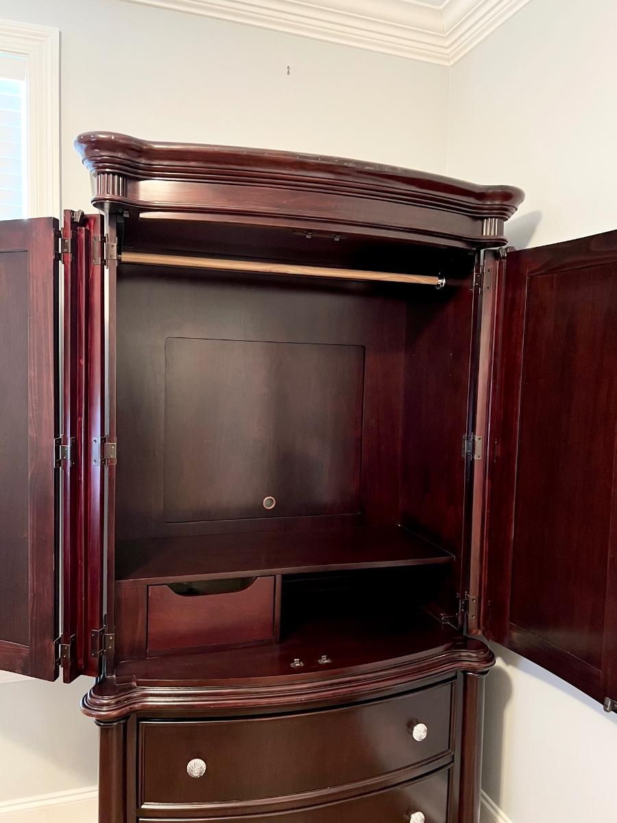 2 pieces ~ Drawers slide easily ~ Small drawer in cabinet and top drawer are both felt lined ~ No brand ~ Includes 2 shelves but will need hanging pegs ~ 80” H x 46” W x 25” D