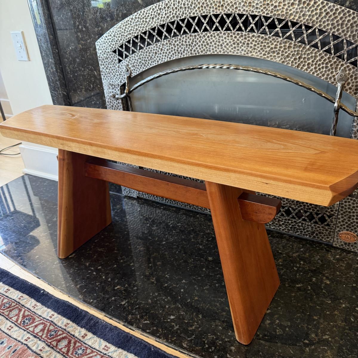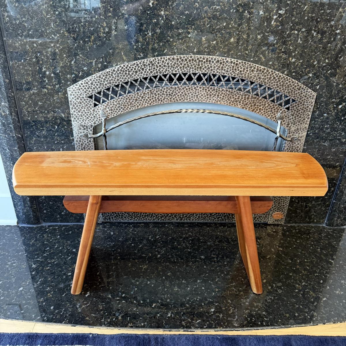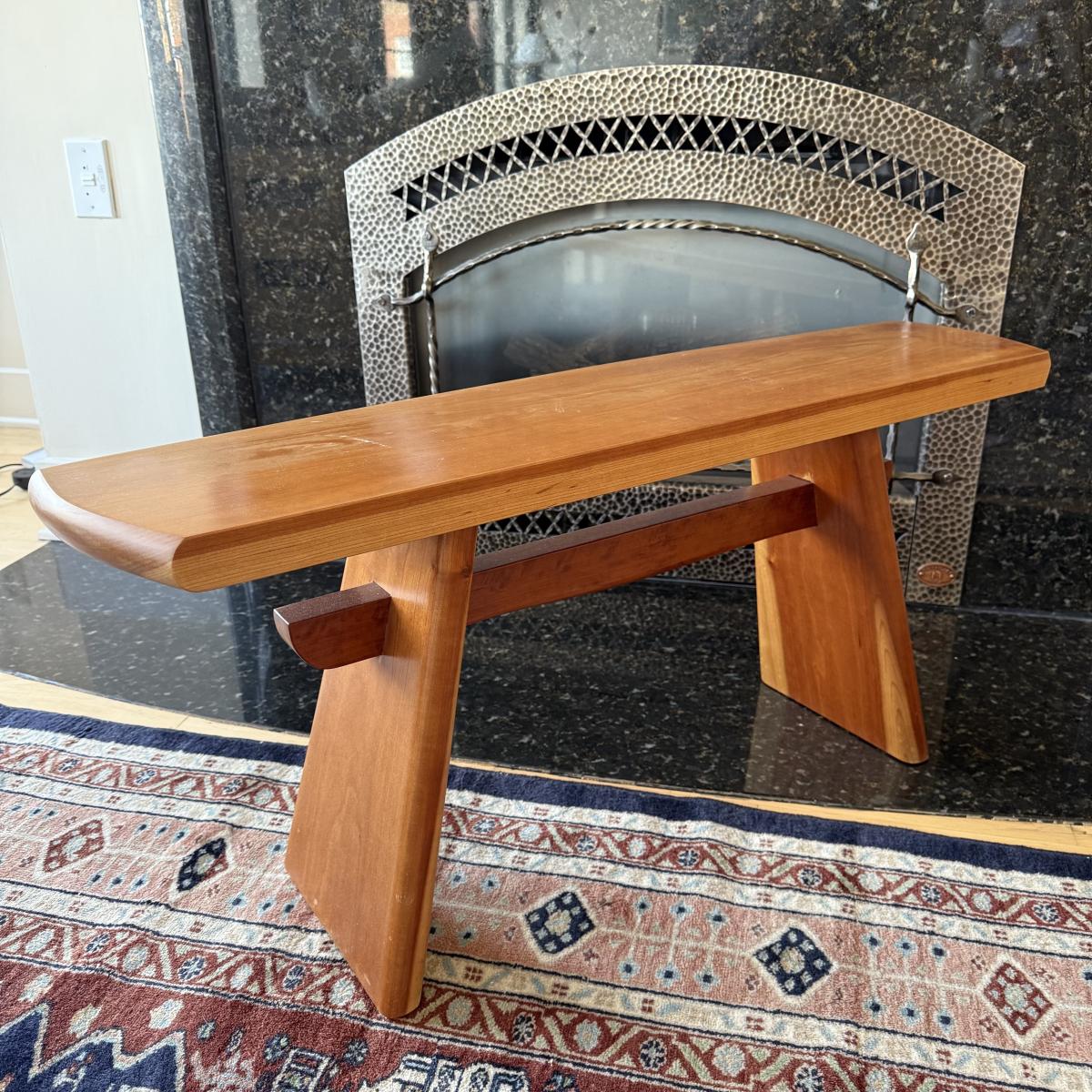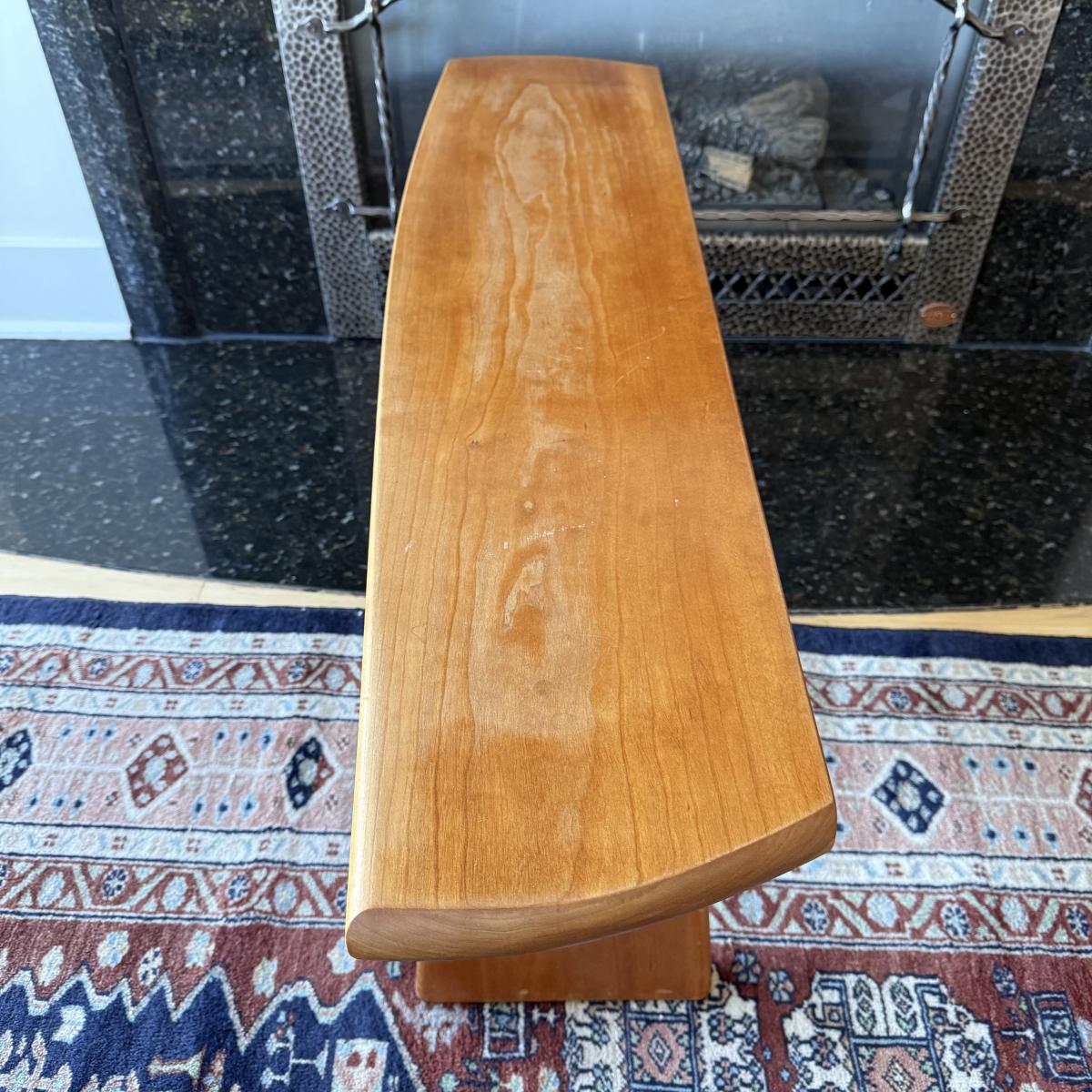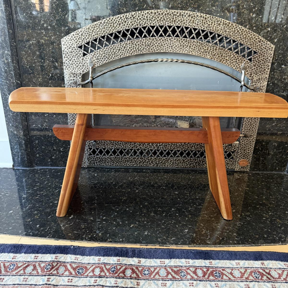 This lot contains a beautiful solid wood bench. This item measures 39” x 9.75” x 17.75”H. This item has a funky design and is heavy! There is a bit of wear to finish on the top surface, see pictures for details. Local pickup only.