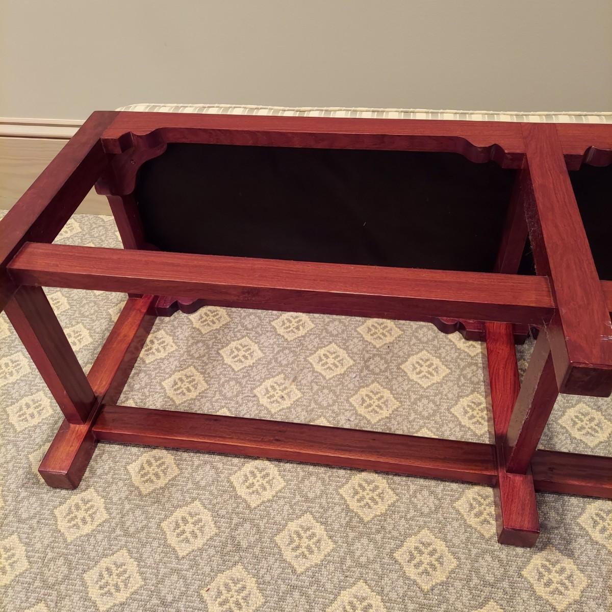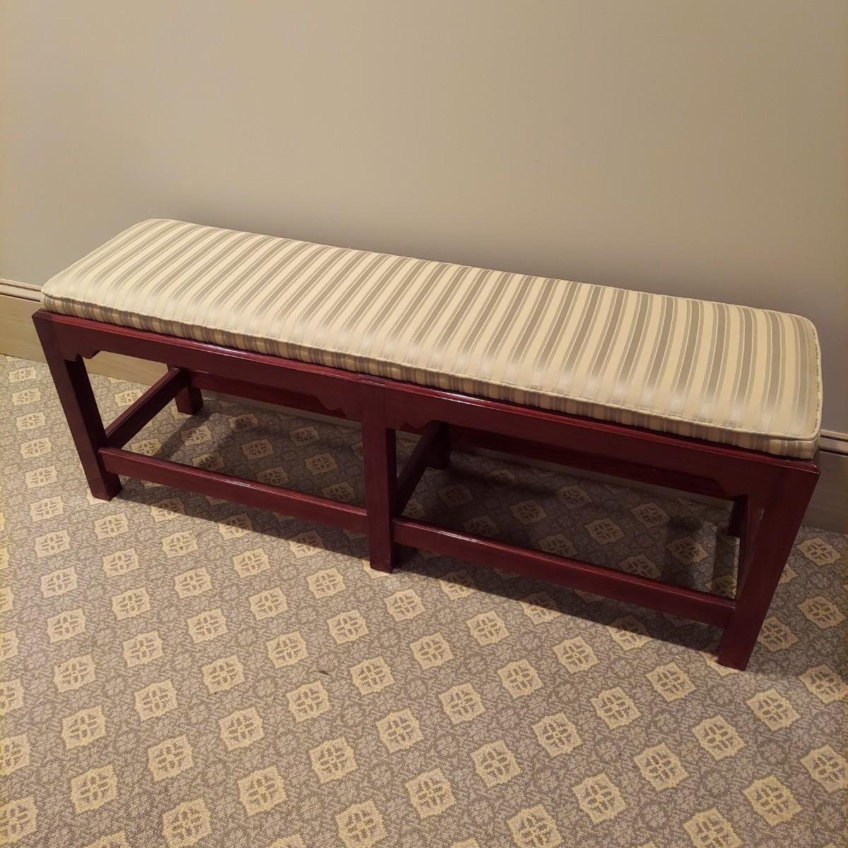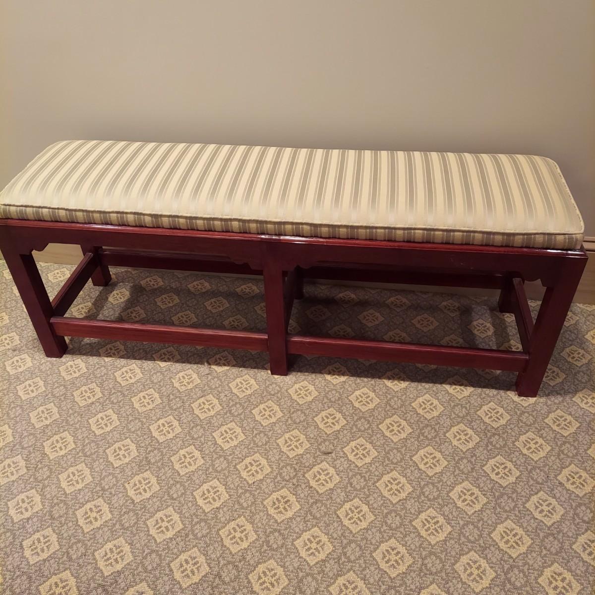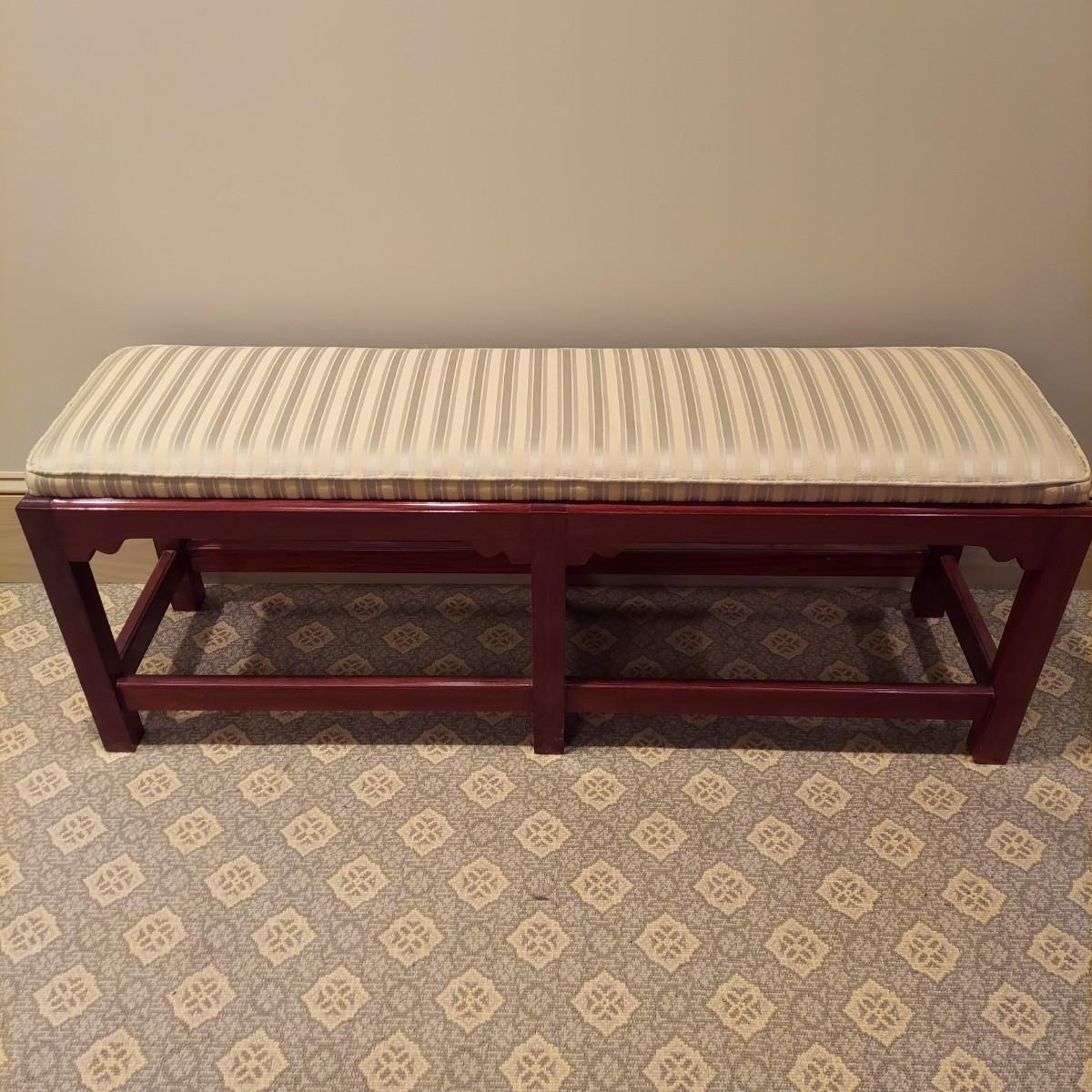 Dark wood bench with upholstered top pad. Made from solid wood with Asian style design elements. The padded seat is a Jacquard stripe in cream and sage green and is attached. It's not a removable cushion. The piece measures 50" x 14" x 18"H. Matches drapery in another lot. Local Pickup Only.