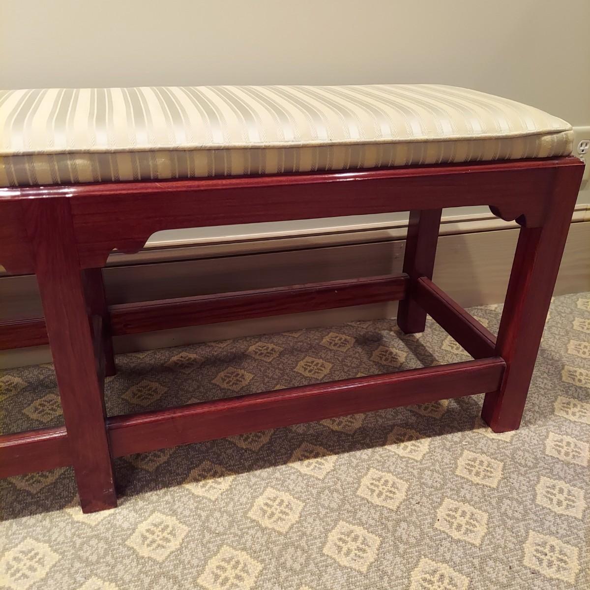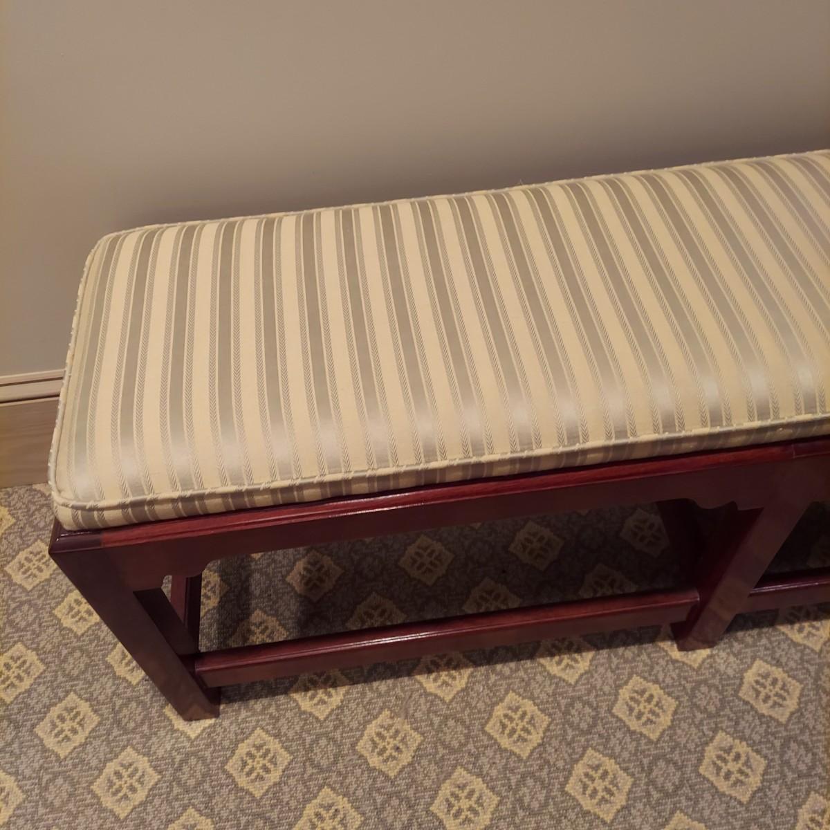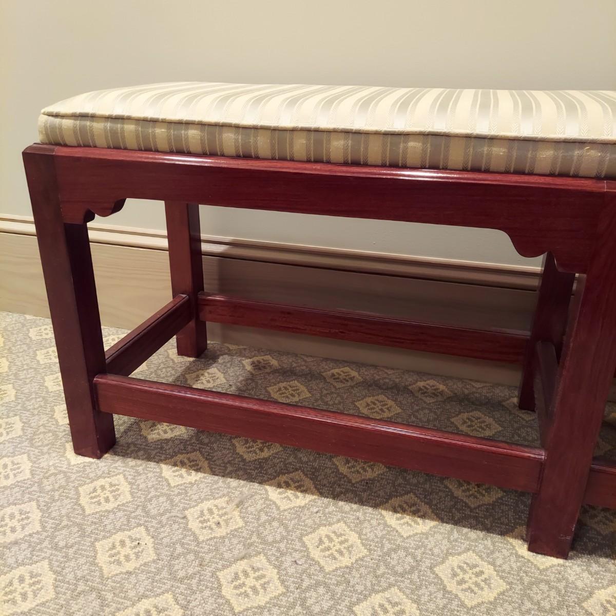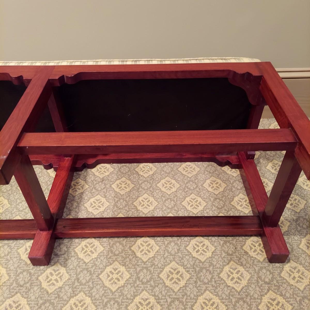 Dark wood bench with upholstered top pad. Made from solid wood with Asian style design elements. The padded seat is a Jacquard stripe in cream and sage green and is attached. It's not a removable cushion. The piece measures 50" x 14" x 18"H. Matches drapery in another lot. Local Pickup Only.