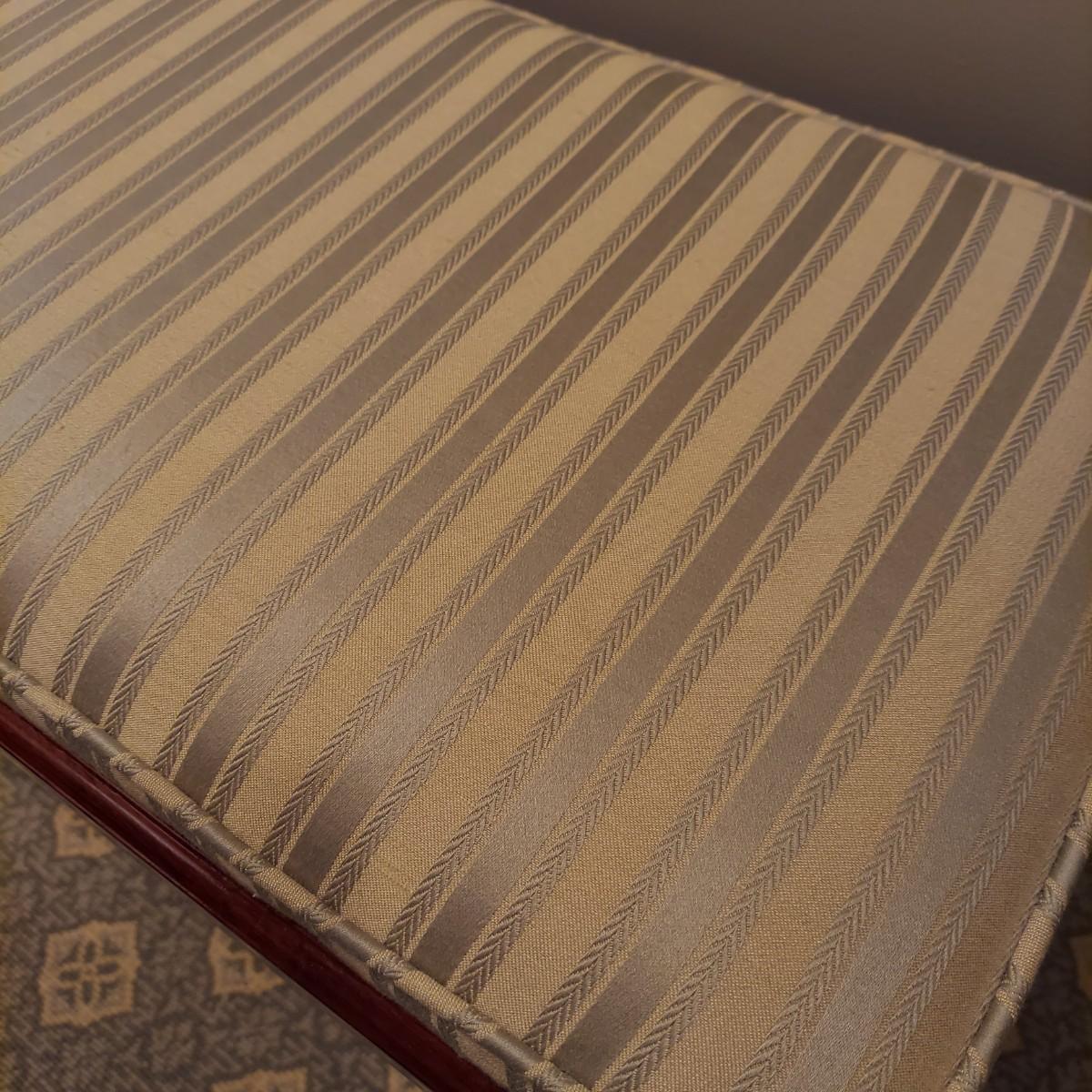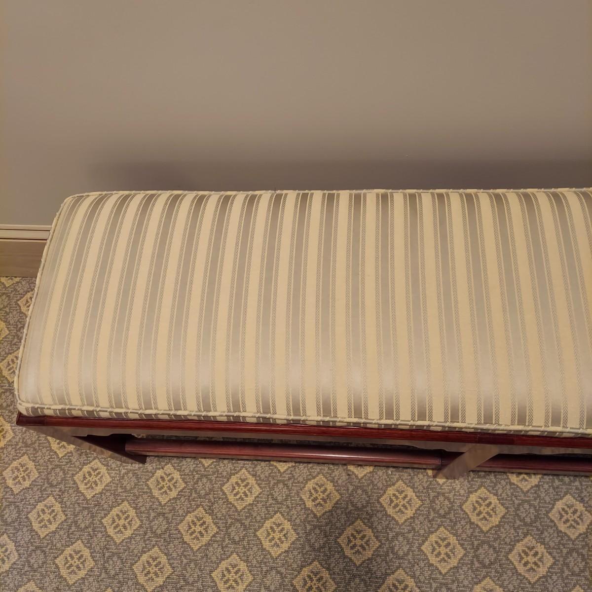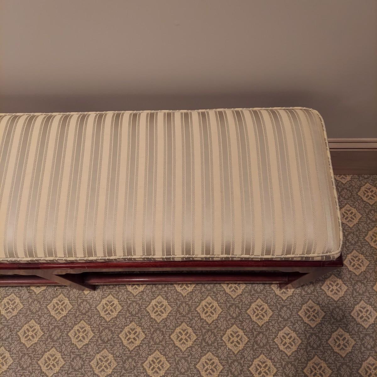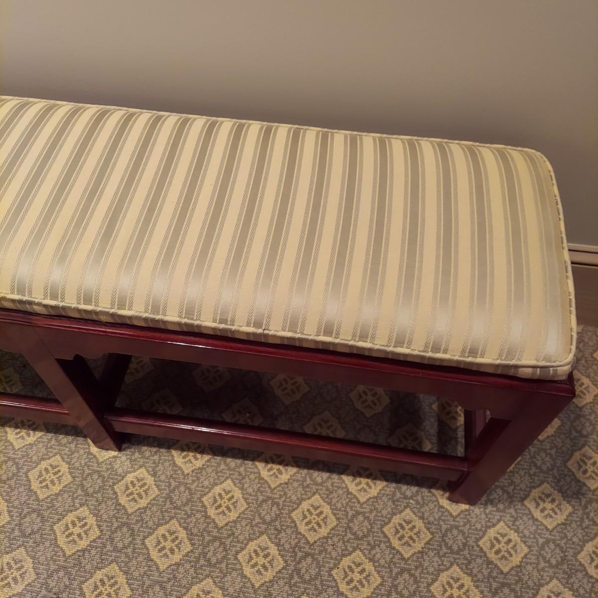 Dark wood bench with upholstered top pad. Made from solid wood with Asian style design elements. The padded seat is a Jacquard stripe in cream and sage green and is attached. It's not a removable cushion. The piece measures 50" x 14" x 18"H. Matches drapery in another lot. Local Pickup Only.