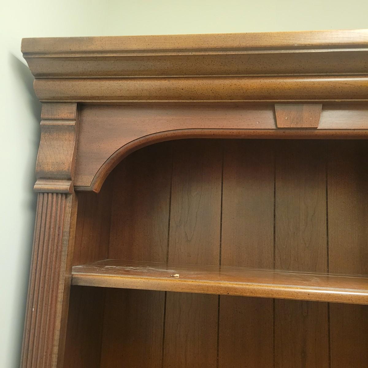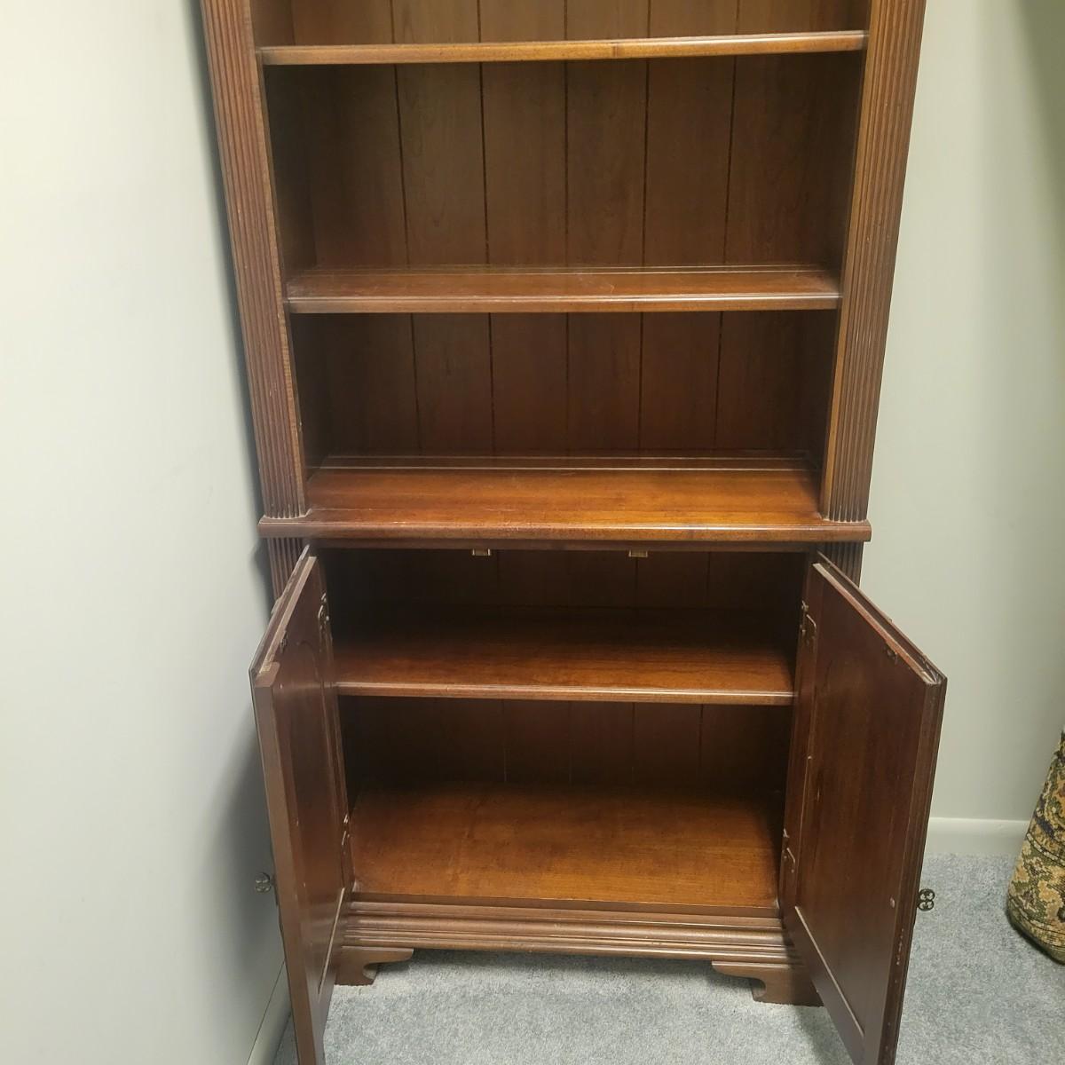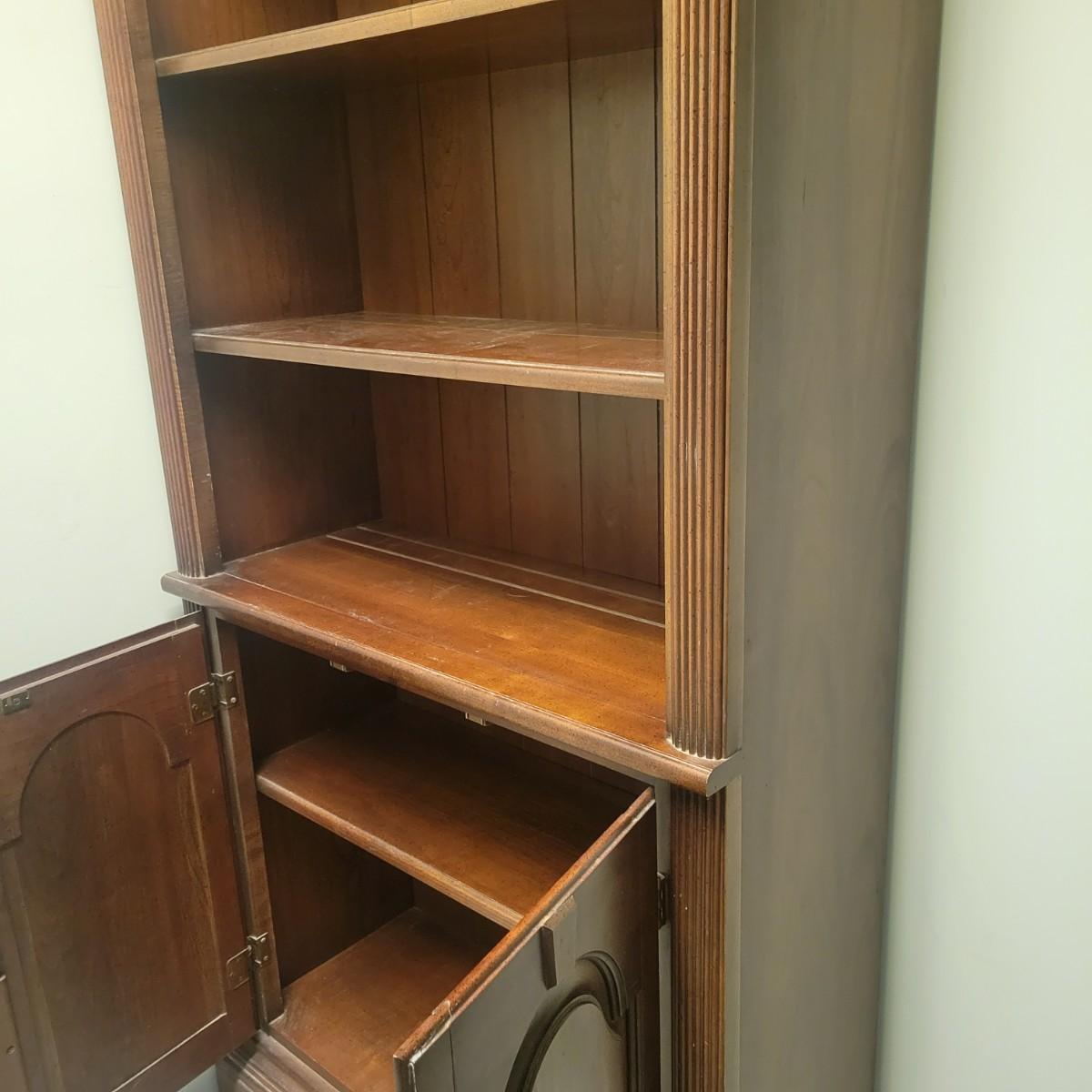 A large, solid wood bookcase that is in good condition with no notable damage. Bookcase features 3 unadjustable shelves that are grooved for displaying plates, brass hardware and a lower cabinet with one shelf. Bookcase measures approximately 31.5" x 14" x 78" Local pickup only