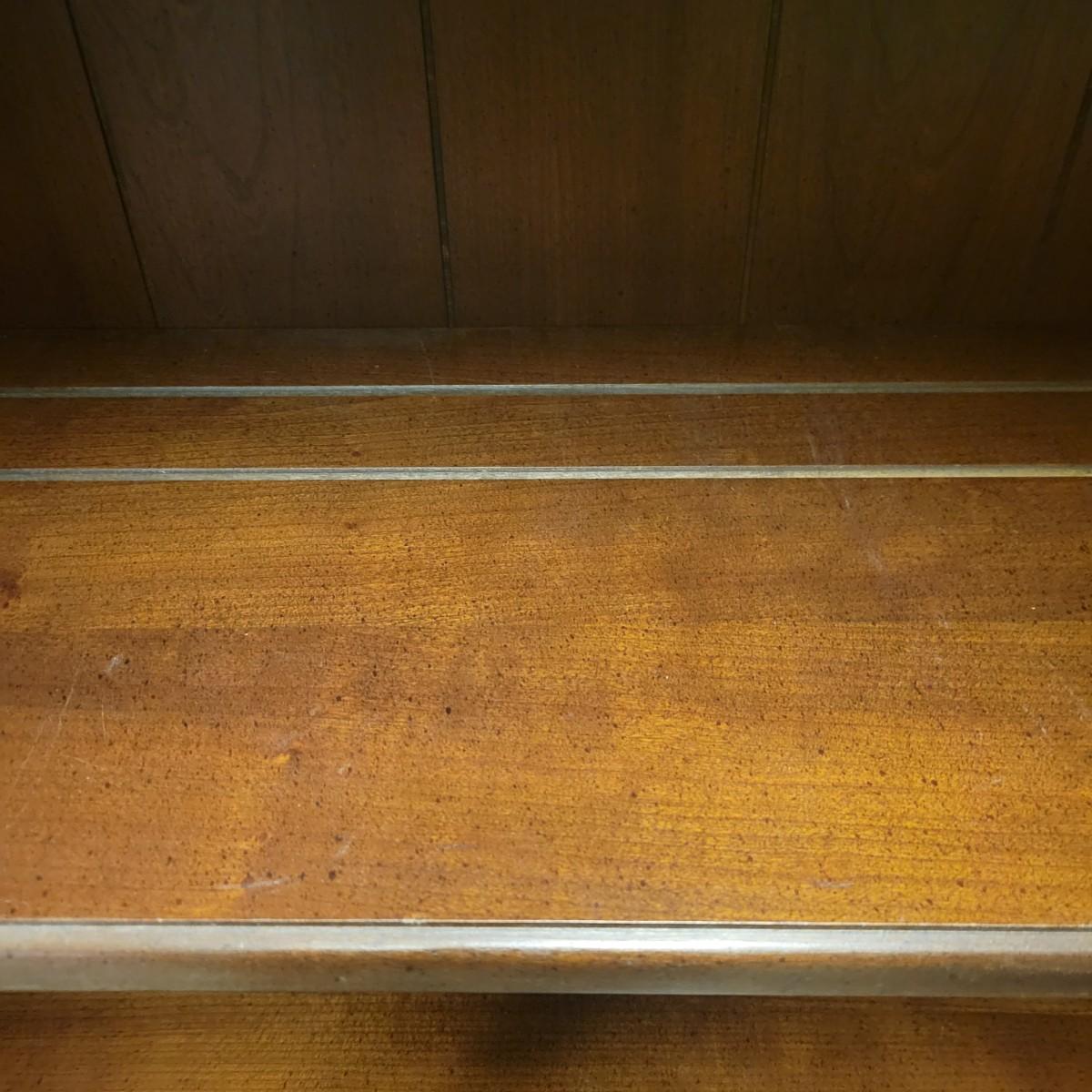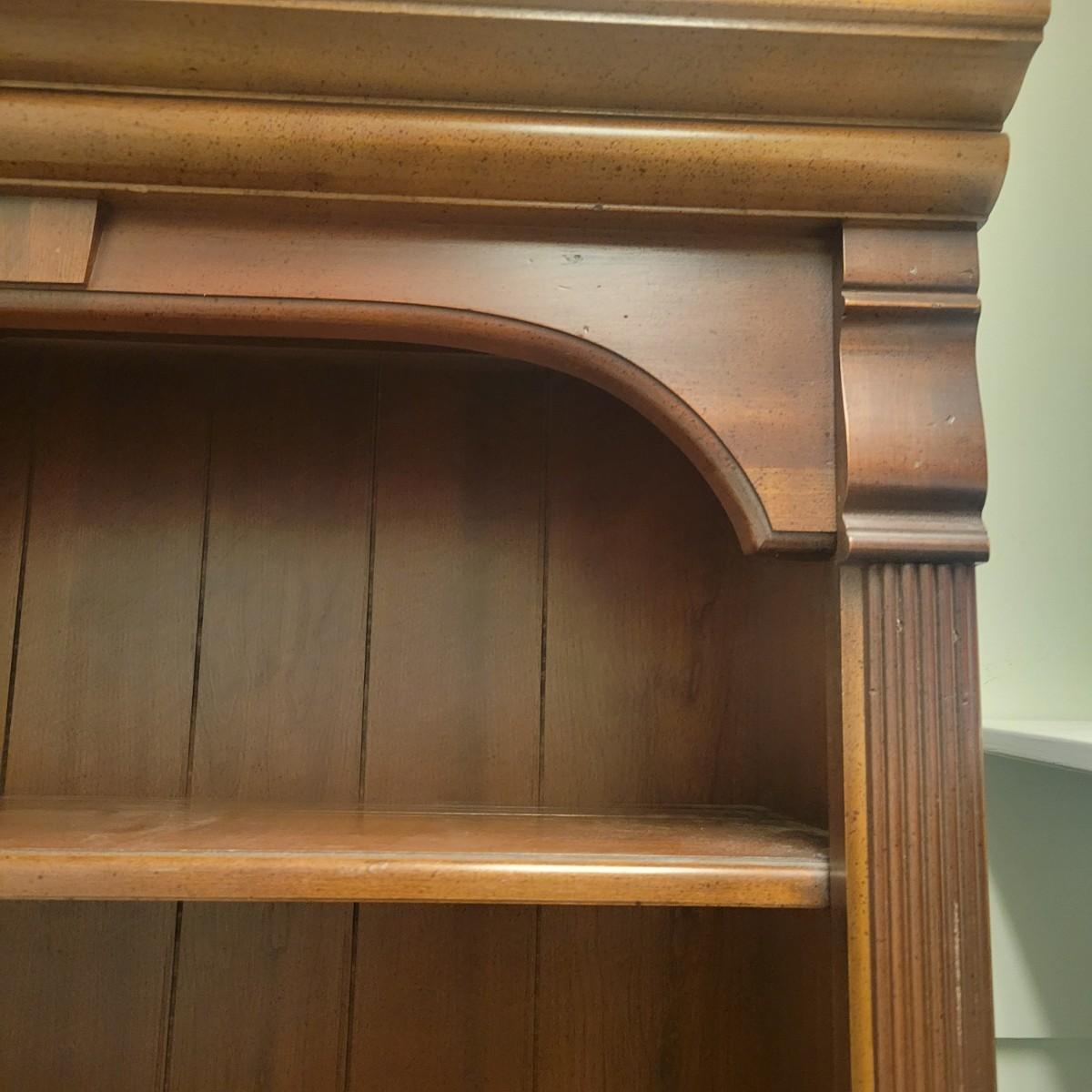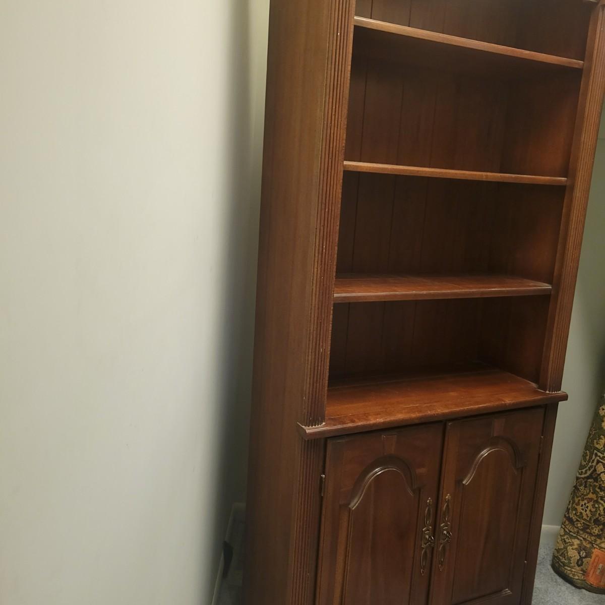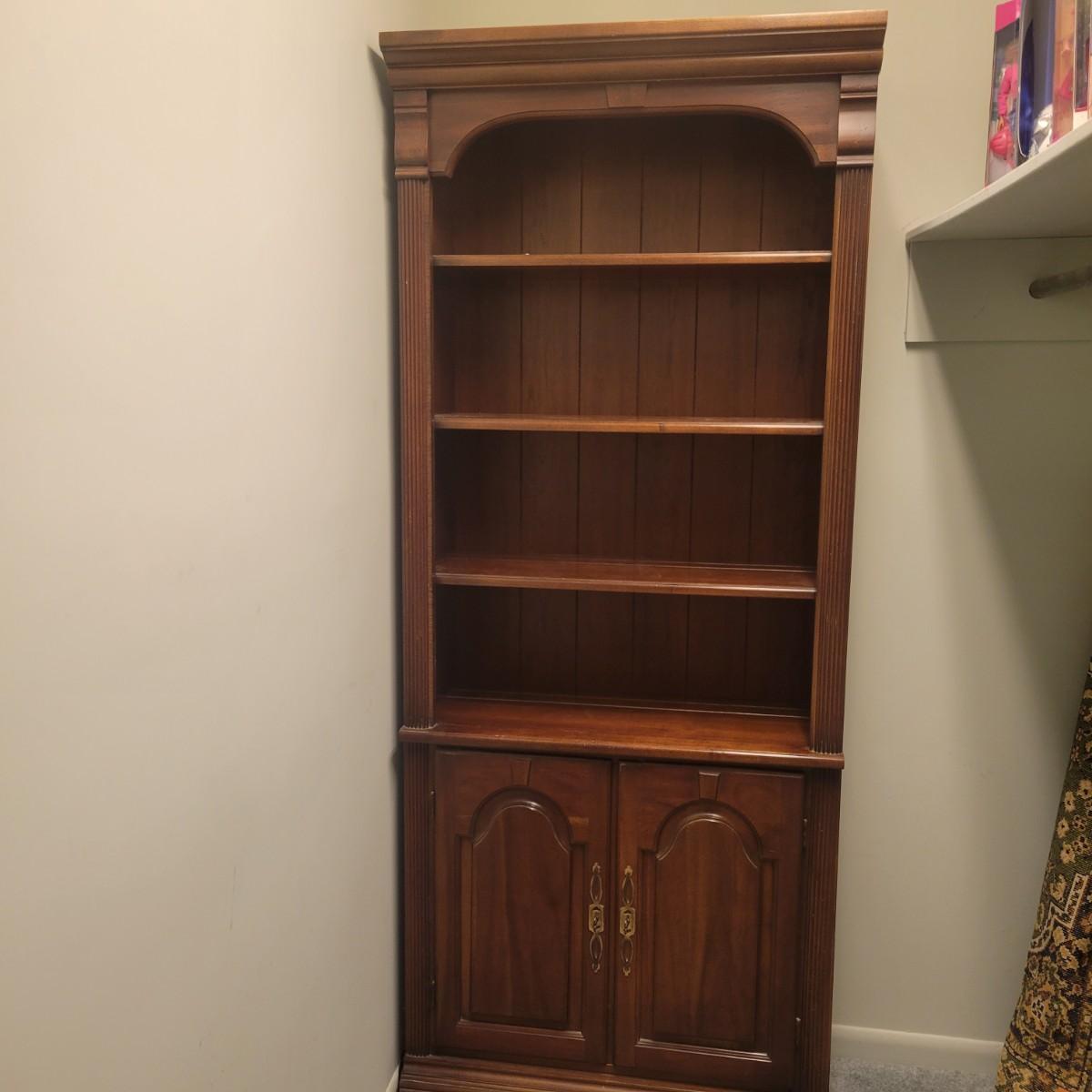 A large, solid wood bookcase that is in good condition with no notable damage. Bookcase features 3 unadjustable shelves that are grooved for displaying plates, brass hardware and a lower cabinet with one shelf. Bookcase measures approximately 31.5" x 14" x 78" Local pickup only