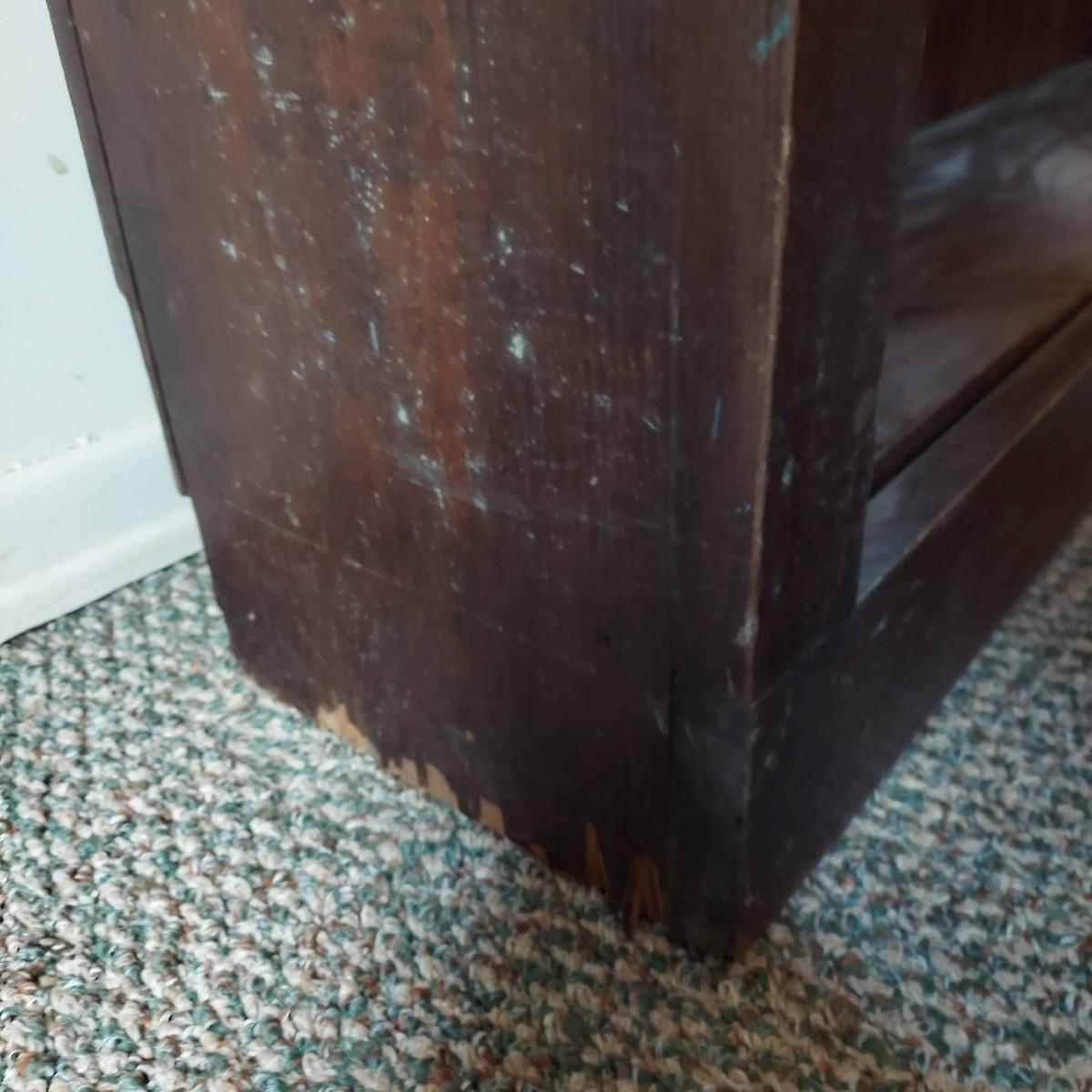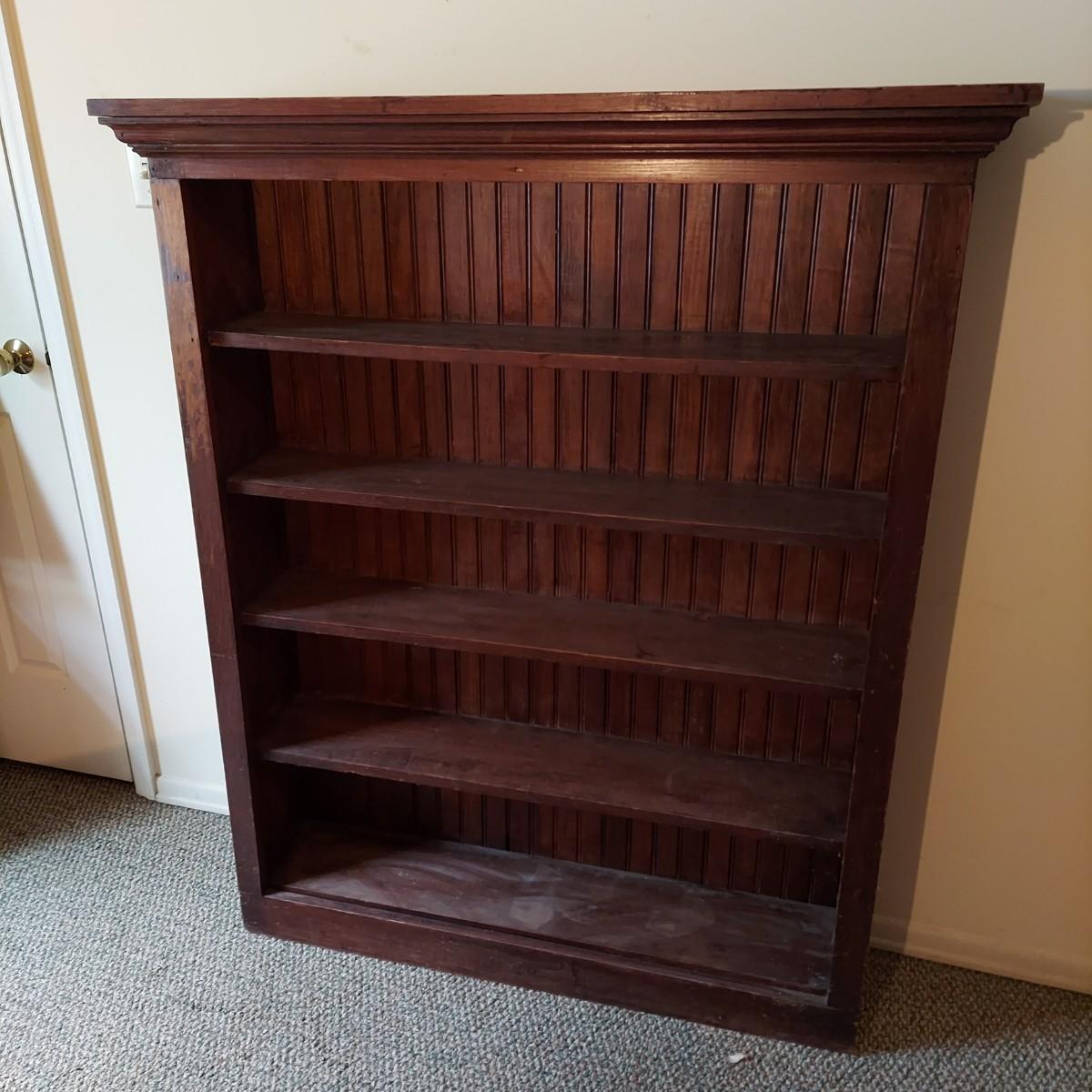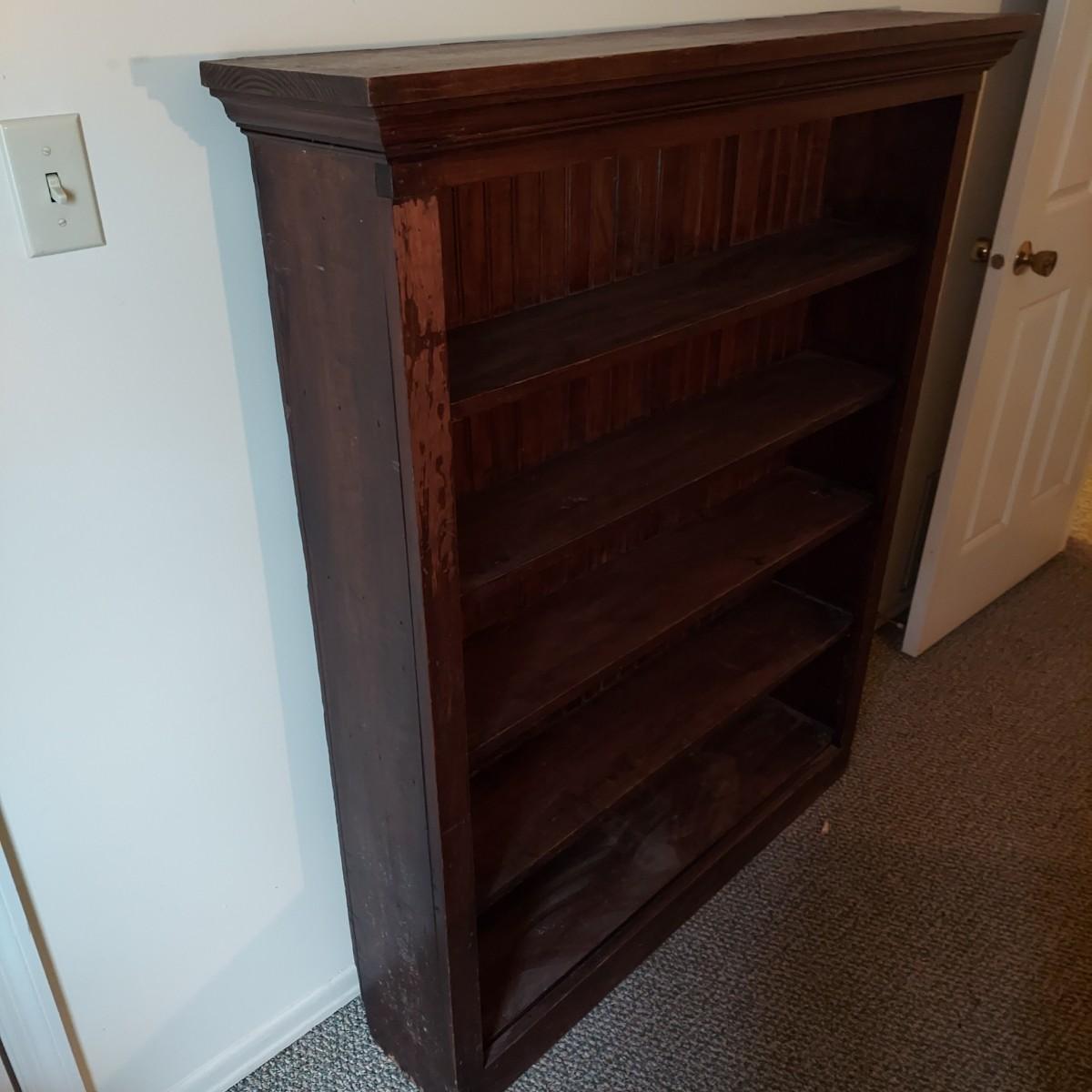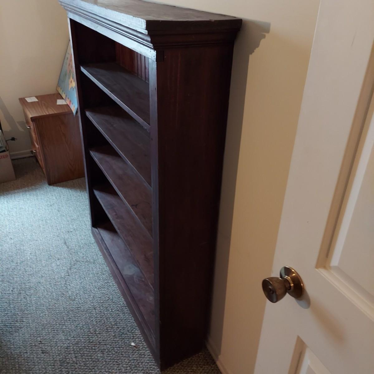 Solid wood bookcase with a dark finish. Has fixed shelves. Measures 45" x 11" x 54"H. There is a mottled appearance to the finish and some chipping on the bottom. Please see photos. Local Pickup Only