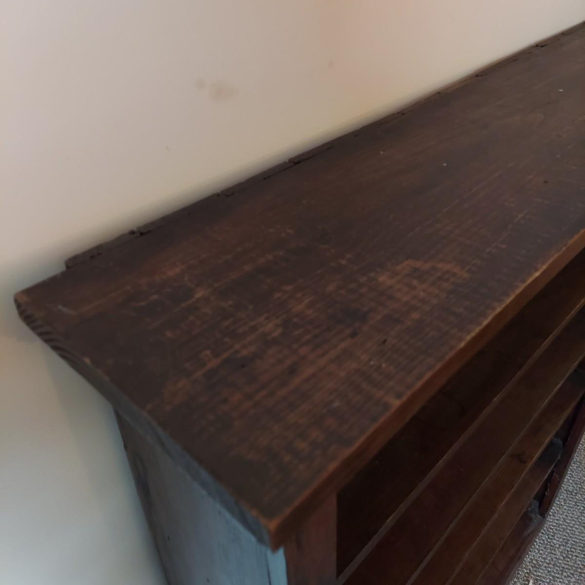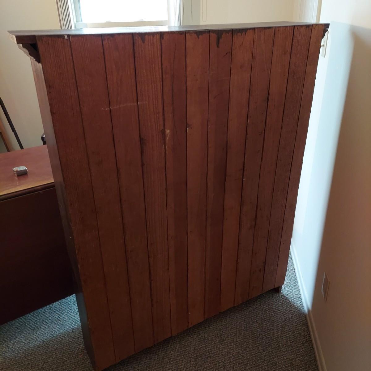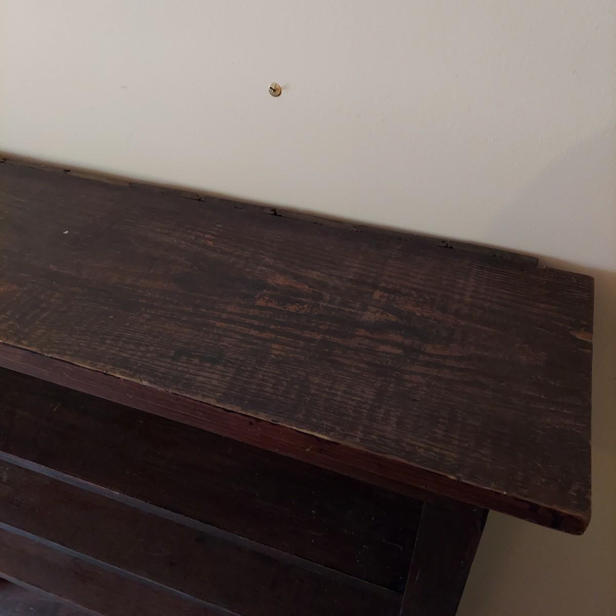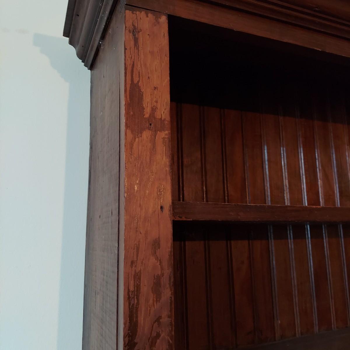 Solid wood bookcase with a dark finish. Has fixed shelves. Measures 45" x 11" x 54"H. There is a mottled appearance to the finish and some chipping on the bottom. Please see photos. Local Pickup Only