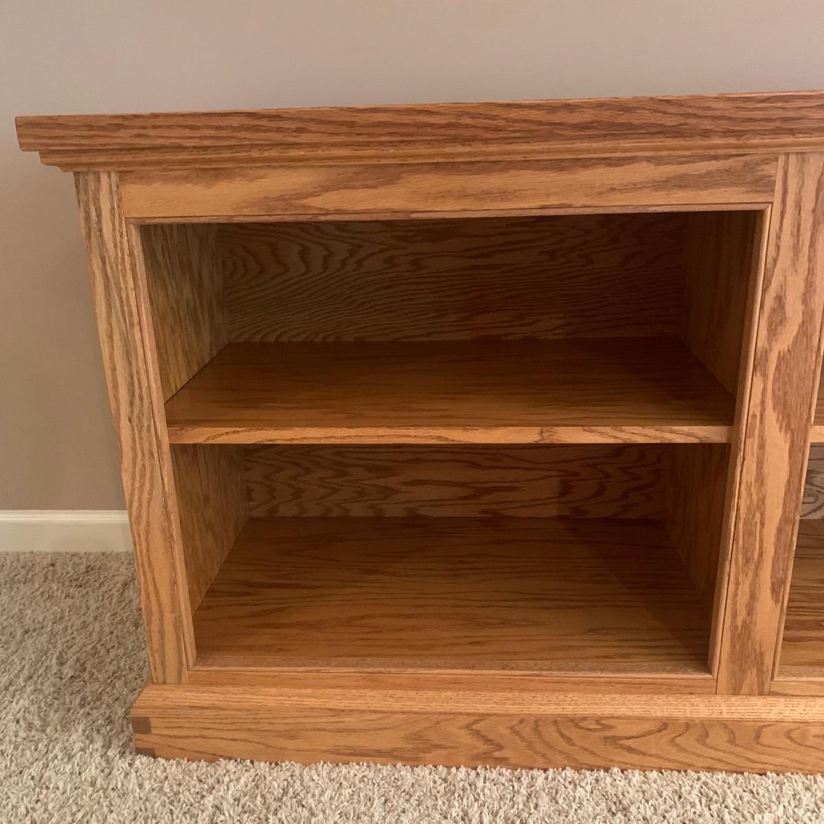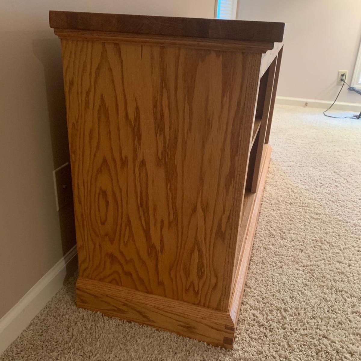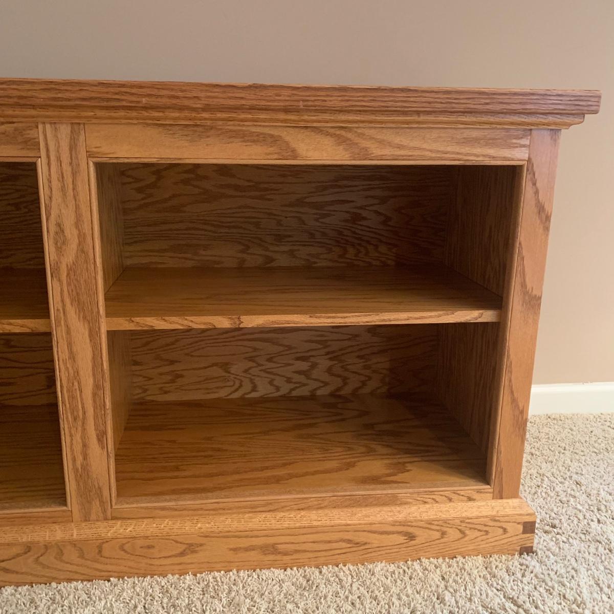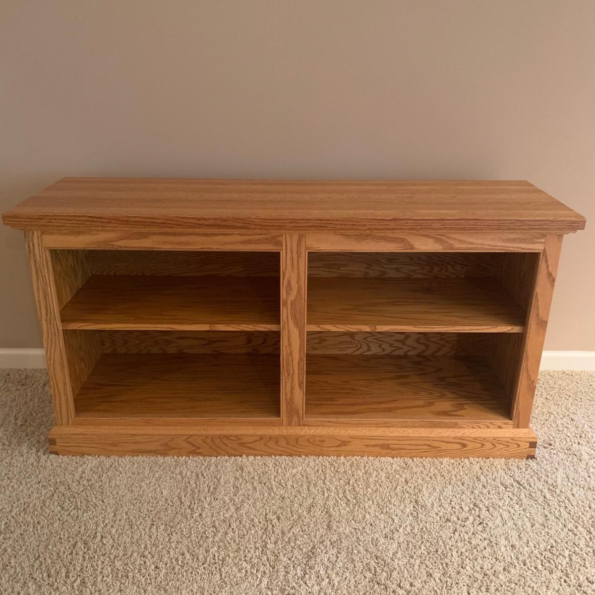 Solid wood bookcase with four shelves. Unit is crafted using dovetail joinery at the base. Item measures approximately 55" x 16.5" x 28"H. Local pickup only. Winning bidder must bring assistance to help move and load this item due to its weight and/or size. Item will need to be moved up two flights of stairs and throughout the home to the exit.