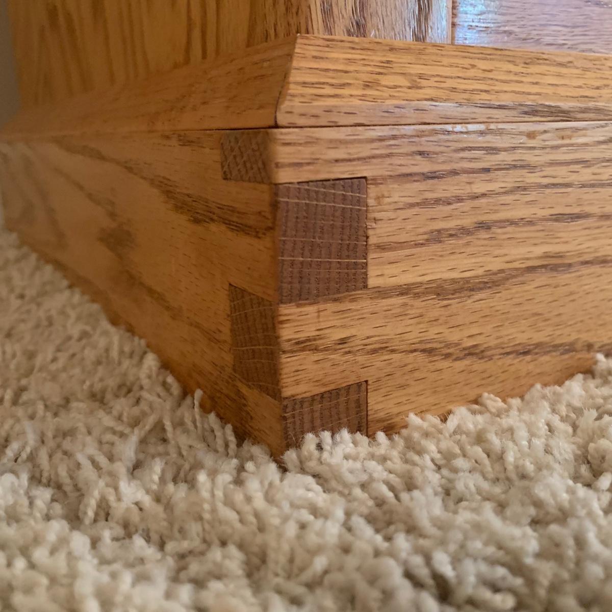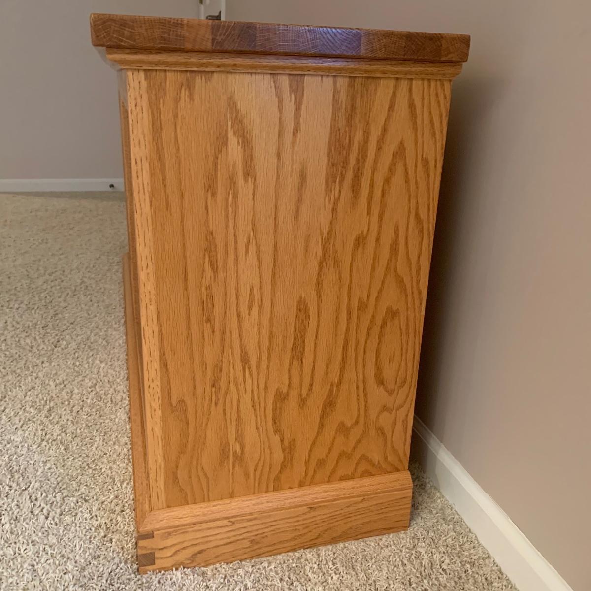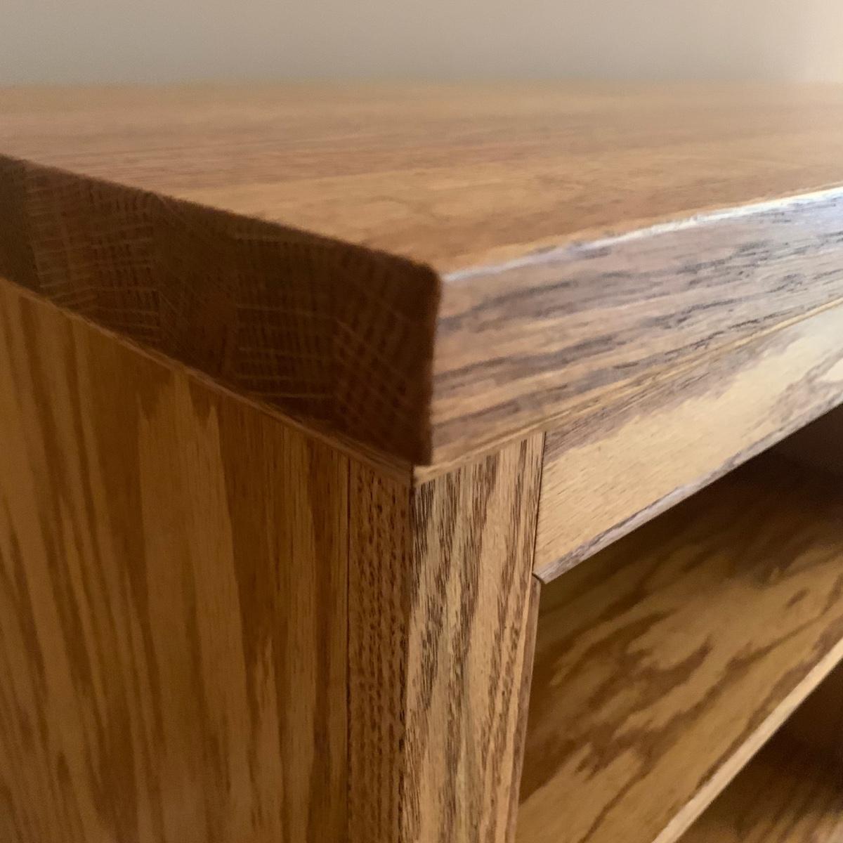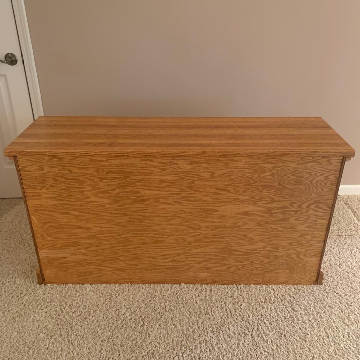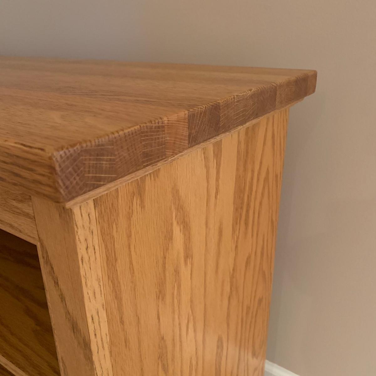 Solid wood bookcase with four shelves. Unit is crafted using dovetail joinery at the base. Item measures approximately 55" x 16.5" x 28"H. Local pickup only. Winning bidder must bring assistance to help move and load this item due to its weight and/or size. Item will need to be moved up two flights of stairs and throughout the home to the exit.
