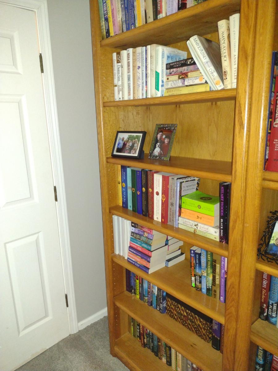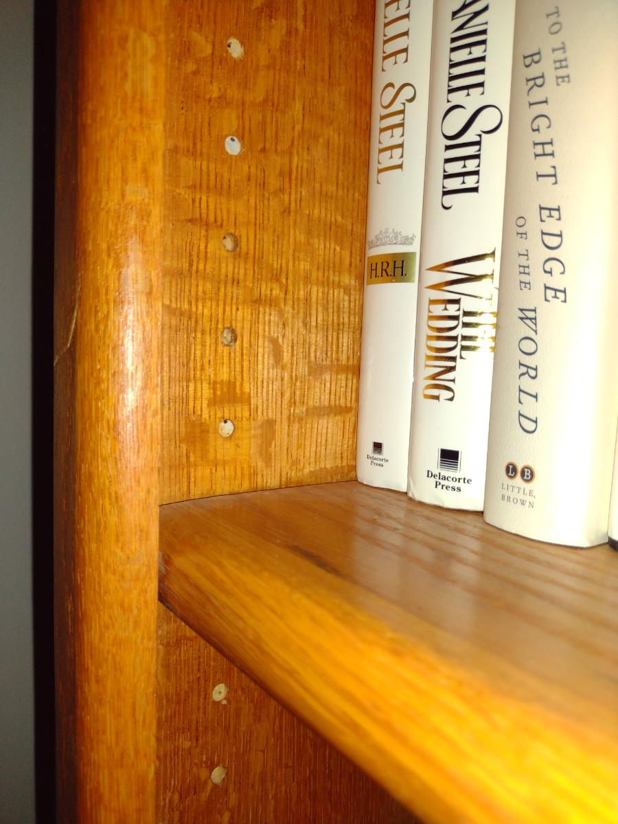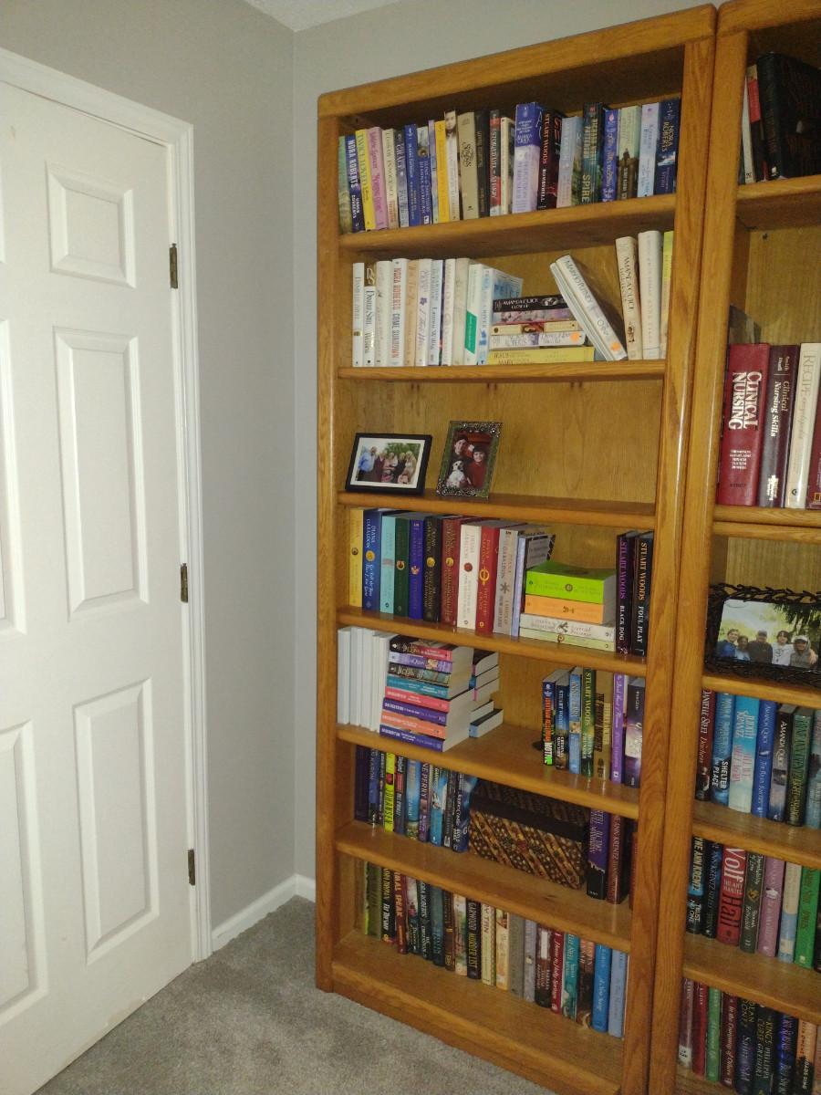 Solid Wood Bookshelf (Left Hand Side). Measures approx 33" wide, 12" deep, 84" tall. No contents included.
