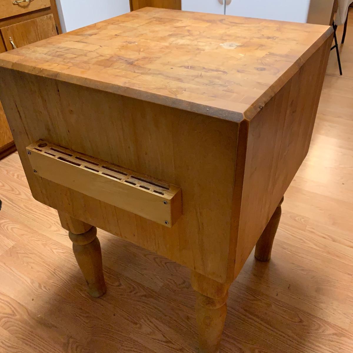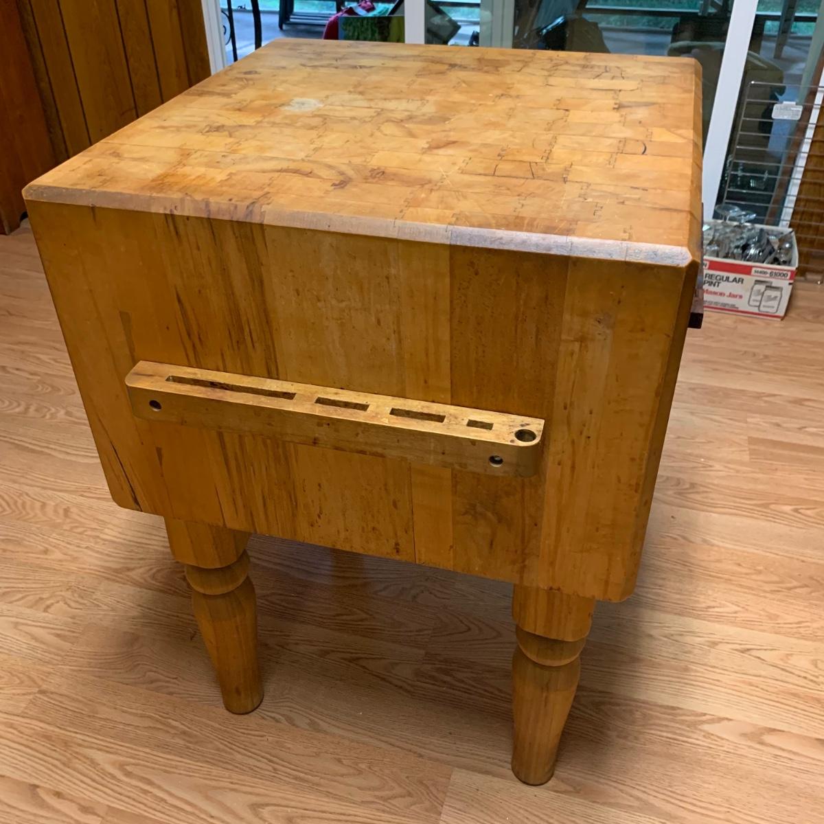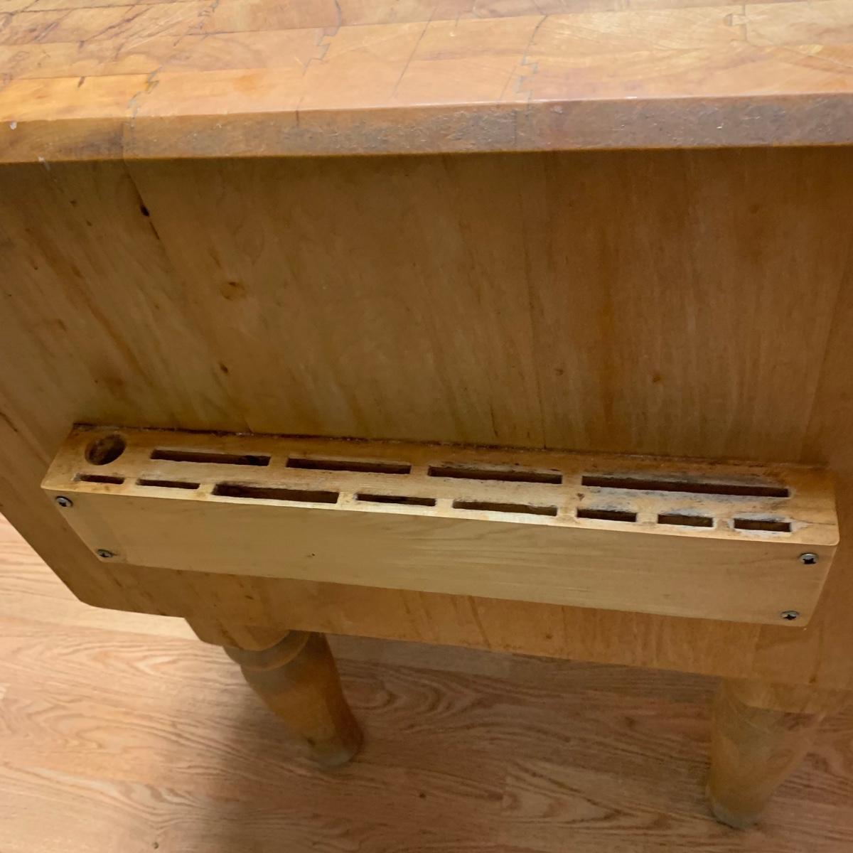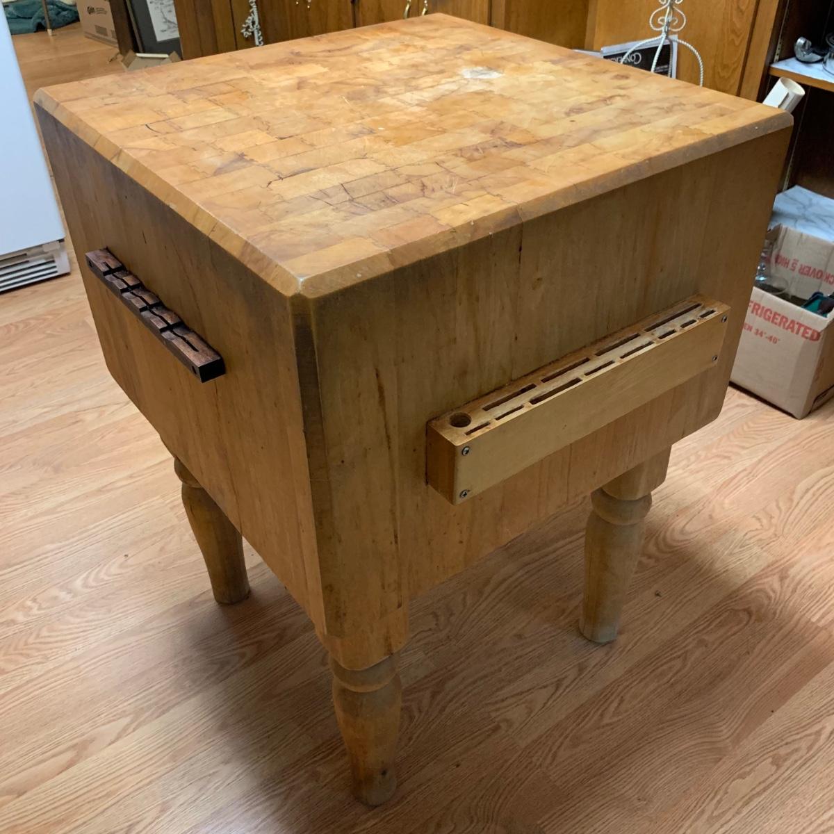Beautiful solid wood butchers block. Three sides have knife racks. Some knife marks are seen on the surface from use. The butchers block is in good condition and very sturdy. It measures 24.5” x 24.5” x 34”. It is extremely heavy. The winning bidder will need to bring help to move this item as it is both very heavy and up one flight of stairs. Local pickup only.