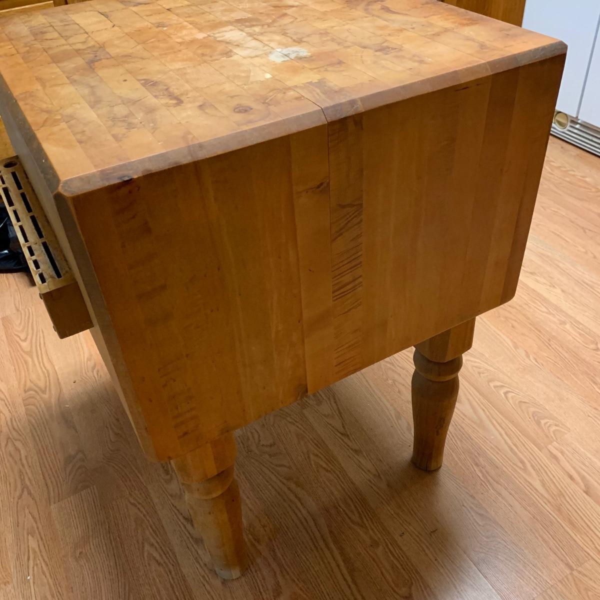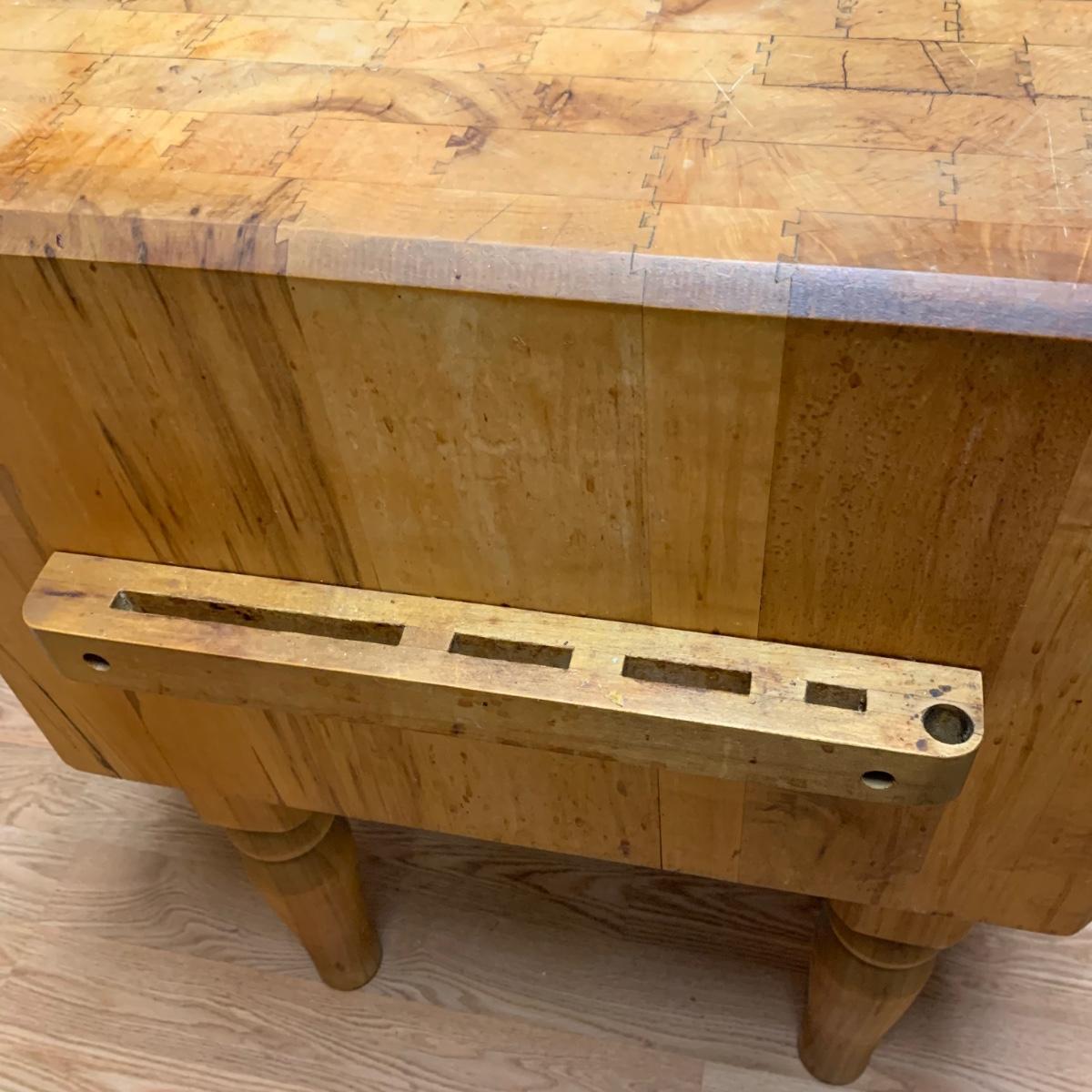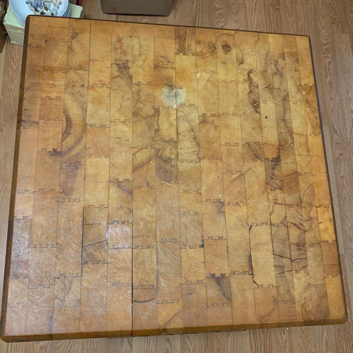 Beautiful solid wood butchers block. Three sides have knife racks. Some knife marks are seen on the surface from use. The butchers block is in good condition and very sturdy. It measures 24.5” x 24.5” x 34”. It is extremely heavy. The winning bidder will need to bring help to move this item as it is both very heavy and up one flight of stairs. Local pickup only.