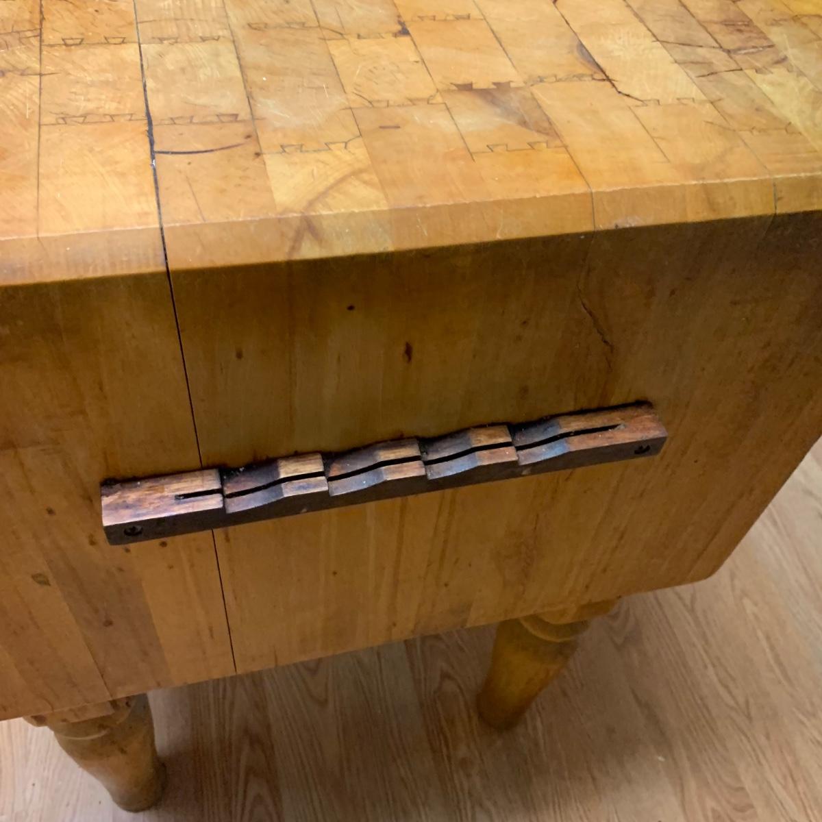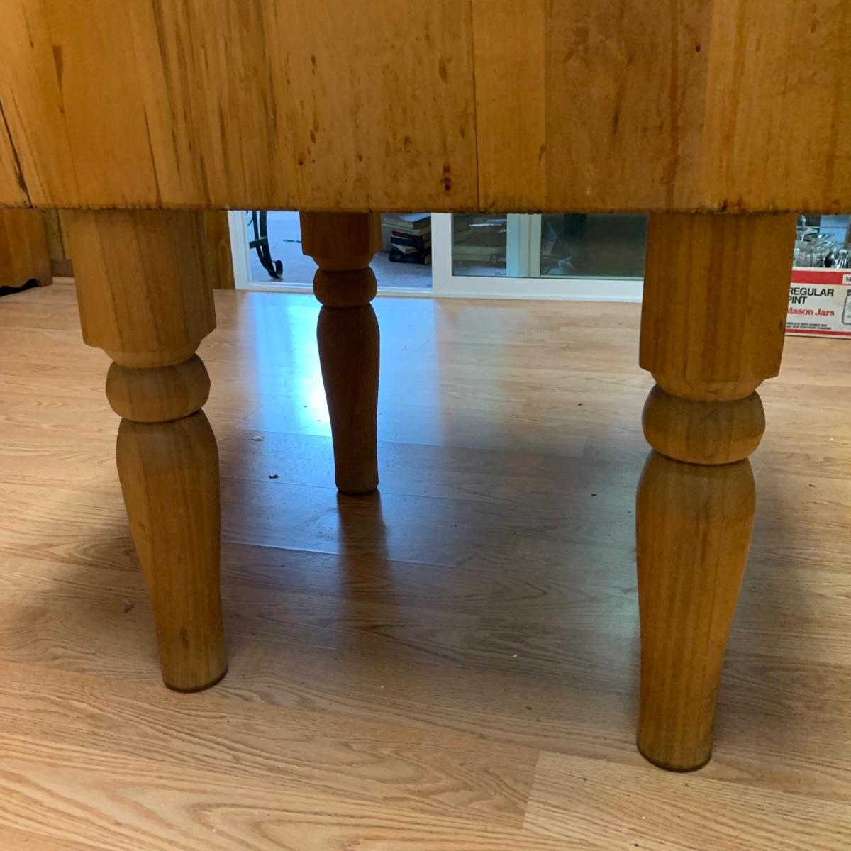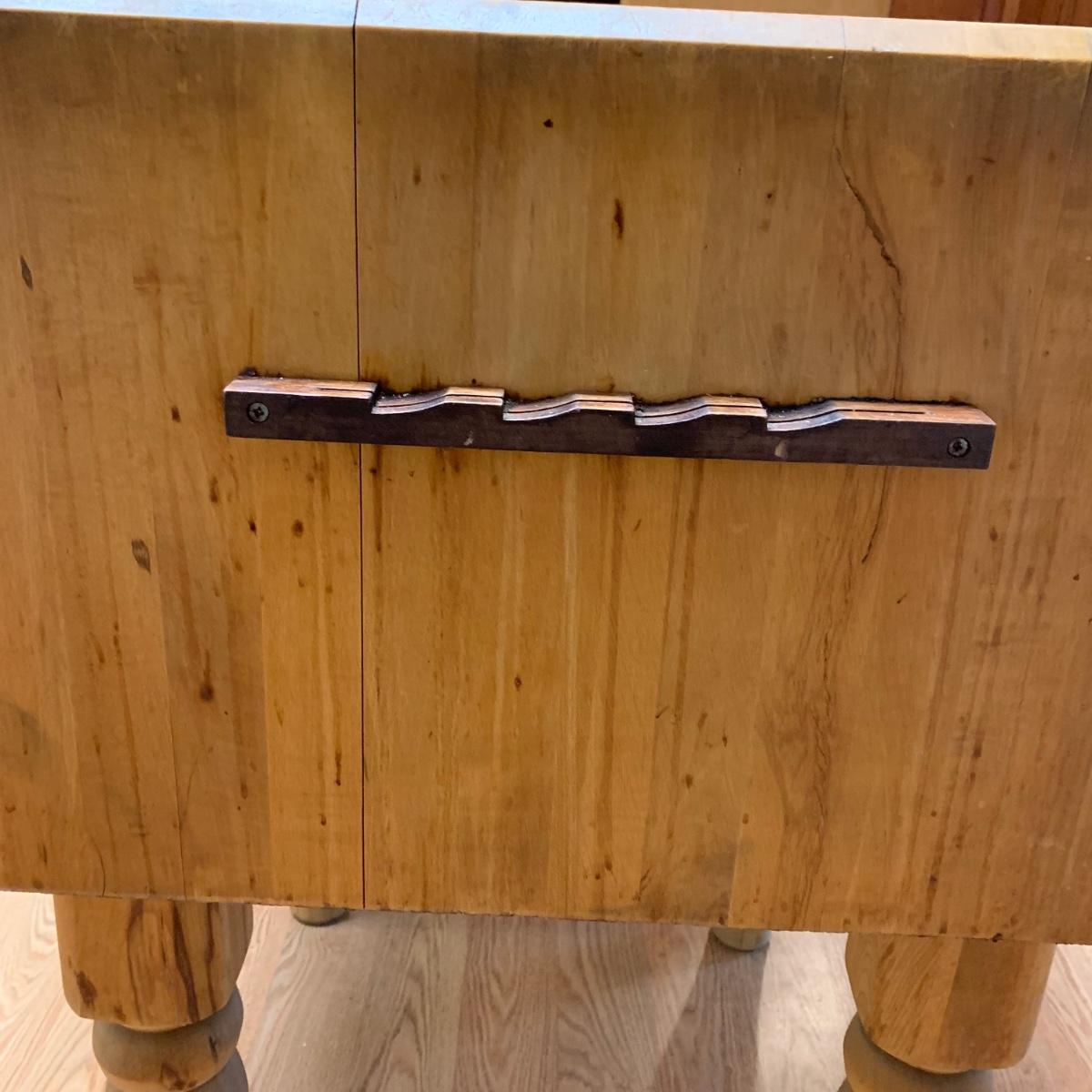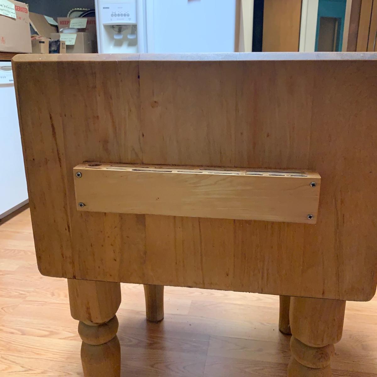 Beautiful solid wood butchers block. Three sides have knife racks. Some knife marks are seen on the surface from use. The butchers block is in good condition and very sturdy. It measures 24.5” x 24.5” x 34”. It is extremely heavy. The winning bidder will need to bring help to move this item as it is both very heavy and up one flight of stairs. Local pickup only.