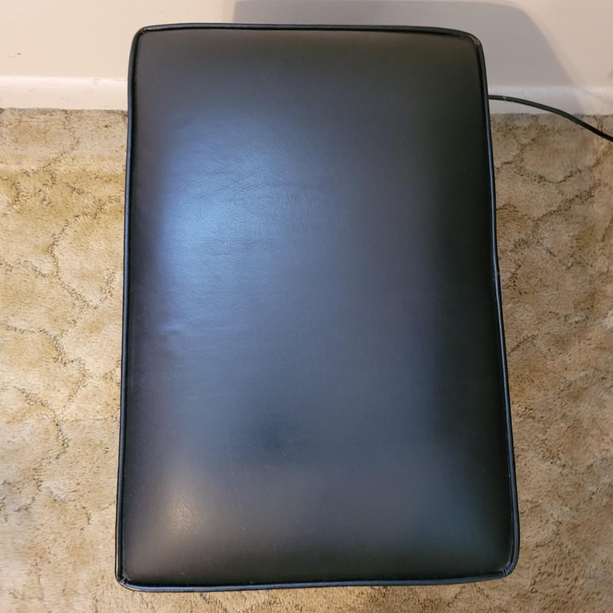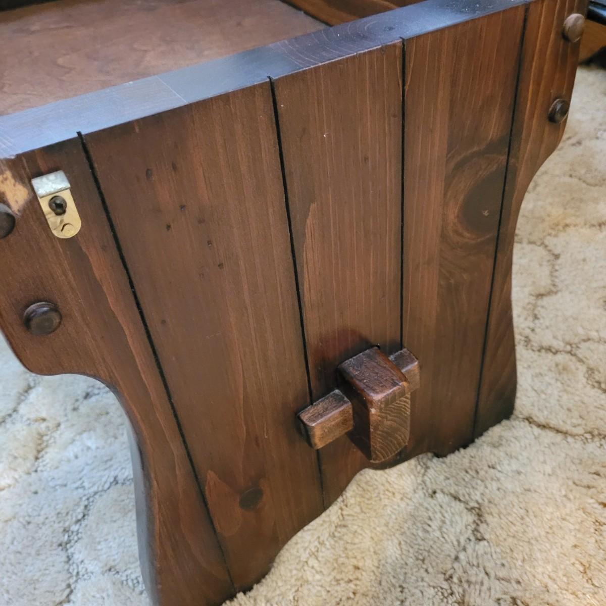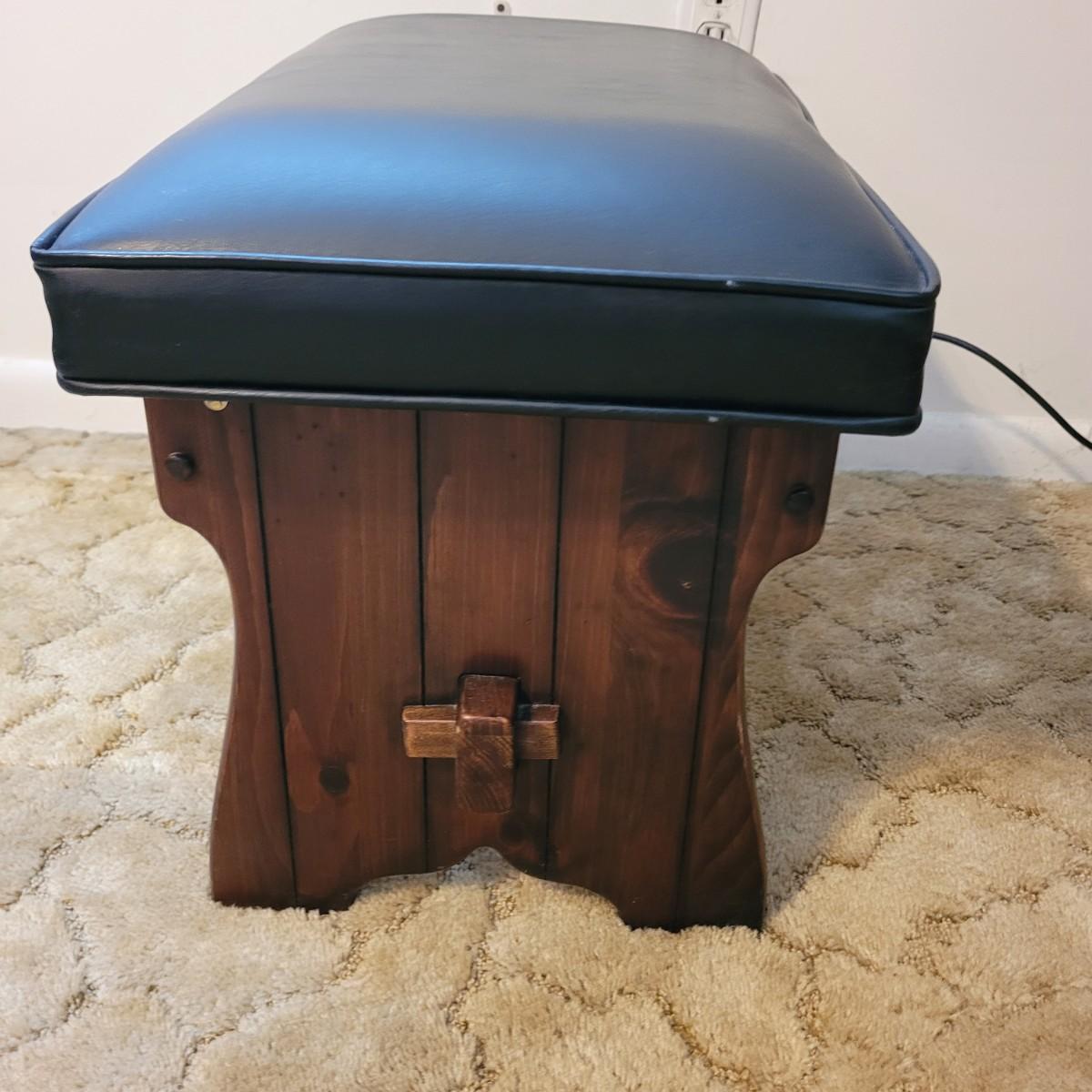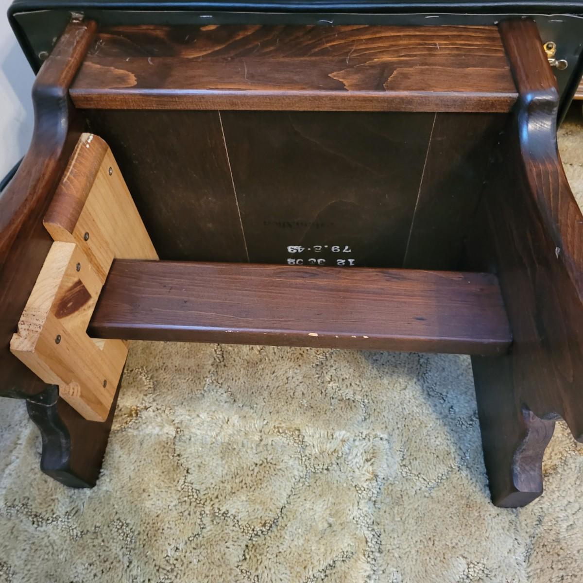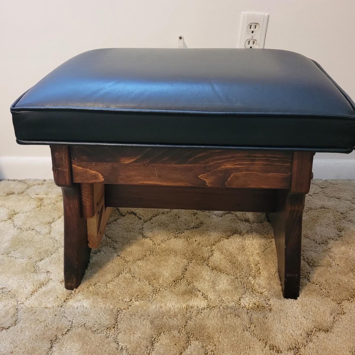 This lot includes a solid wood chair and wood and leather hidden storage footstool. The chair is stained dark wood and features ornate wood carvings. The chair measures 21" x 19" x 40"H with a seat height of 17". The footstool is made from wood and vinyl and measures 22" x 14" x 17"H. The top surface opens to reveal a storage area underneath.