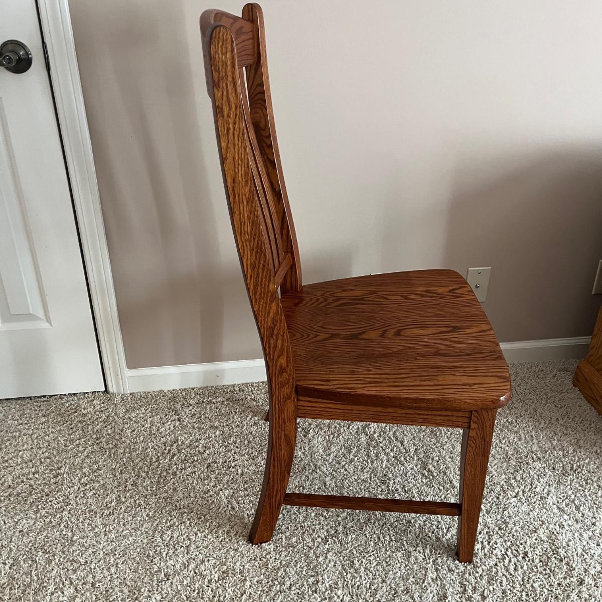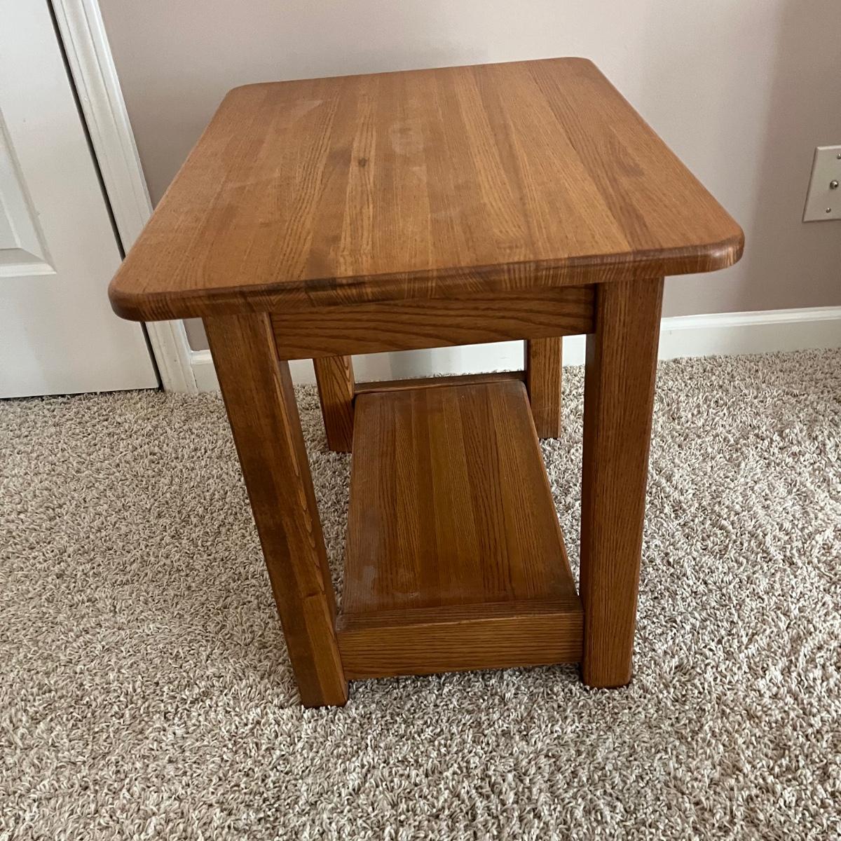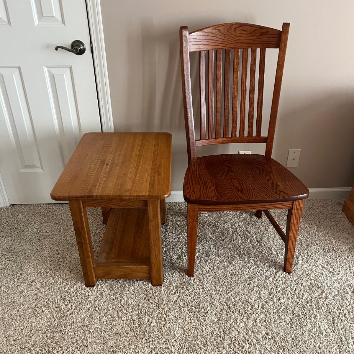 Lot includes a solid wood chair that measures 20” x 19” x 40”H with a seat height of 17.5”. Also includes a solid wood side table.