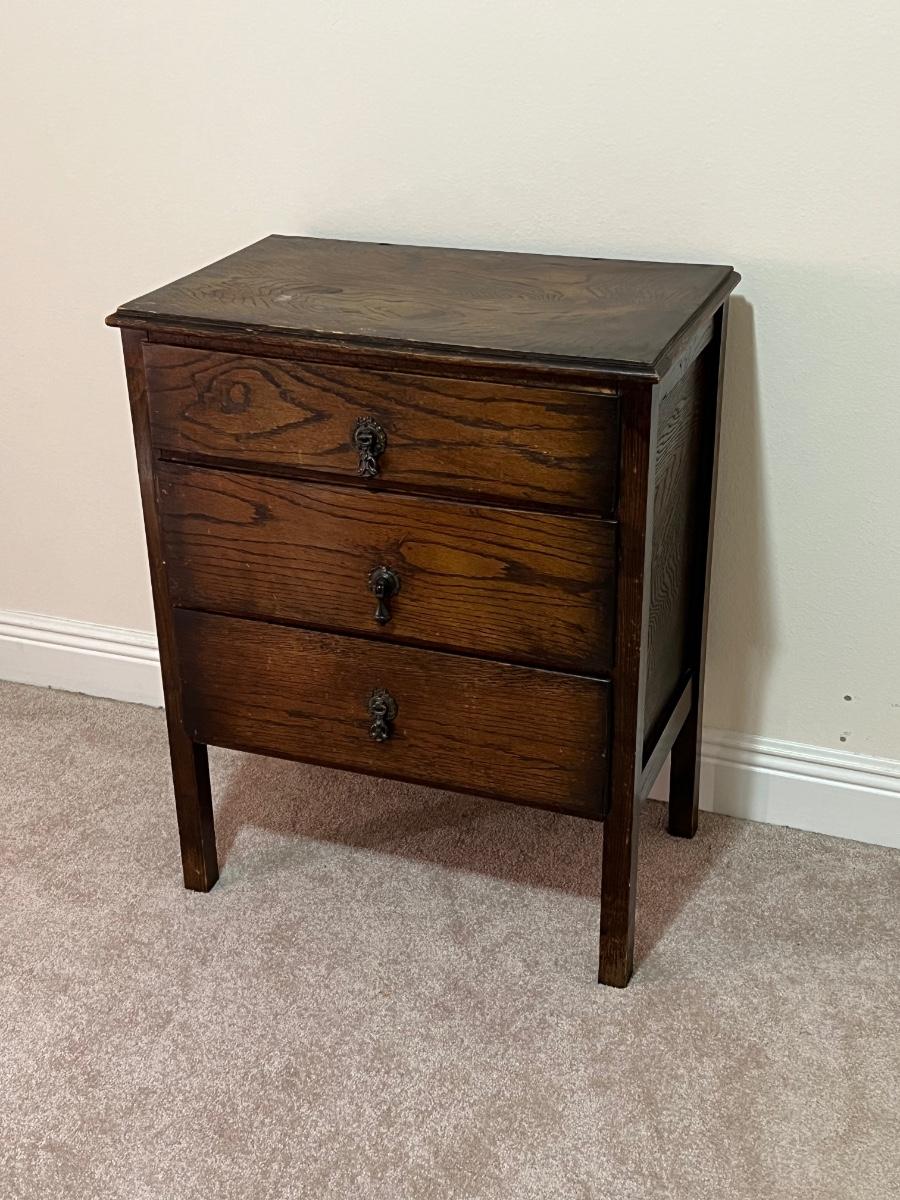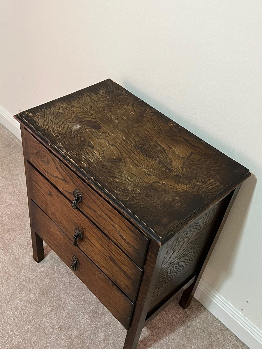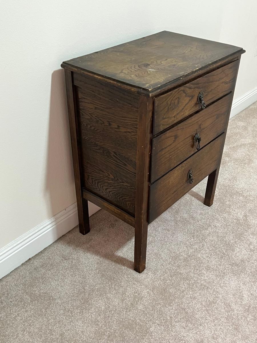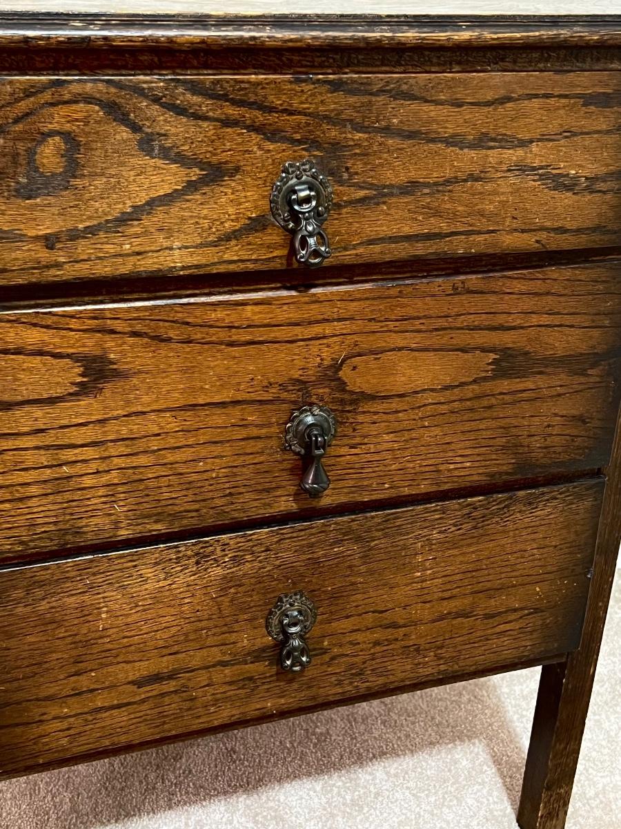 All drawers slide easily ~ Needs to be restored or painted ~ The top feels wavy from age, has no serious damage, see photos for condition ~ 30” H x 24” W x 15” D