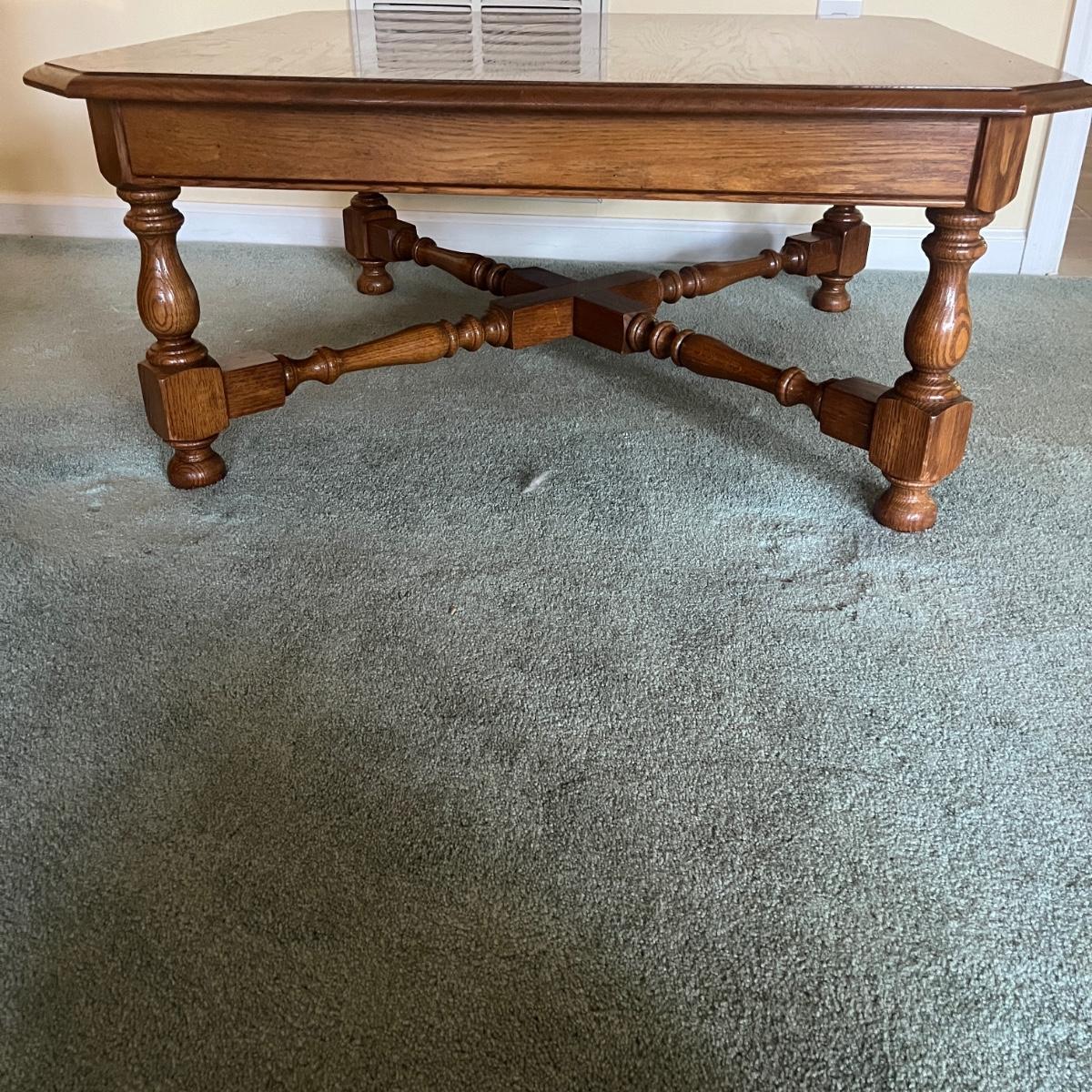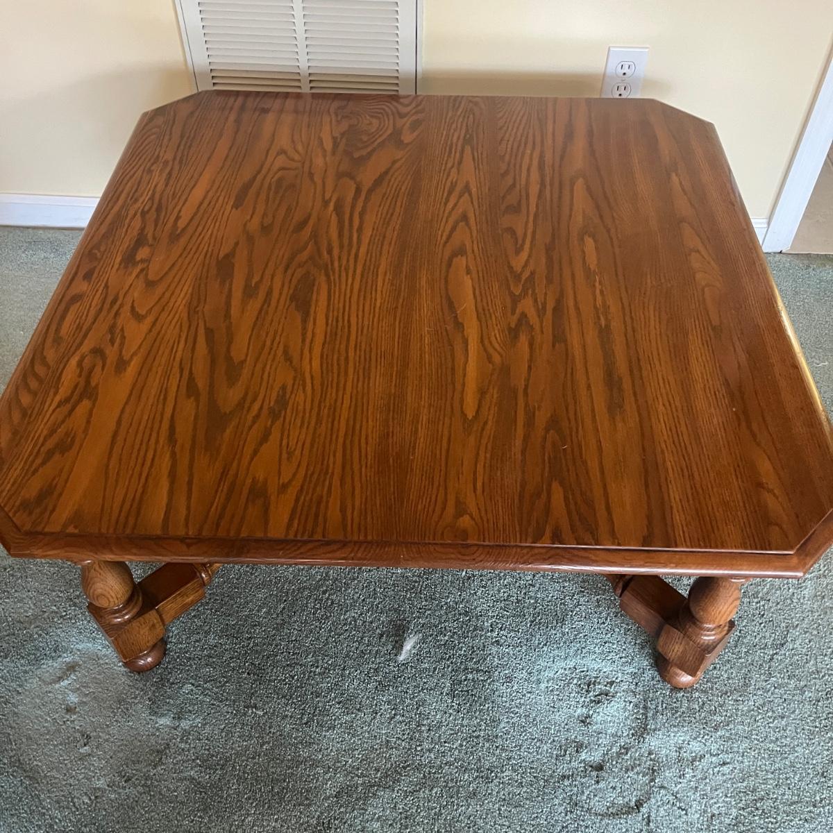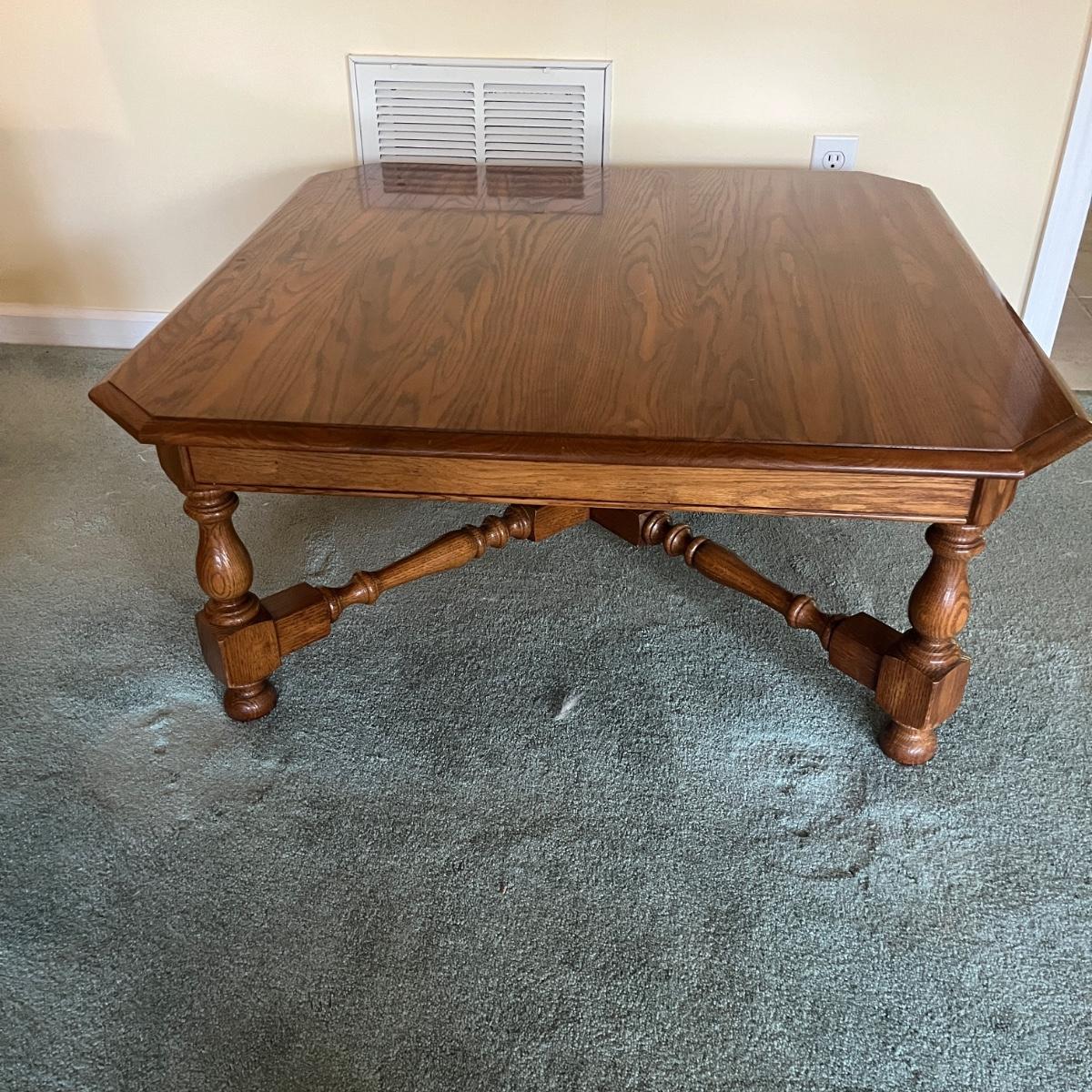 Lot includes a solid wood coffe table that measures 36.5” x 36.5” x 16”H. Brand marking is illegible, see pictures. Table is down one flight of stairs.