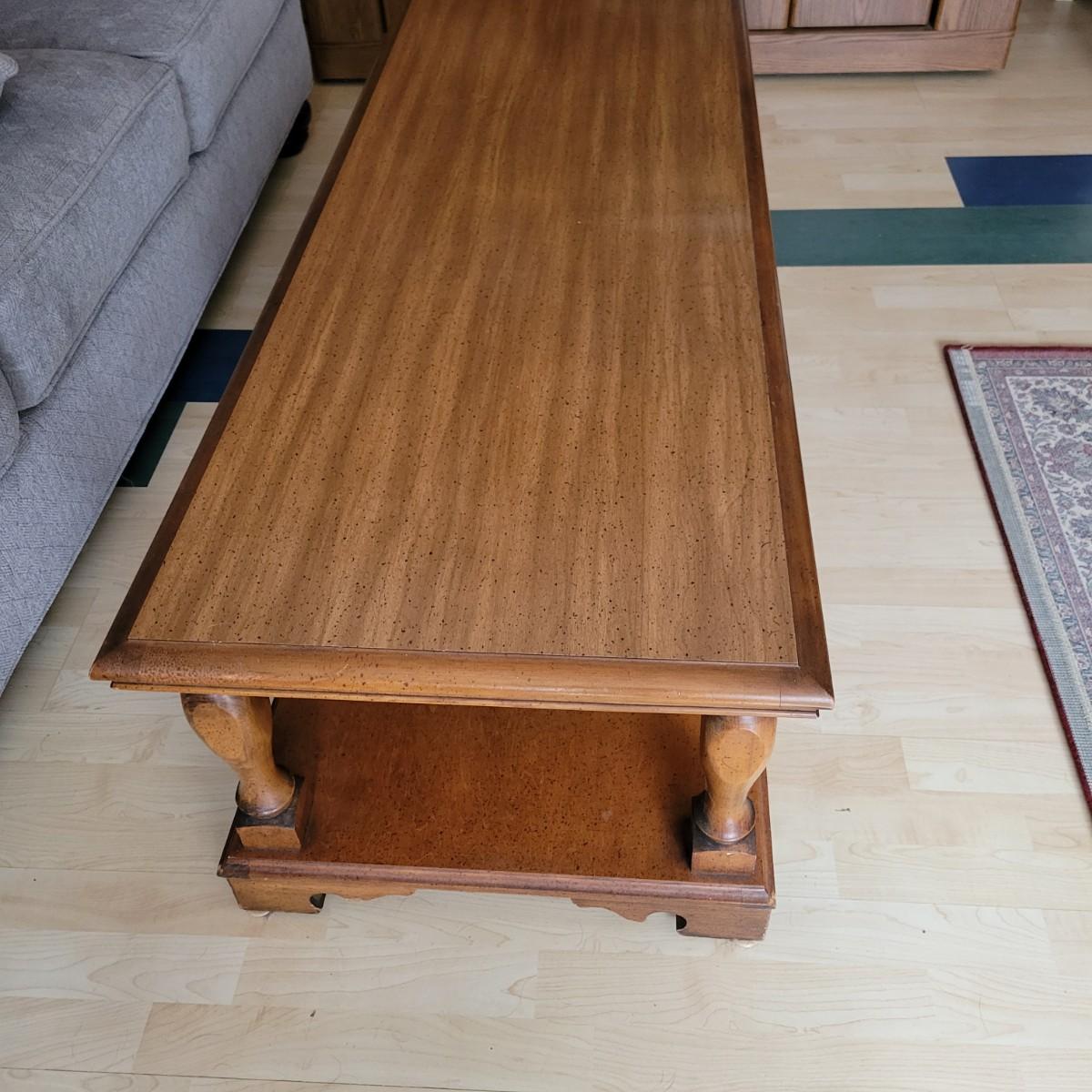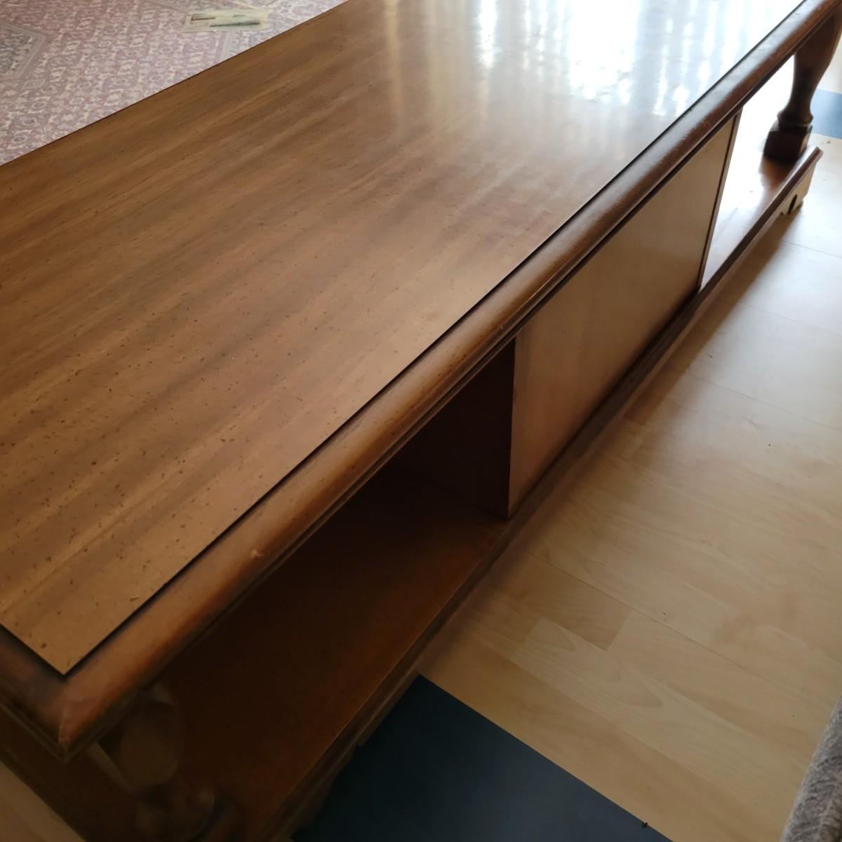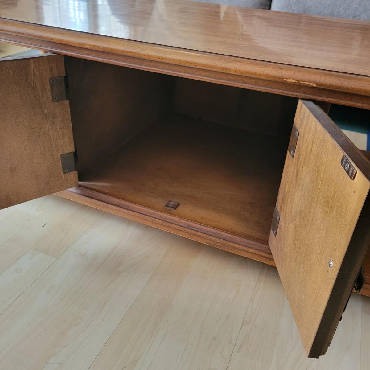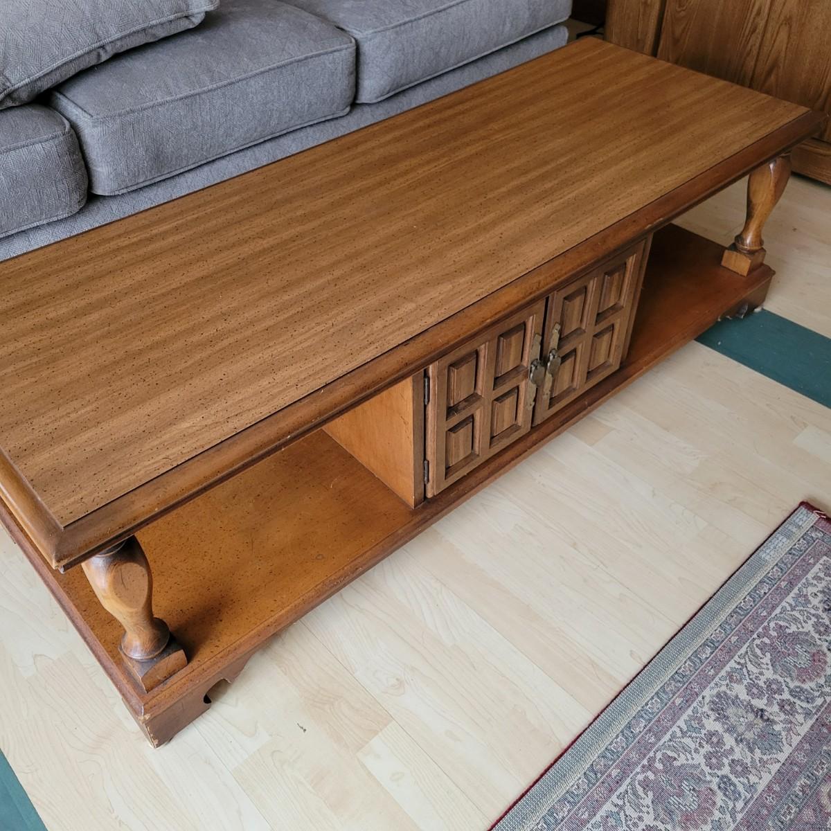 A wooden coffee table in good condition. This solid wood coffee table is open on the ends, has two doors that open to a cabinet, and has brass hardware. It has some blemishes. Measures approximately 56" x 21" x 17". Local pickup only. Winning bidder must bring assistance to help move and load this item due to its weight and/or size.