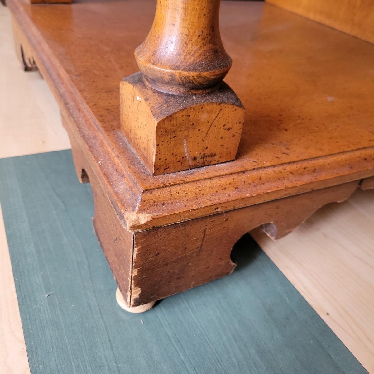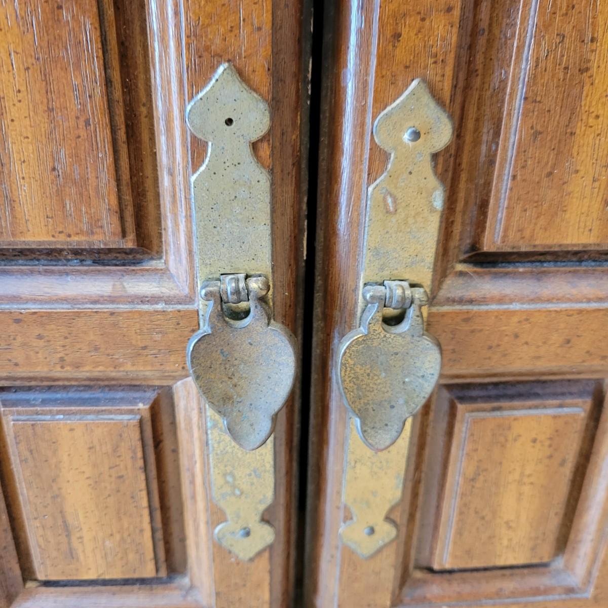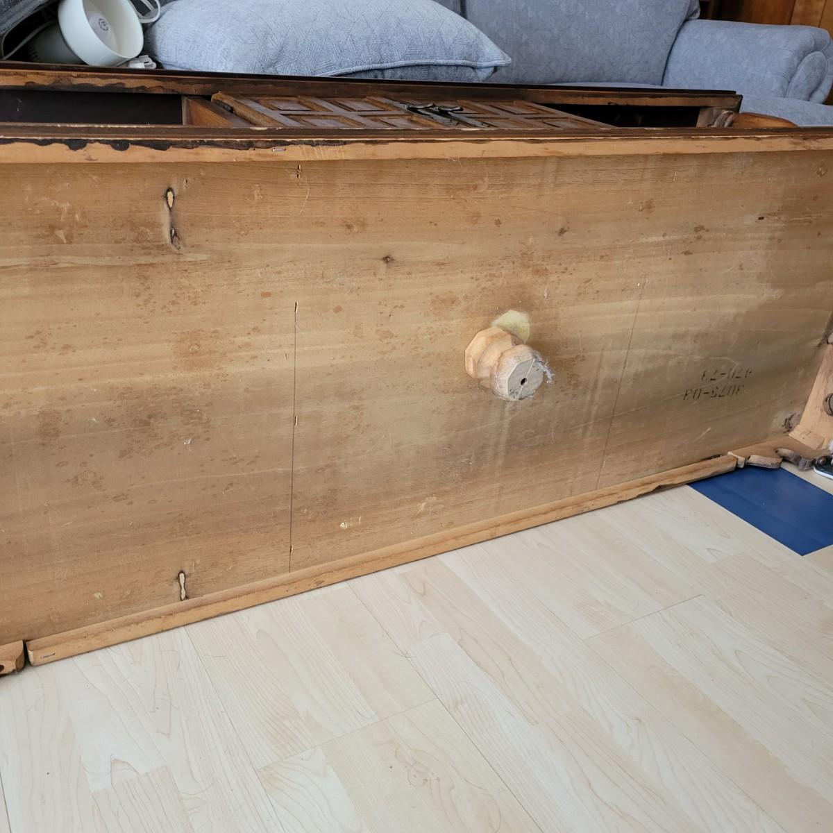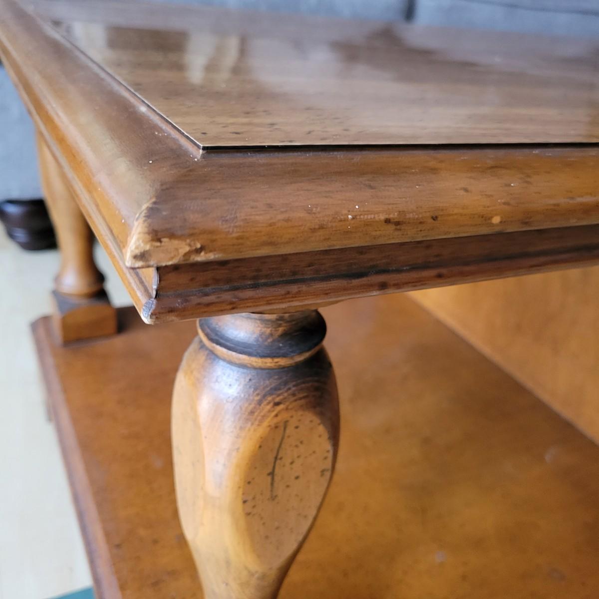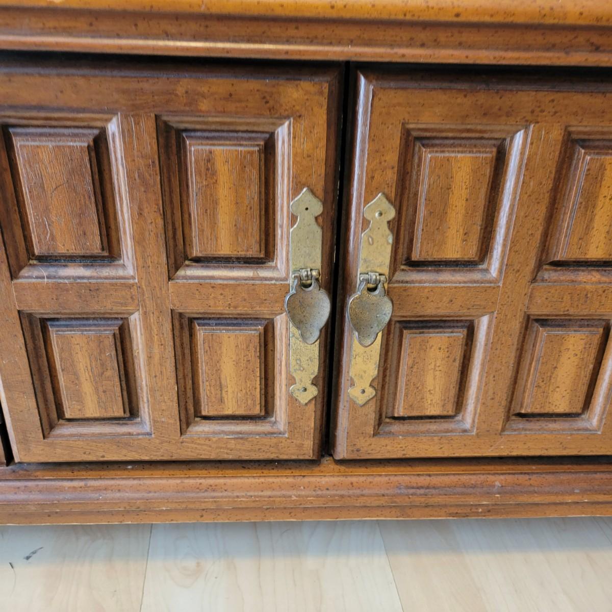 A wooden coffee table in good condition. This solid wood coffee table is open on the ends, has two doors that open to a cabinet, and has brass hardware. It has some blemishes. Measures approximately 56" x 21" x 17". Local pickup only. Winning bidder must bring assistance to help move and load this item due to its weight and/or size.