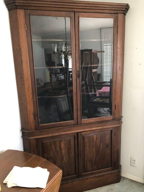Solid Wood Corner China Cabinet, Large 40' across, 6' high, glass doors, mahogany or walnut