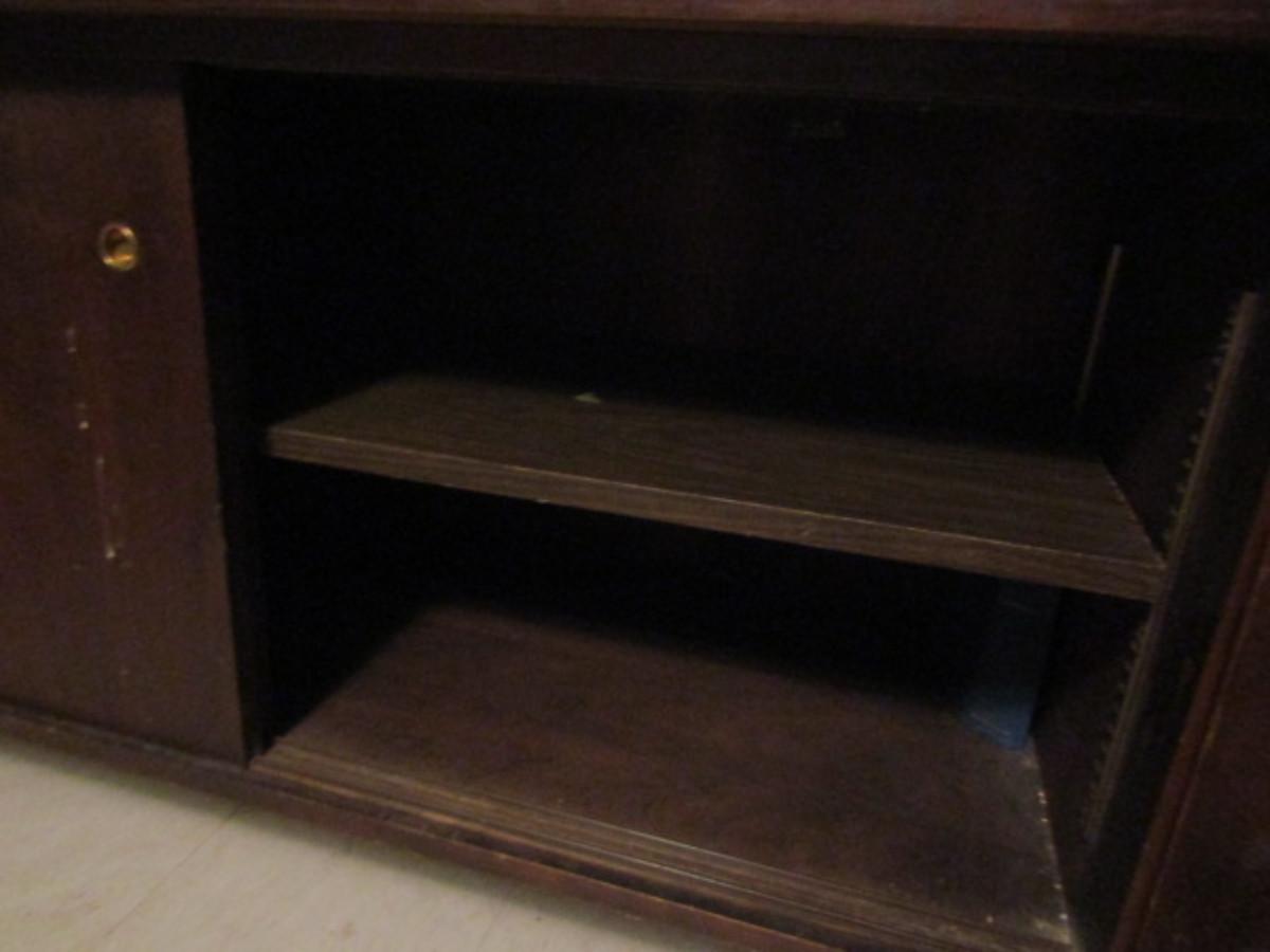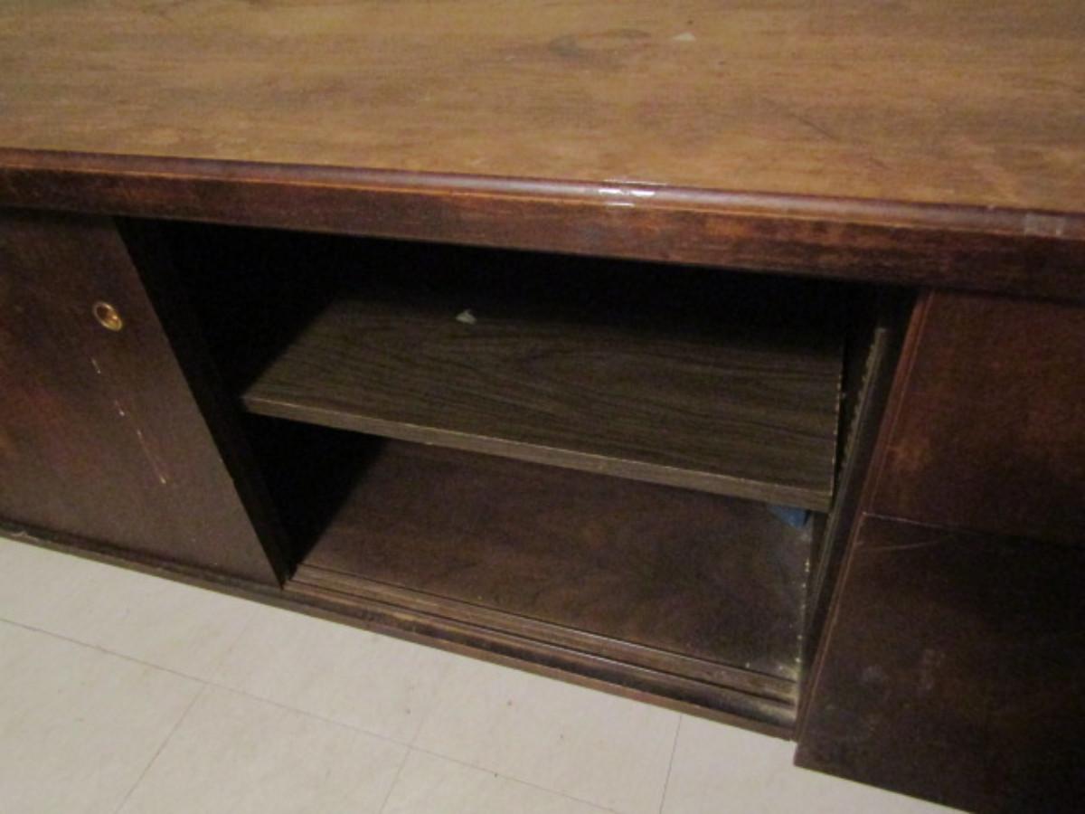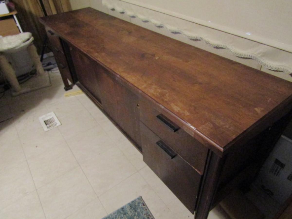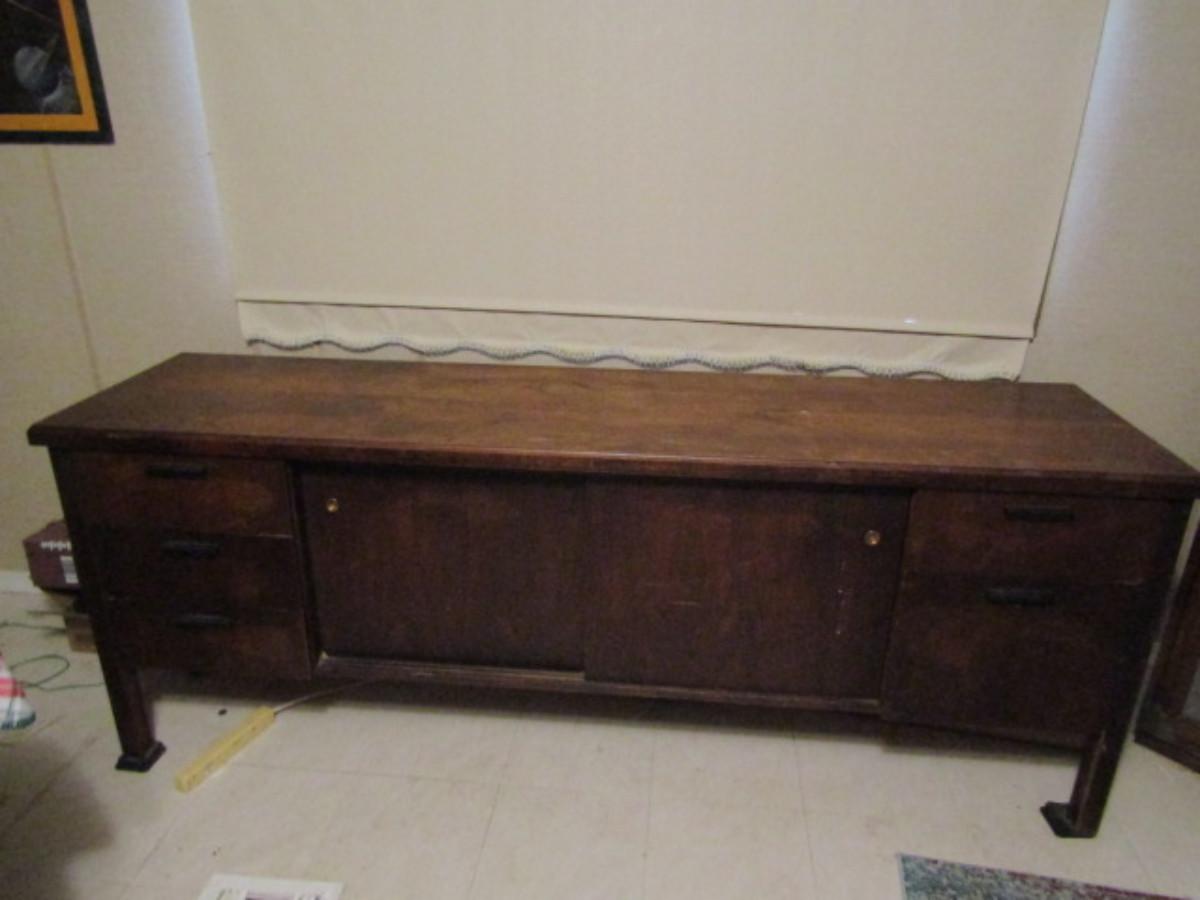 Solid Wood Credenza- Approx 77 1/2" Long. Total of 5 drawers and center storage compartment with sliding doors. Shelf support pegs are missing and need to be replaced.