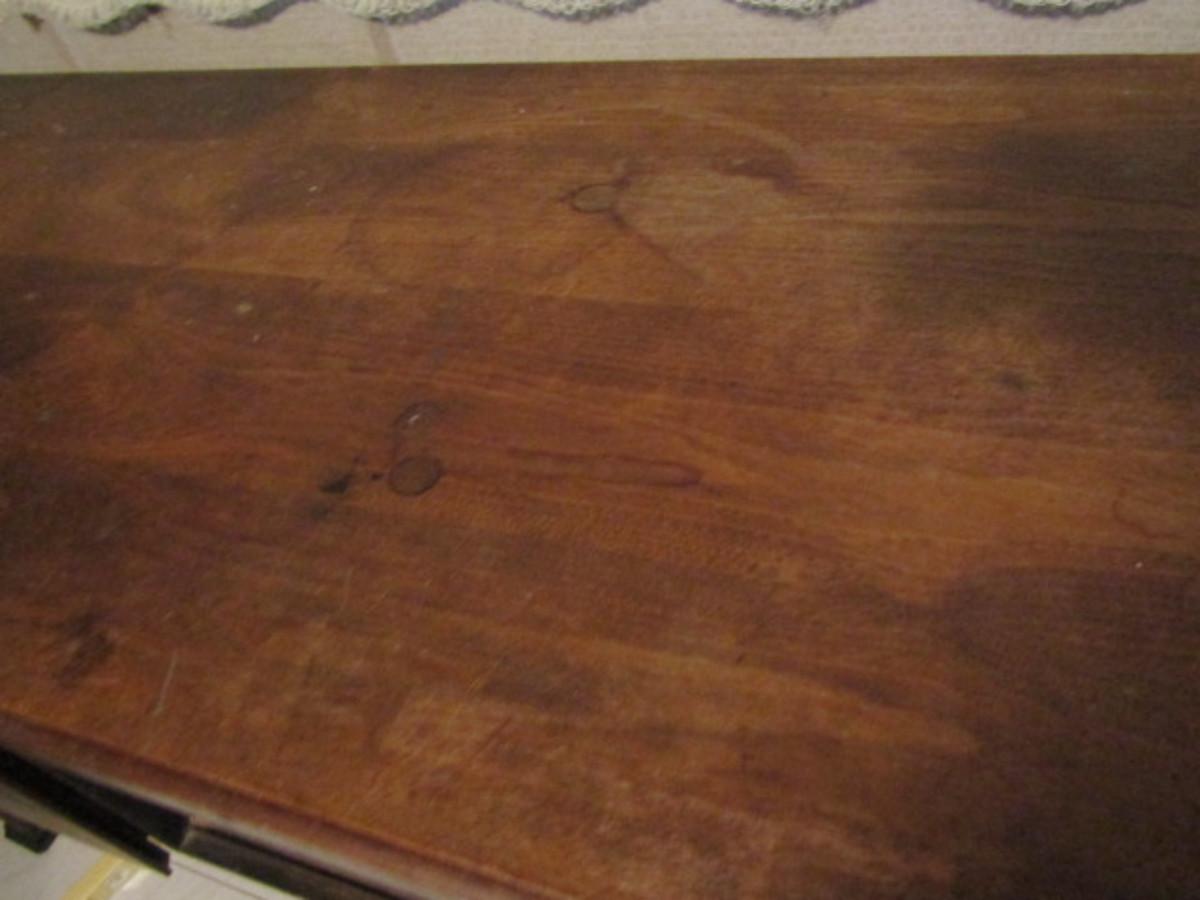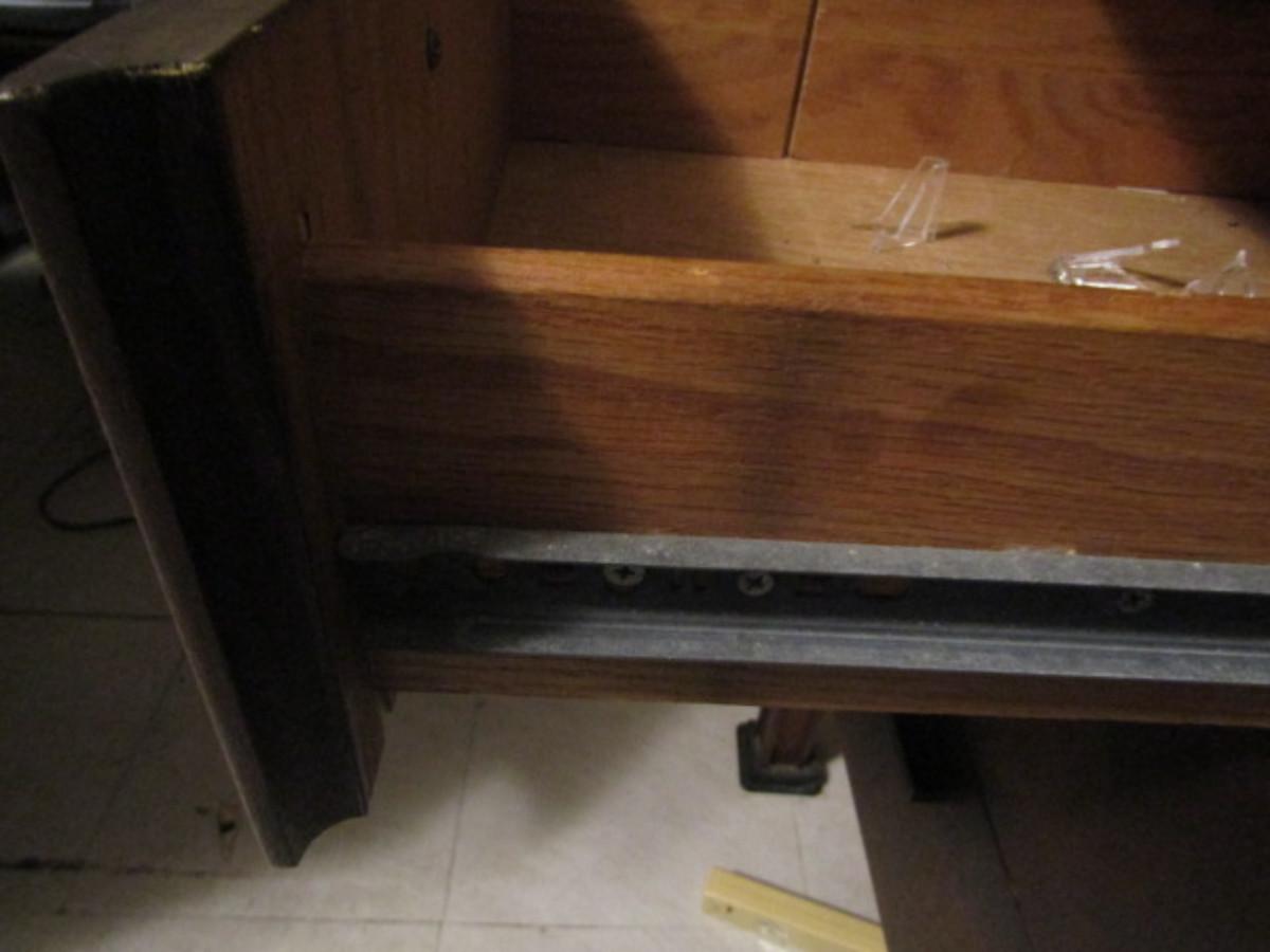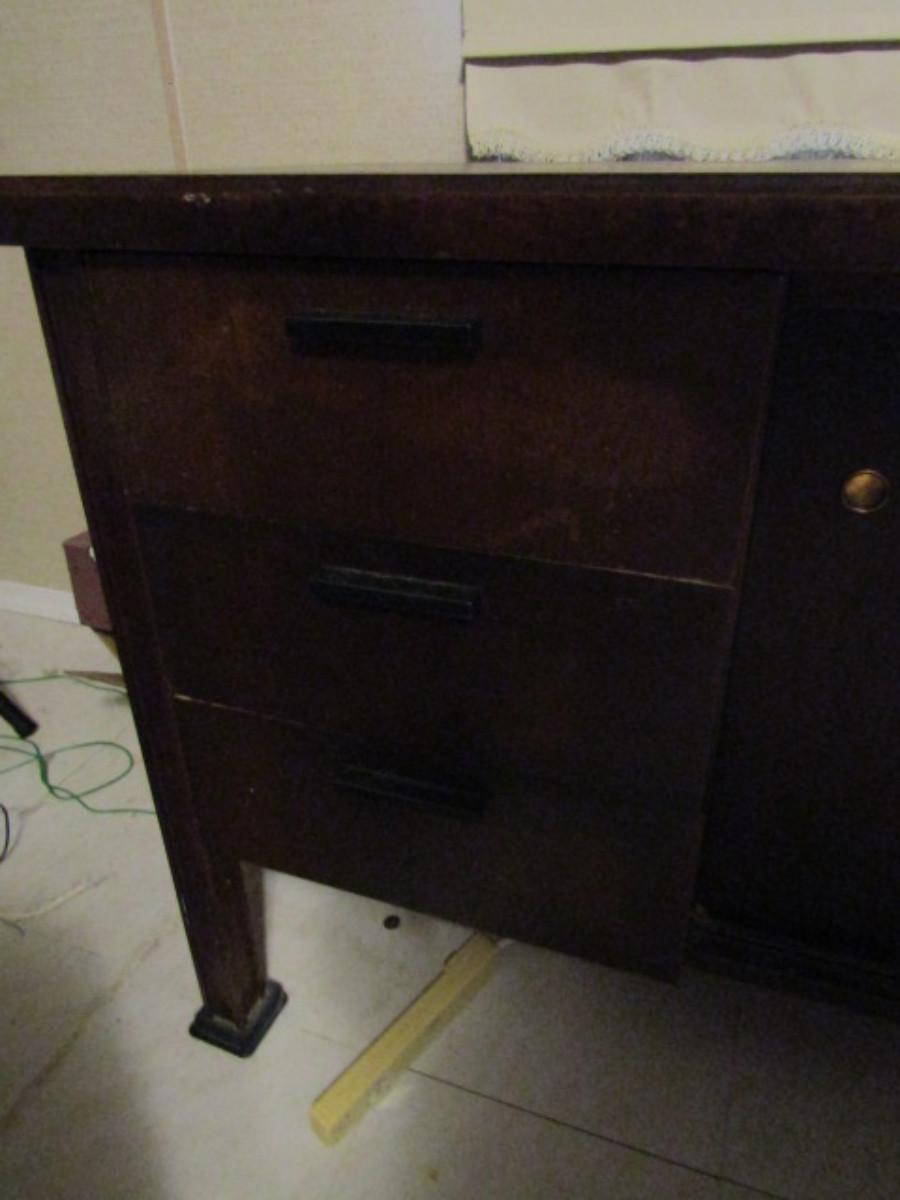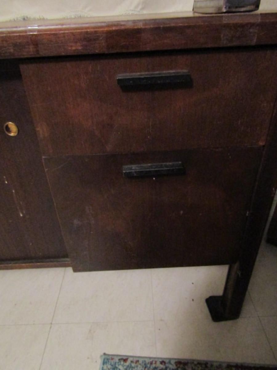 Solid Wood Credenza- Approx 77 1/2" Long. Total of 5 drawers and center storage compartment with sliding doors. Shelf support pegs are missing and need to be replaced.