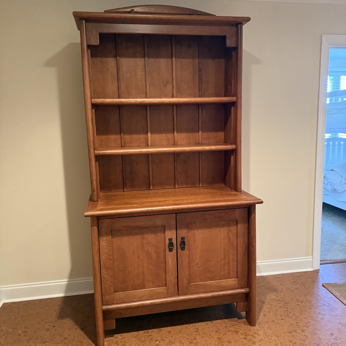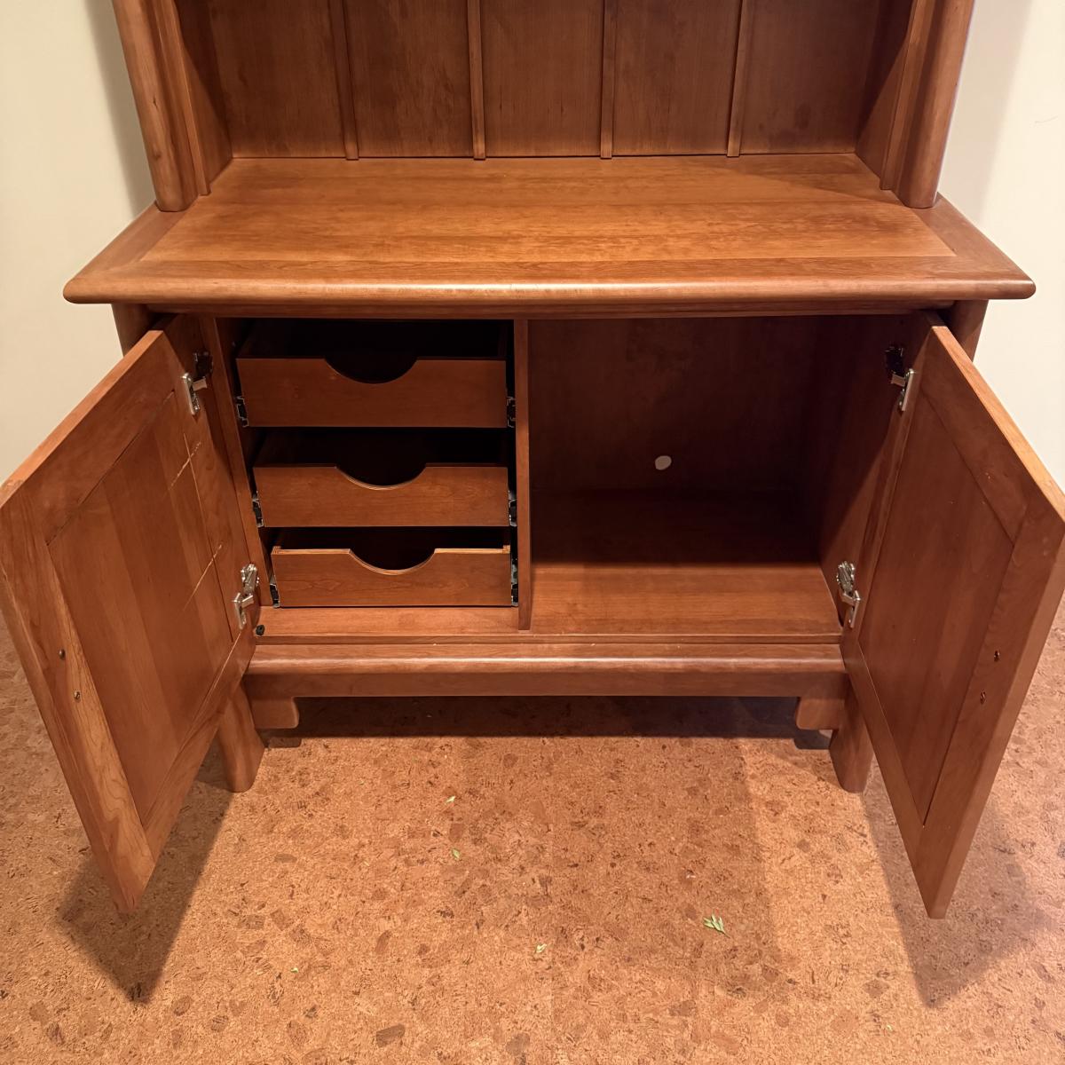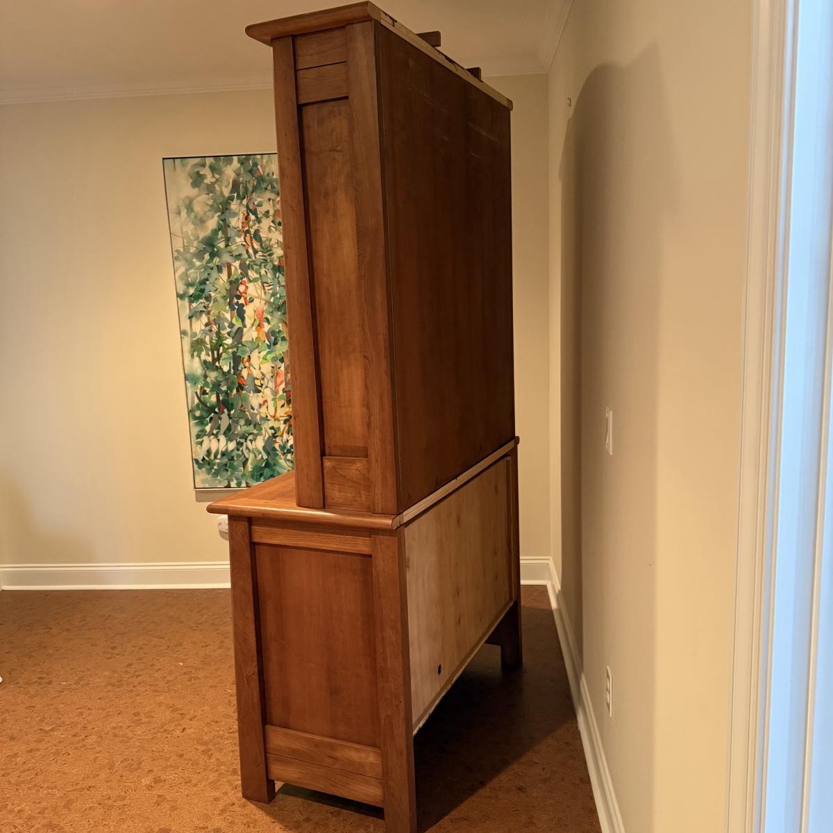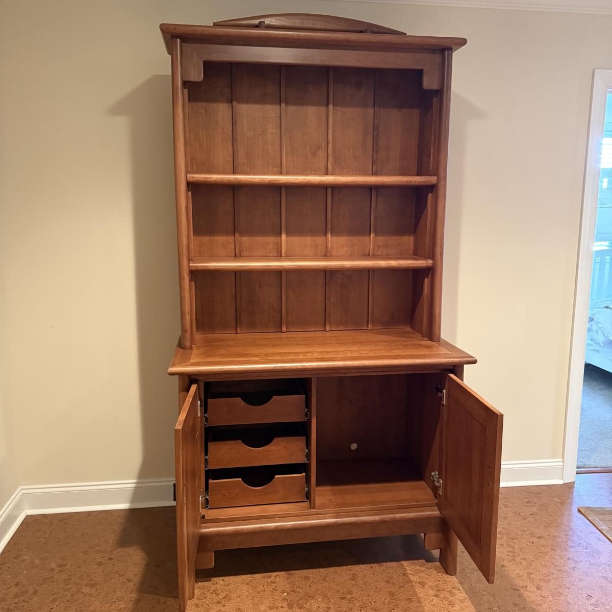 This lot contains a stunning large hutch that does appear to made out of mostly solid wood with a bit of manufactured wood for some filler pieces. This is a very sturdy very heavy piece! It has open shelves on the top. The left side of the cupboard below has three drawers on sliders and the right side of the cupboard is open storage. There is a hole in the back of the right cupboard for cords. There are some scratches on the inside of the left cupboard door from the drawers. This piece measures 45” x 22.5” x 82.5”H. The top shelves do come off the bottom cupboard. This item is located in the basement of this house. Local pick up only. Winning bidder must bring assistance to help move and load this item due to its weight and/or size.